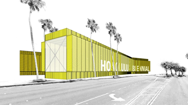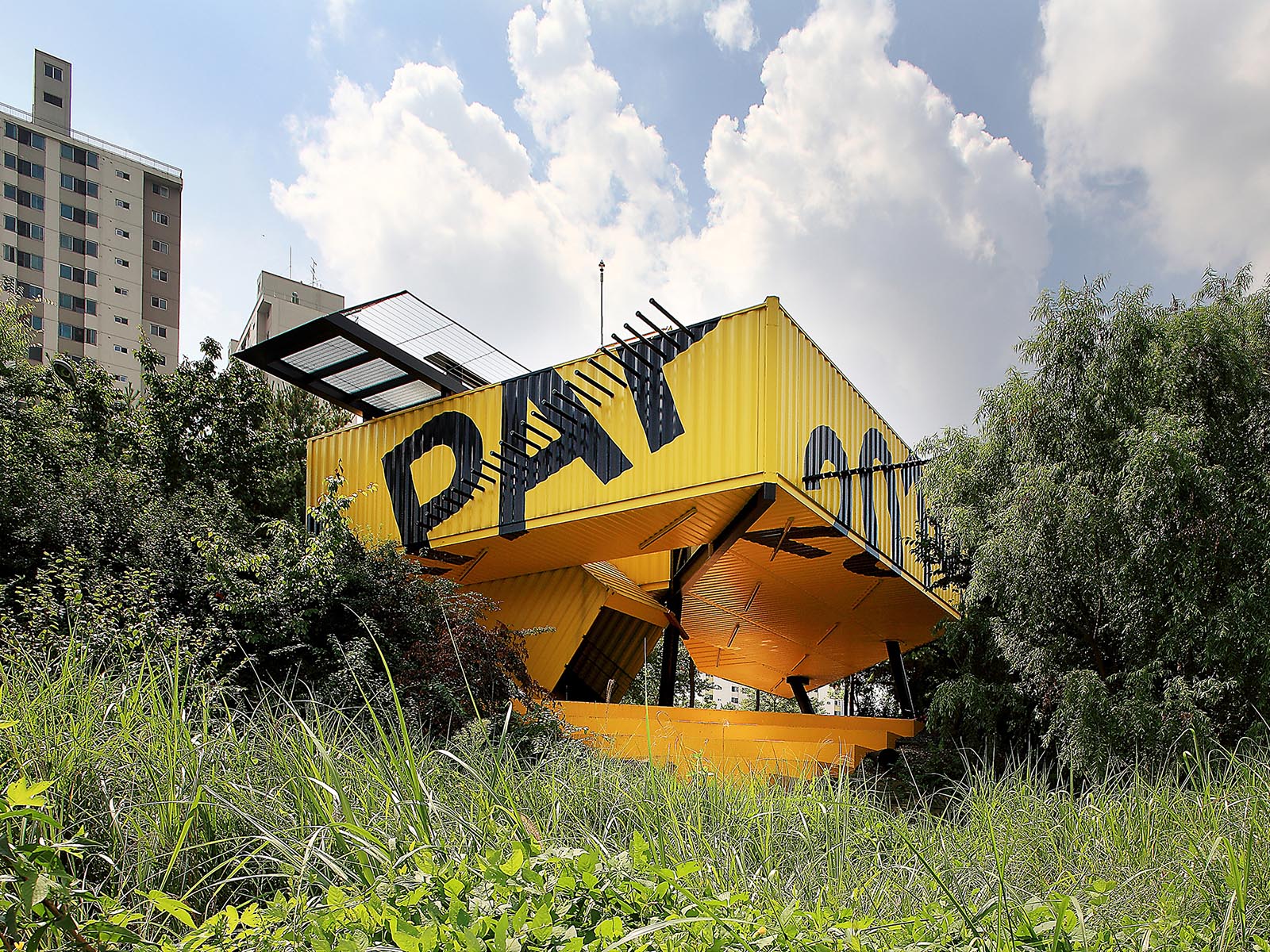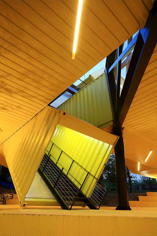 eight shipping containers are skewed to a 45 degree angle and combined in a fishbone pattern generating a large arrow-like volume that hovers three meters over the landscape infiltrating the geography and topography of this riverfront, its trees and slopes, opportunistically.