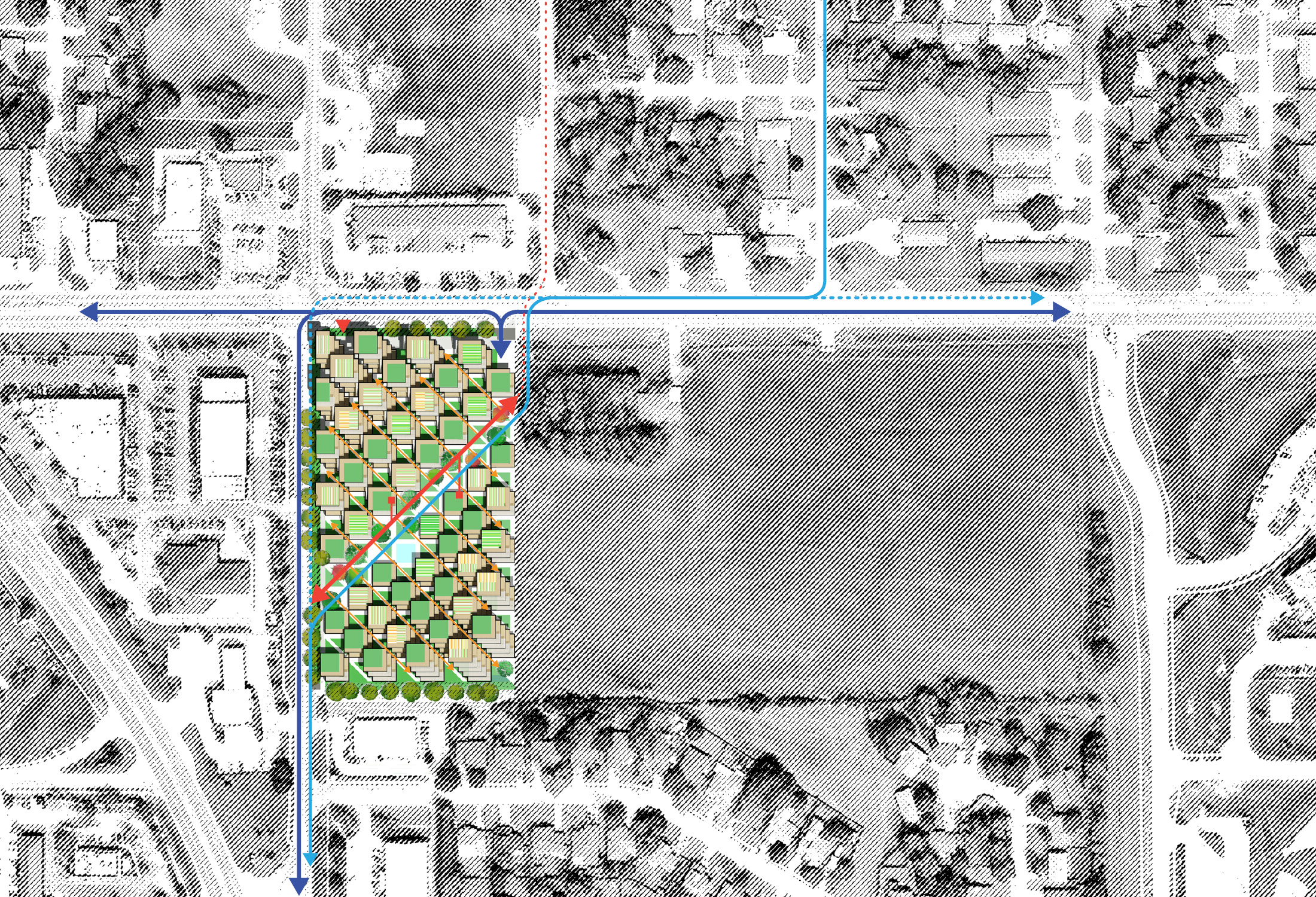 Looking at the landscape and townscape of Bentonville, we see a patchwork: of old and new, traditional and contemporary, commercial and residential—as well as figure and ground, with some blocks filled by buildings and others wide open. At the heart of town, some blocks of the square grid are filled by traditional street-edge and some with more monumental civic buildings; similarly, some blocks are more informally open-air as parking or service space, while other blocks are more formally open as parks and special gathering places like the courtyard square. Across this patchwork grid are weaving diagonals, from large-scale arterial roads to delicate bike and hike paths. We see the same balance of figure and ground, of a patchwork grid and weaving diagonals, at Arkansas Crossing, which learns from the urban fabric of Bentonville and applies the same pattern, at a finer grain and rhythm.