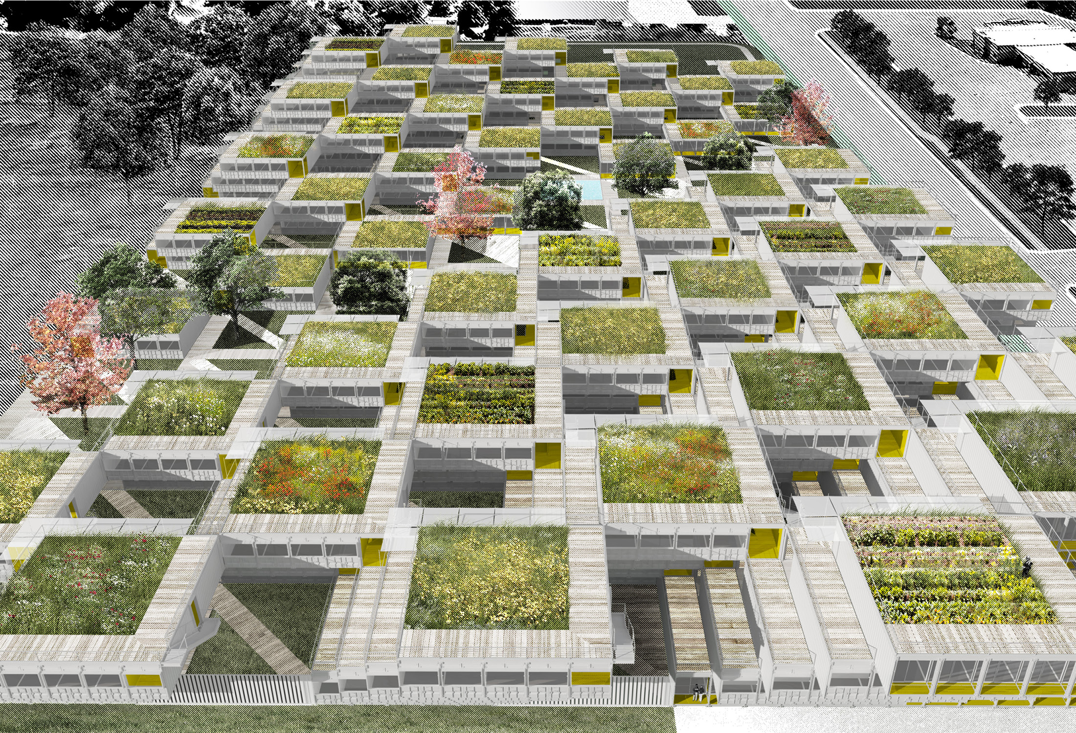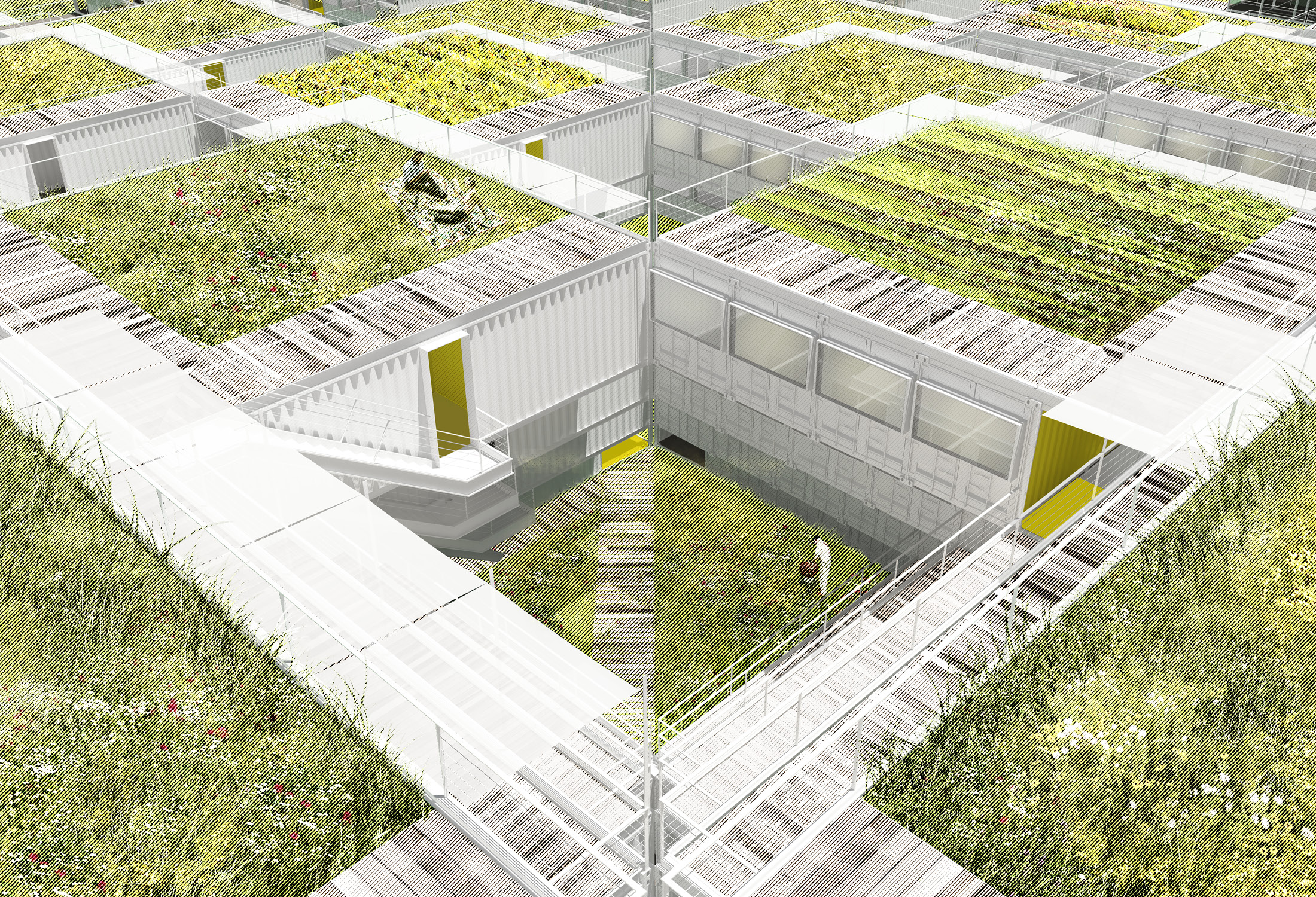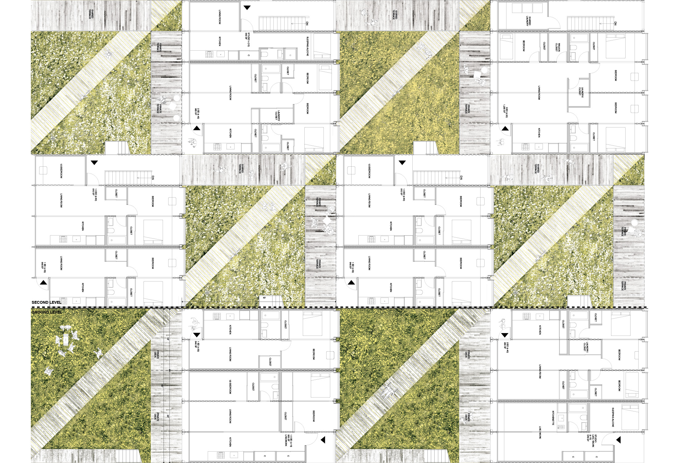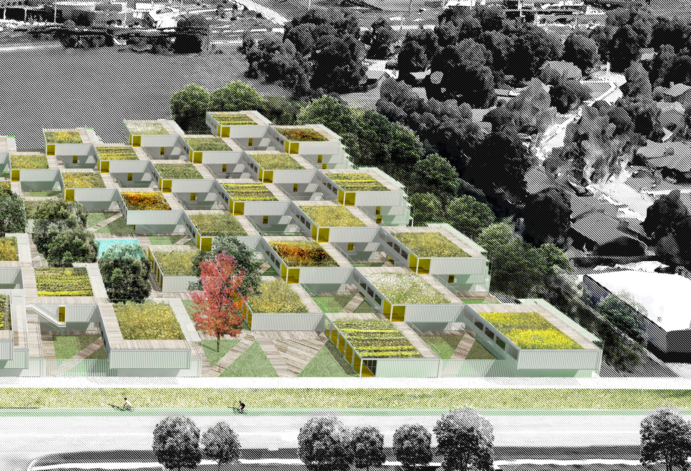 The forty-foot-square blocks are constructed out of a square array of five ISO-standard steel shipping containers, stacked and stepped to form the townhouse blocks—765 containers in total. This represents a sustainable upcycling of resources that, thanks to broad interior vistas, choreographed openings, and refined finishes, can be brought to a high level of domestic comfort and delight. We envision a community woven and stitched together through pathways, courtyards, overlooks, planted rooftops, and private terraces. It’s called Arkansas Crossroads—which along with Arkansas Star is one of the major quilting block patterns historic to this part of the country—in which a stable square grid is enlivened by a crisscross of diagonals, creating a peaceful but dynamic pattern for daily life.