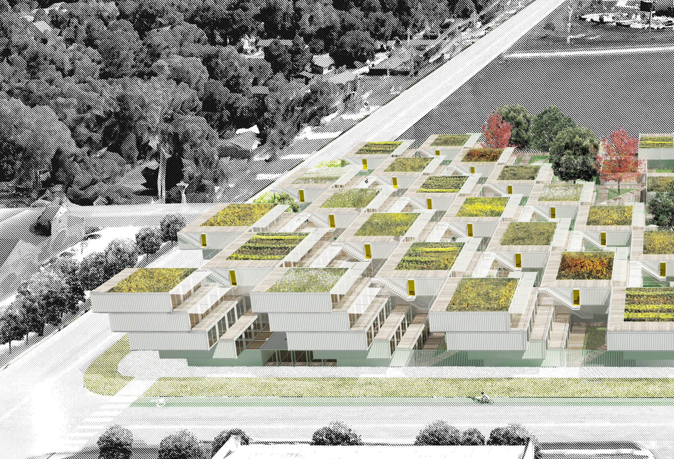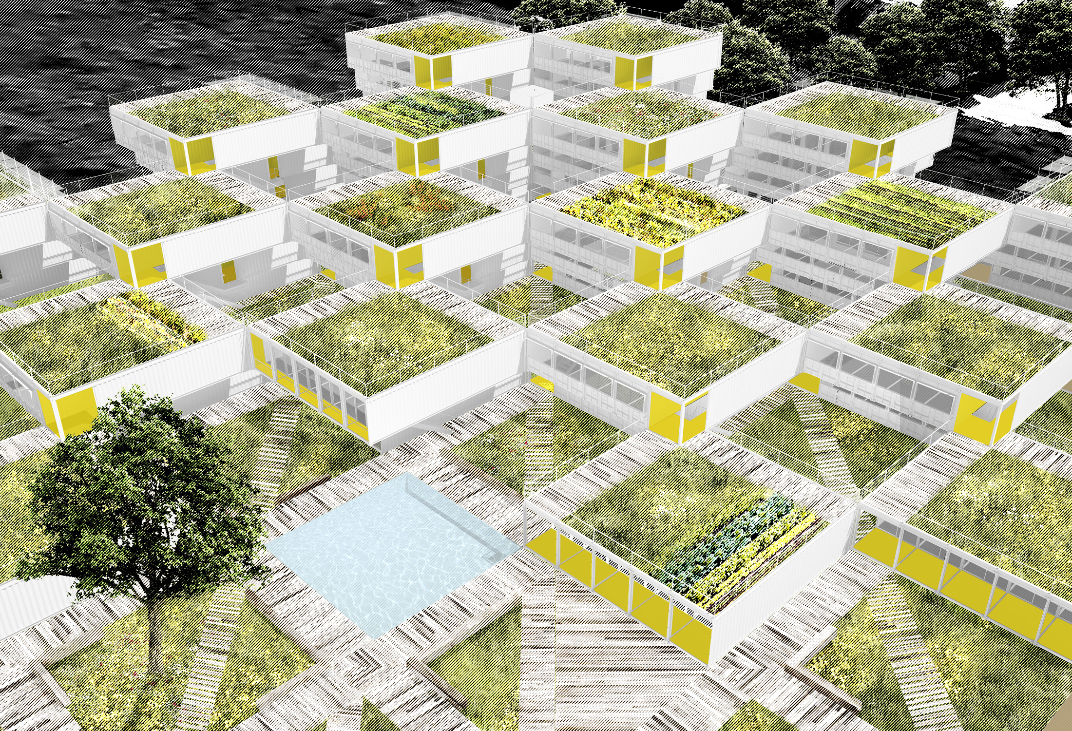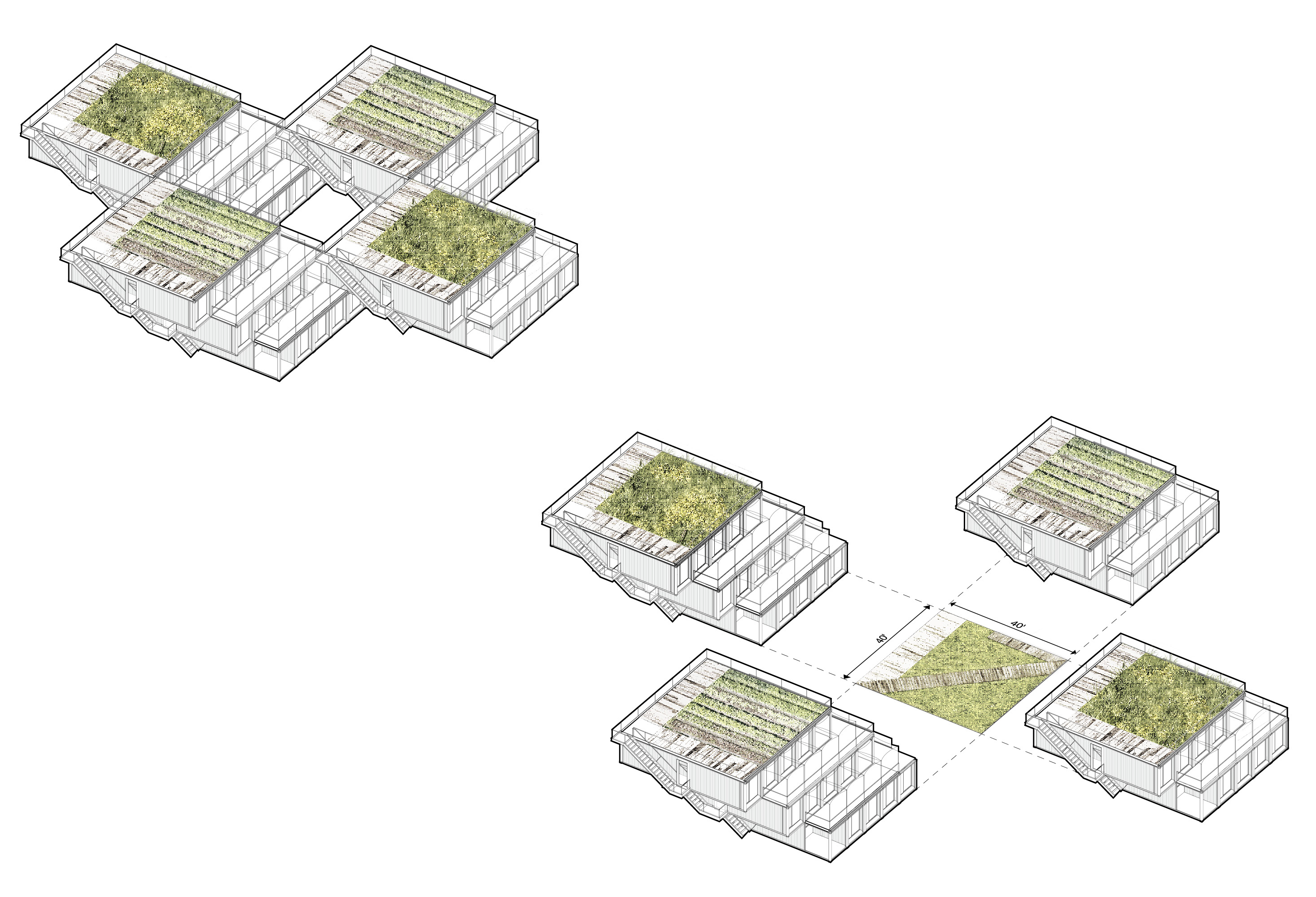 The forty-foot-square blocks are constructed out of a square array of five ISO-standard steel shipping containers, stacked and stepped to form the townhouse blocks—765 containers in total. This represents a sustainable upcycling of resources that, thanks to broad interior vistas, choreographed openings, and refined finishes, can be brought to a high level of domestic comfort and delight. We envision a community woven and stitched together through pathways, courtyards, overlooks, planted rooftops, and private terraces. It’s called Arkansas Crossroads—which along with Arkansas Star is one of the major quilting block patterns historic to this part of the country—in which a stable square grid is enlivened by a crisscross of diagonals, creating a peaceful but dynamic pattern for daily life.