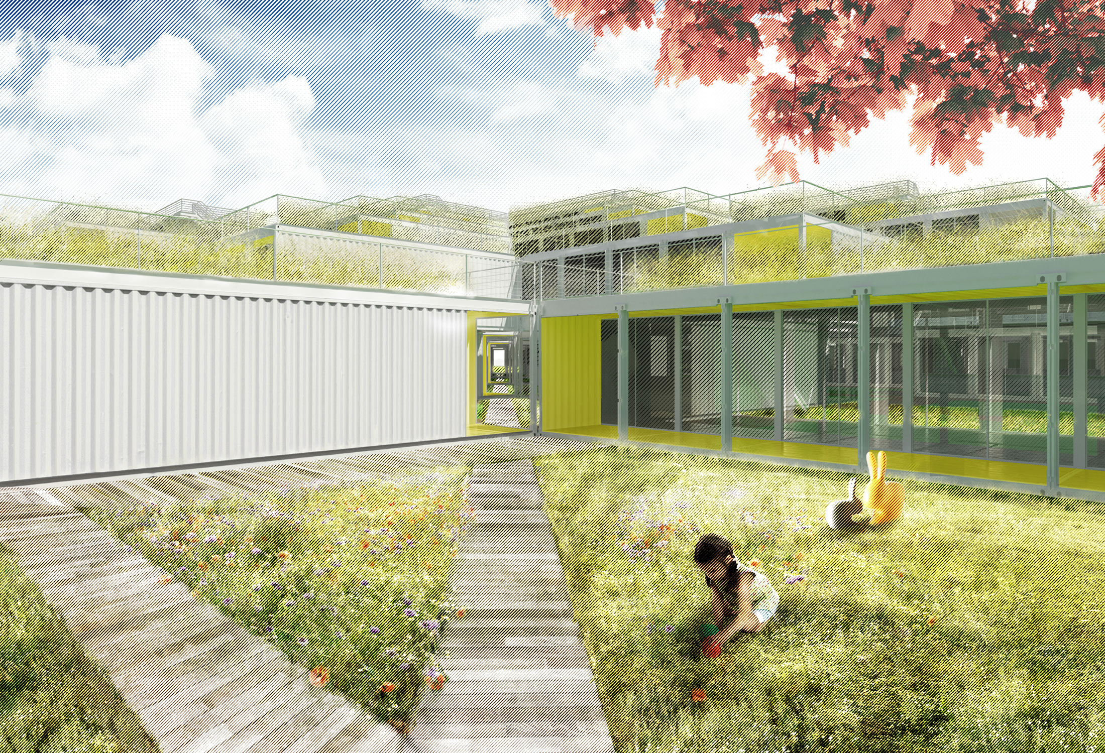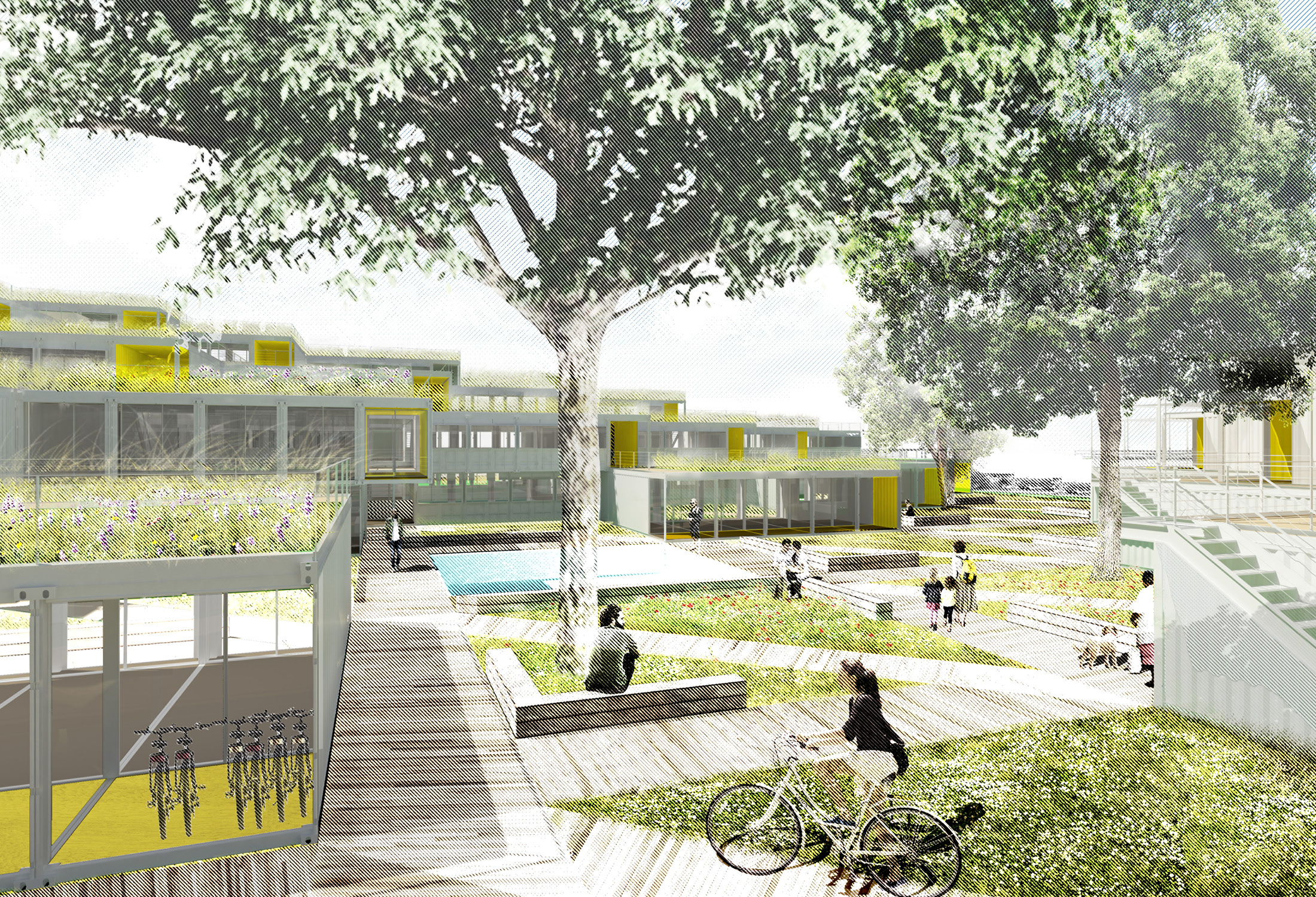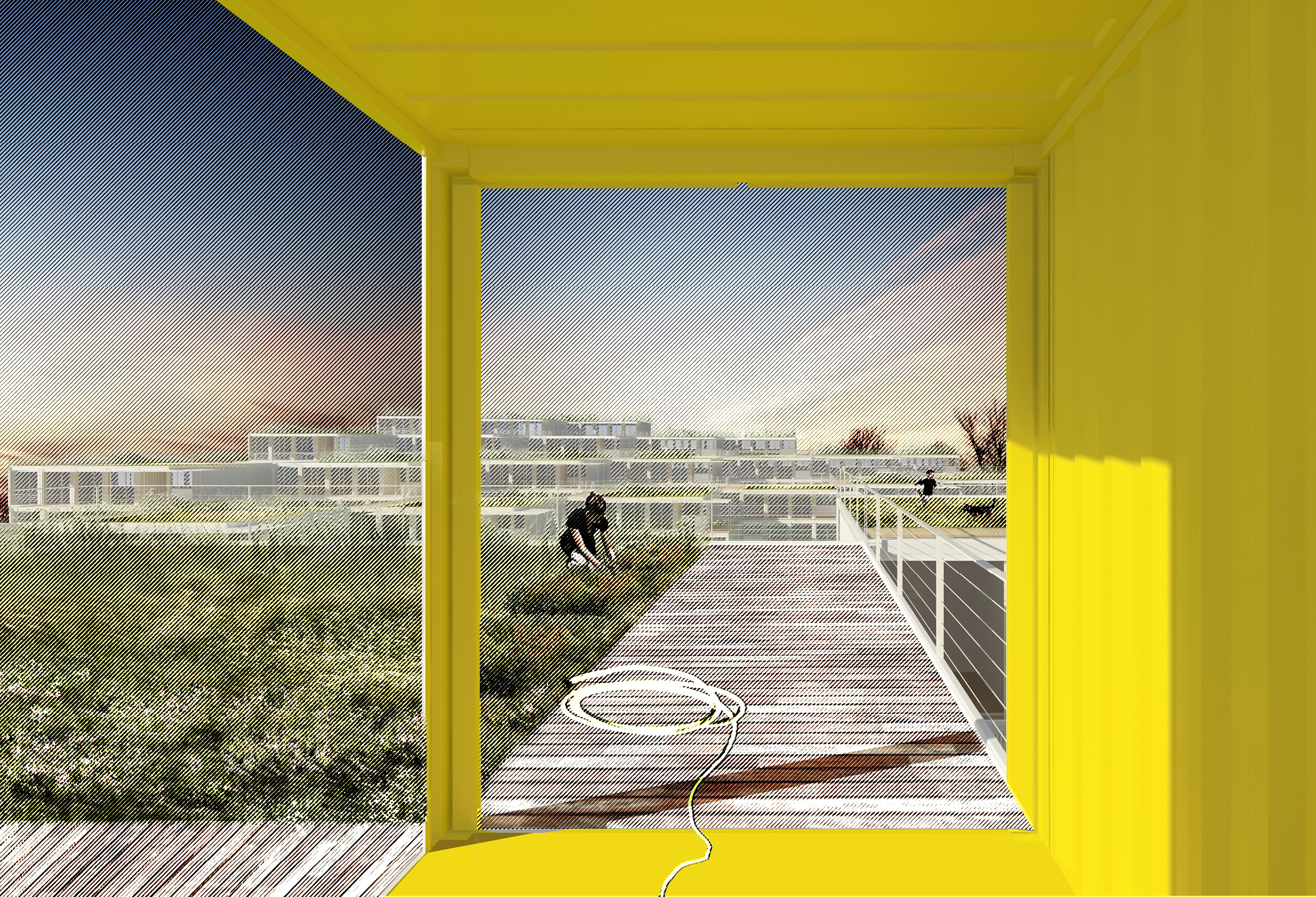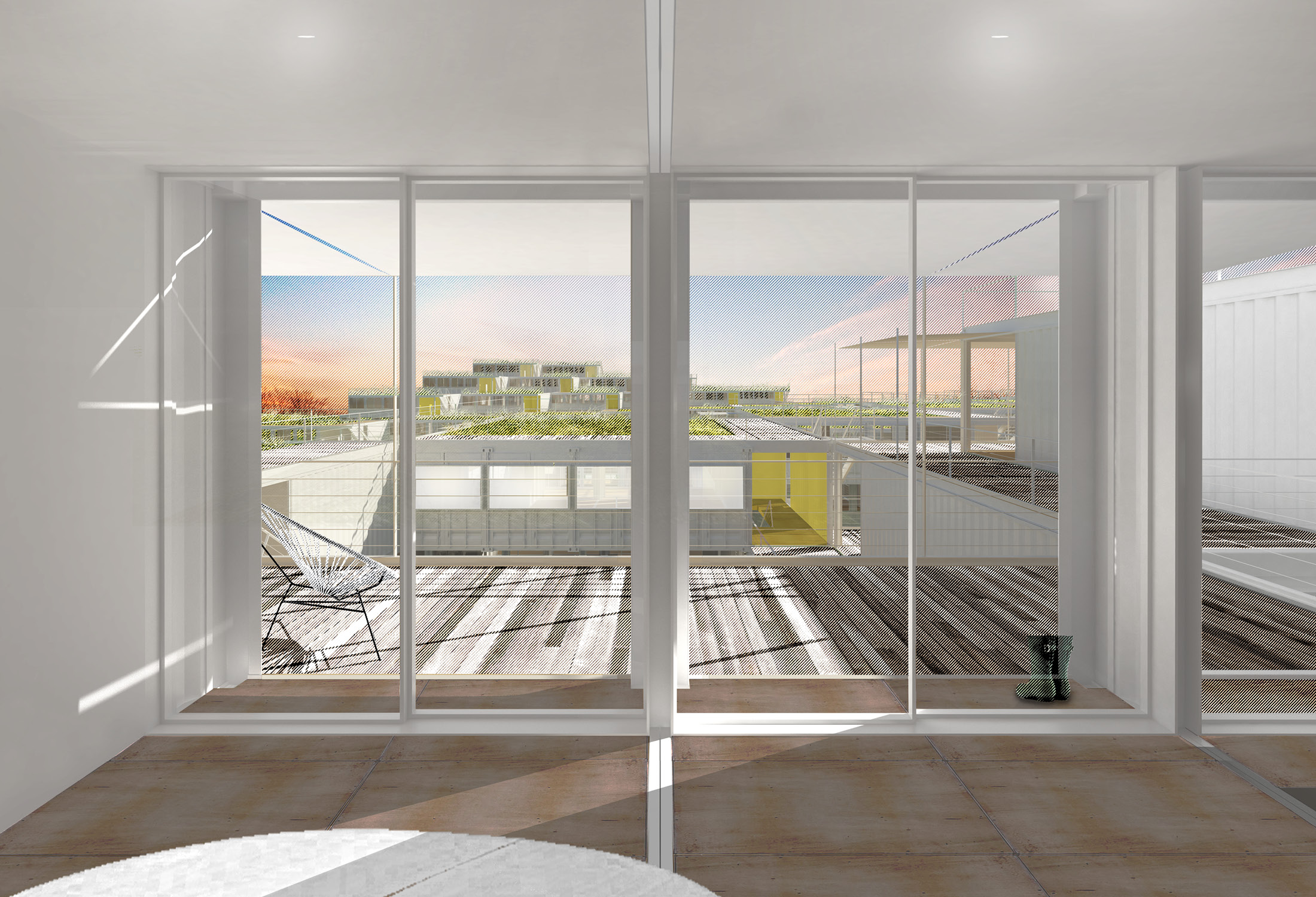 The forty-foot-square blocks are constructed out of a square array of five ISO-standard steel shipping containers, stacked and stepped to form the townhouse blocks—765 containers in total. This represents a sustainable upcycling of resources that, thanks to broad interior vistas, choreographed openings, and refined finishes, can be brought to a high level of domestic comfort and delight. We envision a community woven and stitched together through pathways, courtyards, overlooks, planted rooftops, and private terraces. It’s called Arkansas Crossroads—which along with Arkansas Star is one of the major quilting block patterns historic to this part of the country—in which a stable square grid is enlivened by a crisscross of diagonals, creating a peaceful but dynamic pattern for daily life.