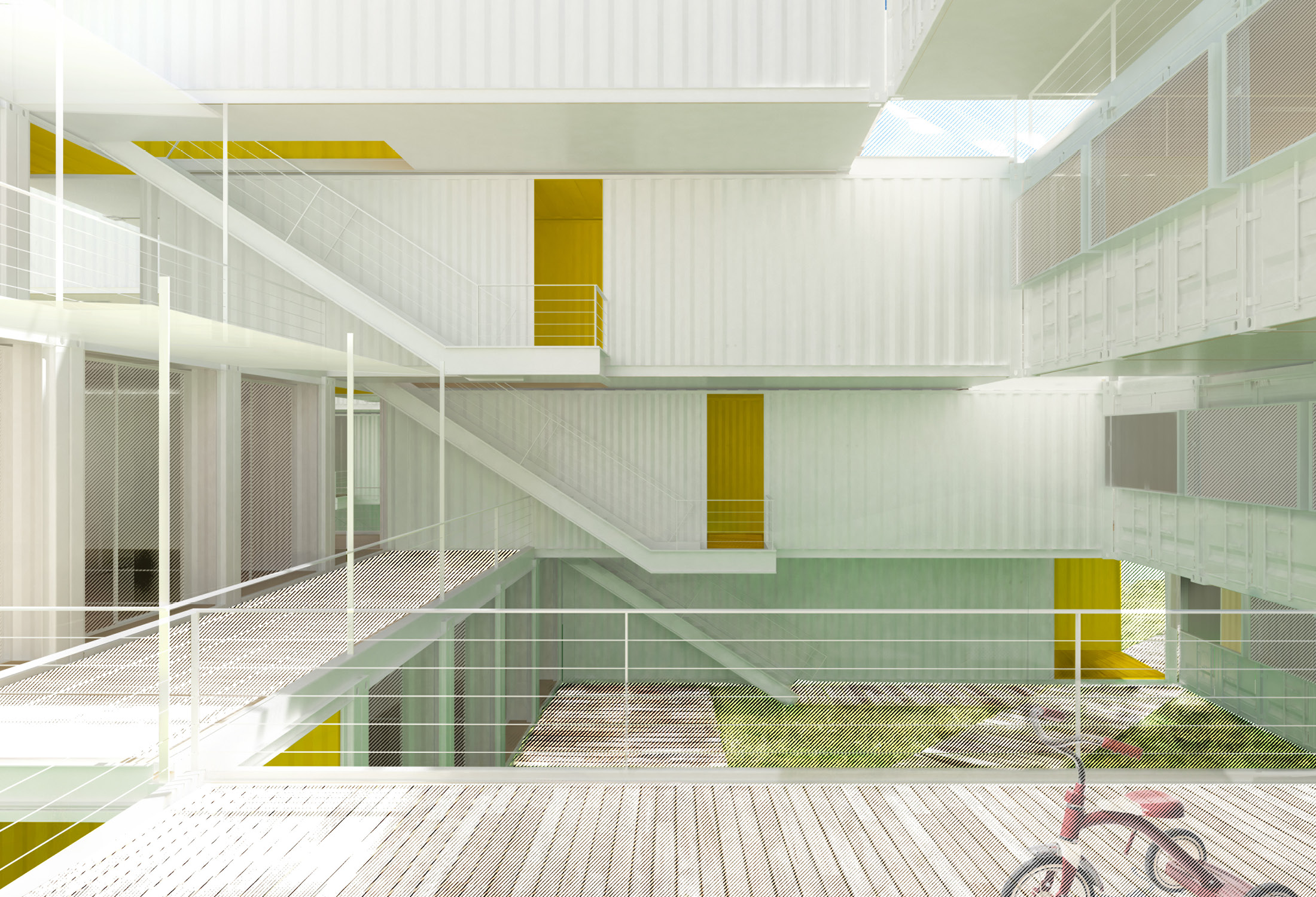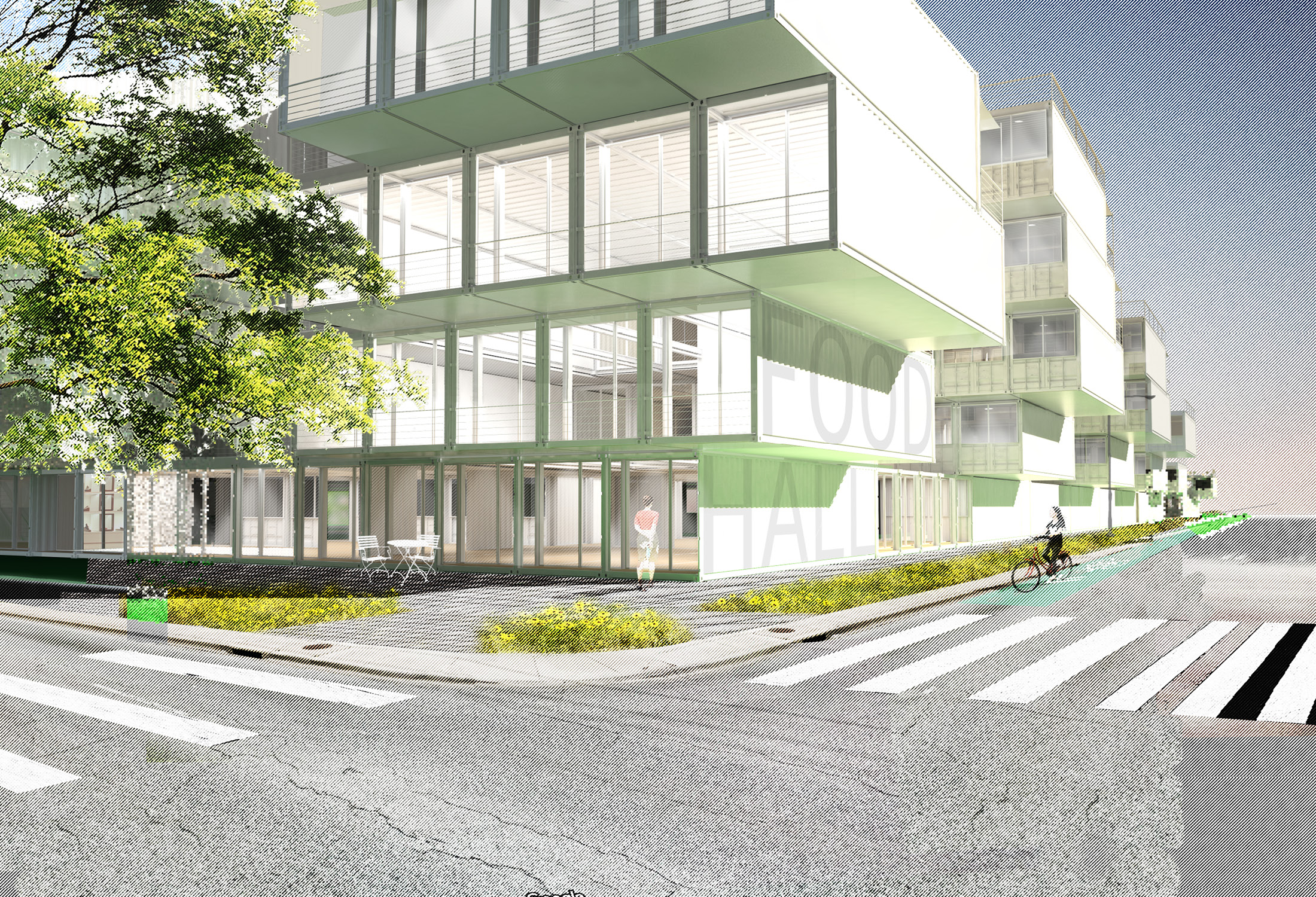 The use of the shipping container enables a measure of off-site prefabrication and modes of construction. The regularizing effect of the 8-foot bay, east-to-west, introduces efficiencies of buildings systems and services. The modularity of Arkansas Crossing—assemblies of five shipping containers into a forty-foot square module that is then stacked and arrayed—affords a high degree of adaptability (for example adapting a 2 bedroom and studio module into a 3+bedroom module) over the lifetime of the building. Similarly, the configuration of retail, workspace, or other commercial applications along the street edge, or the configuration of amenity and community spaces along the interior Crossroads commons, can similarly adapt responsively to a growing and changing community.
