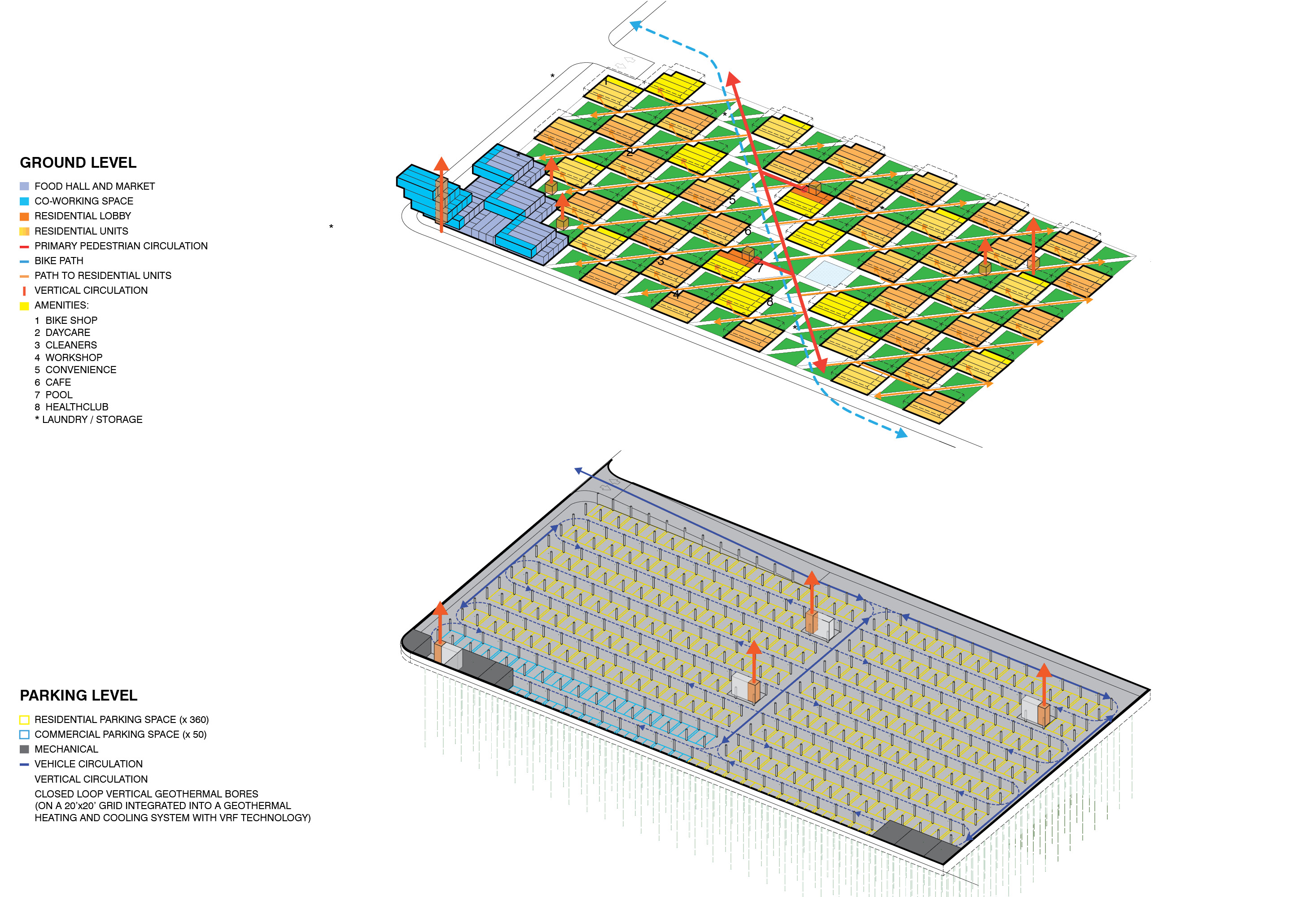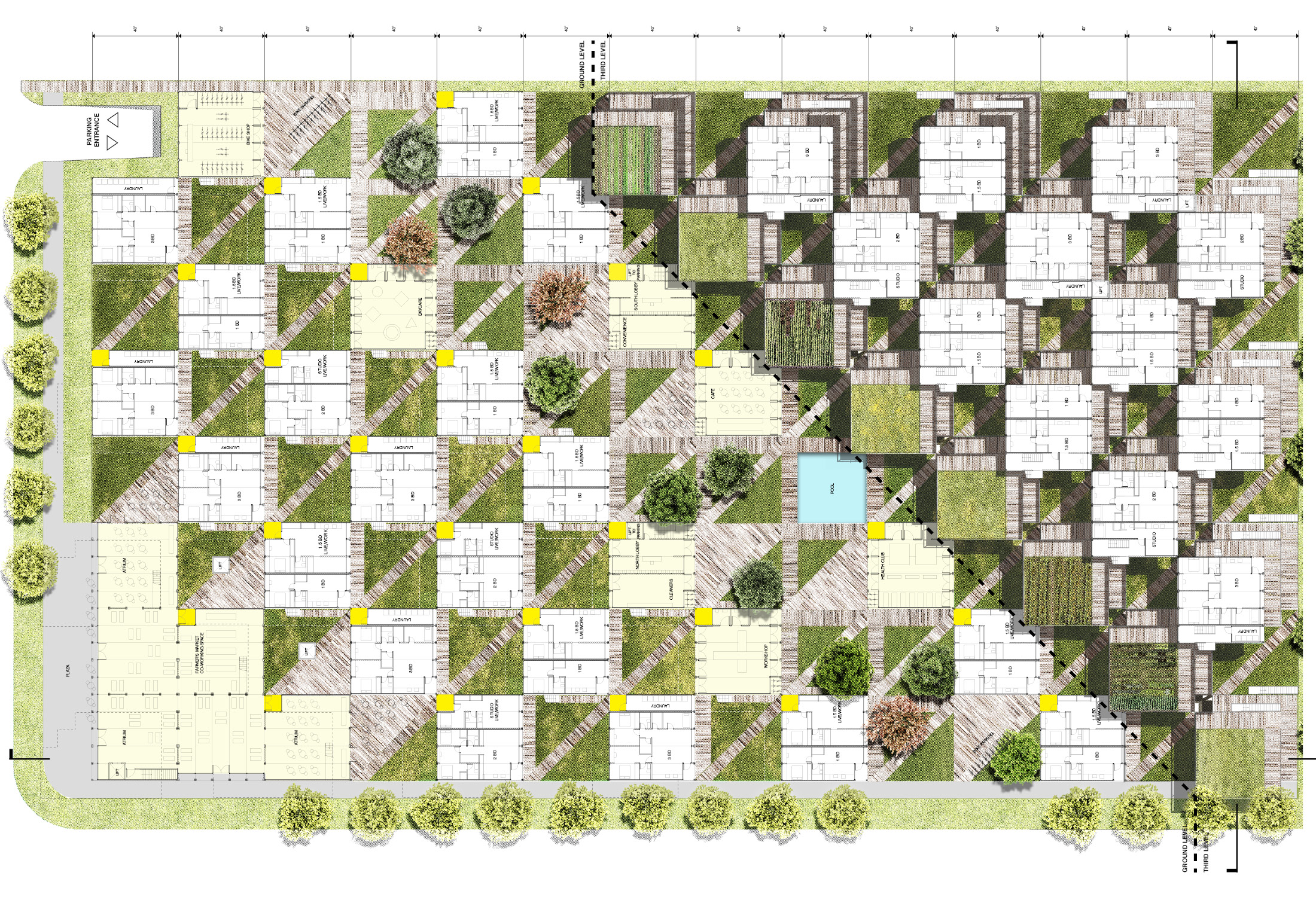 For our field-like site, we propose a field of homes growing gradually out of the land, stepping up to its highest five-story point at the most heavily-trafficked corner at SE 14th Street and SW A Street, and rising more gently to the same height at its opposite southeast corner, near existing single-family homes. Between these two corners, a valley is defined by a grassy grade-level commons or concourse that we are calling the Crossroads: an acre of greensward, crisscrossed by pathways and lined by mixed-use live/work, amenities and plantings that continue up into a green-roof landscape. The site is organized into a checkerboard pattern of some fifty townhouse-scaled blocks (each accommodating simplex apartments) alternating with courtyards. This arrangement ensures a spectrum of public and private outdoor space for residents, maximizes cross-ventilation and views, as well as creating some forty neighborly courtyards within the larger scale of the field. These townhouse blocks are terraced: stepped to the north and west, optimized for shade, providing private porches, high-visibility sheltered circulation space, and making of the field’s northwest corner, a retail area, a prow-like landmark at the major commercial intersection.