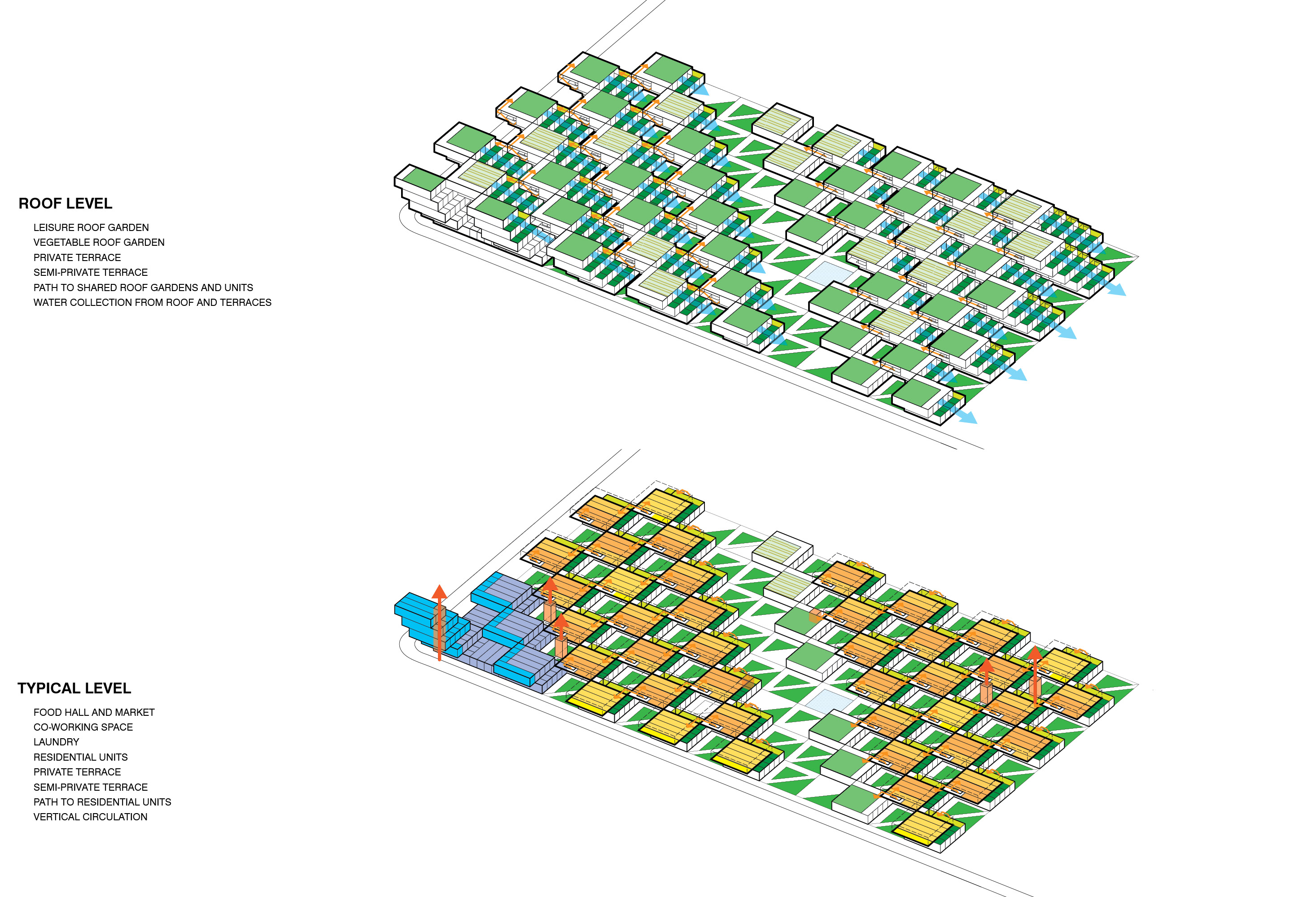 Generous Common Spaces are woven throughout the site, at multiple scales from a sweeping central Crossroads common green, to Courtyards overlooked by private terraces, to sheltered outdoor staircases and entryways, to shared green roof community gardens.