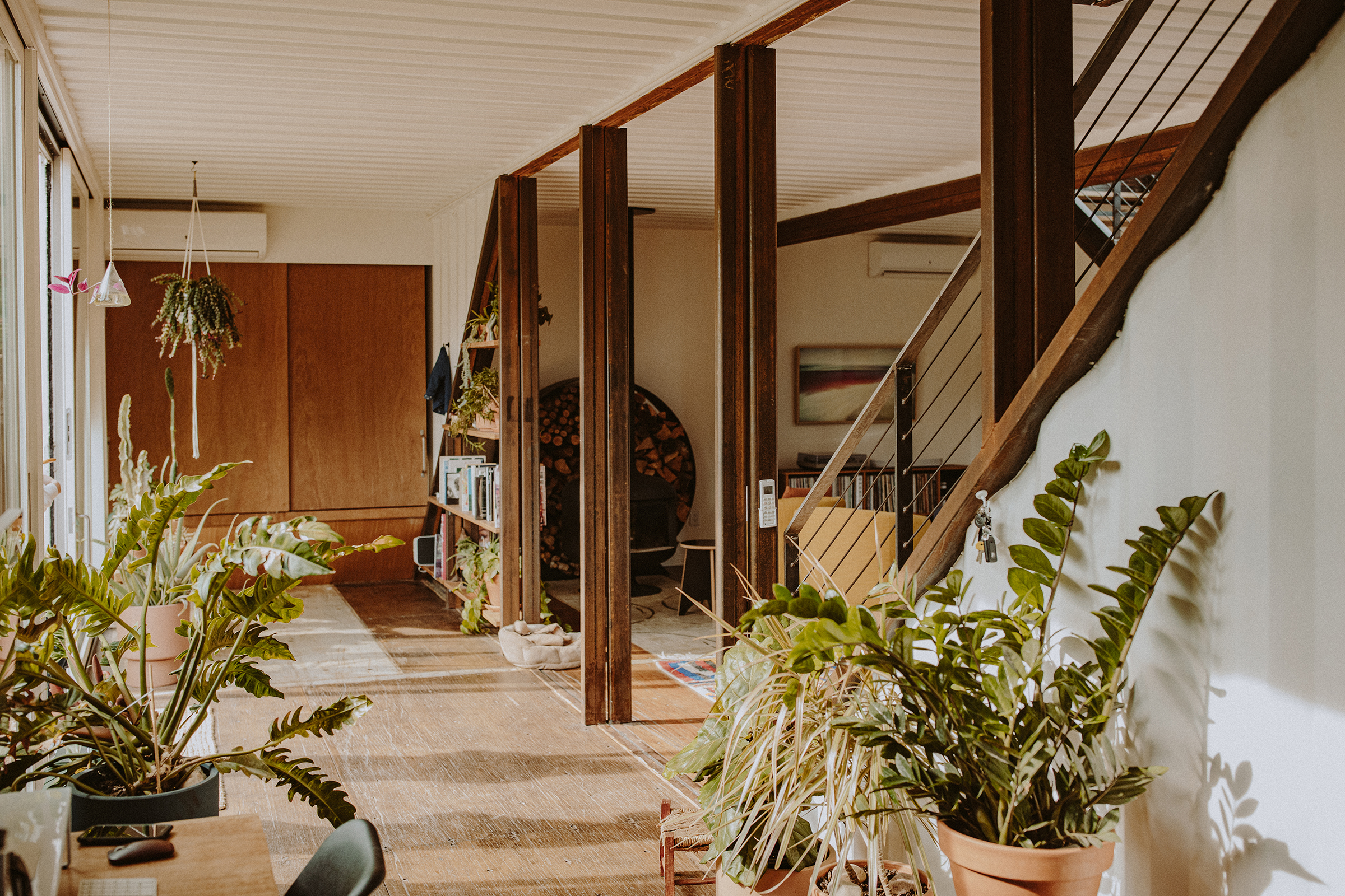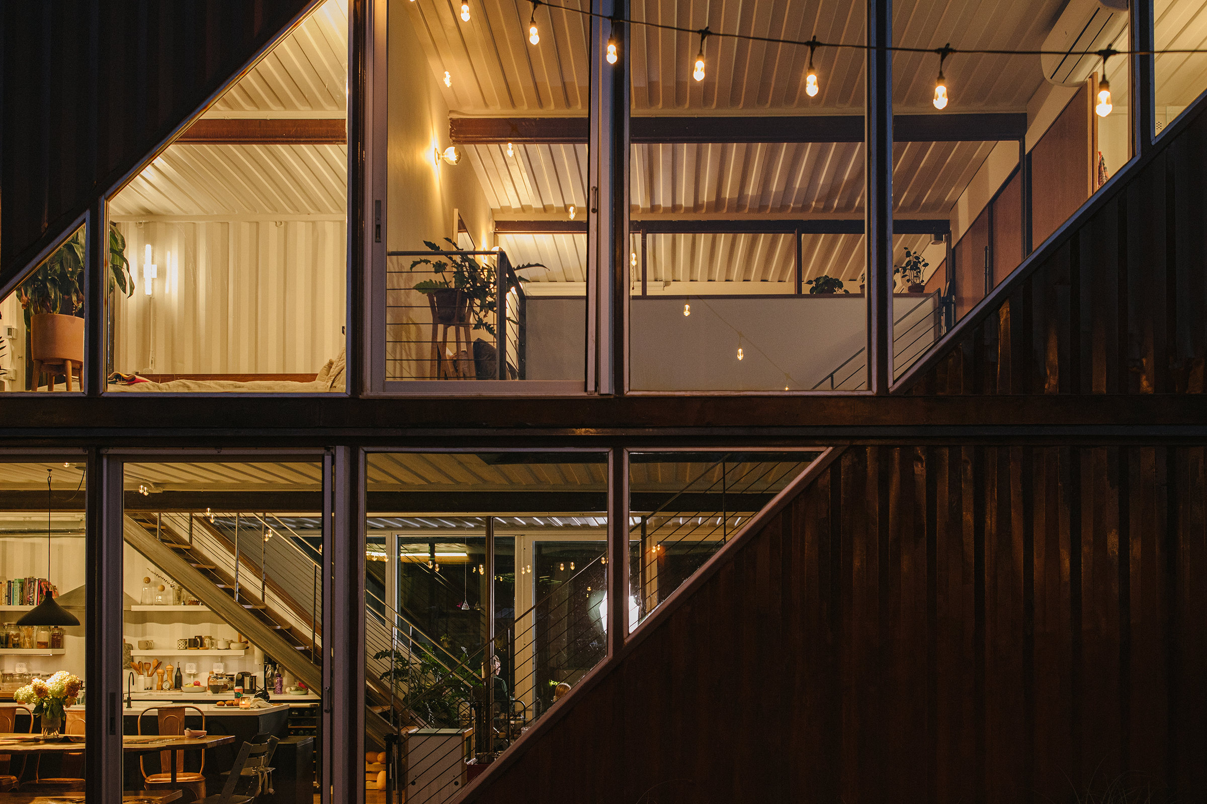 the house is composed of six 40-foot shipping containers, stacked on two levels to create a clean and rational volume. Large glass openings carve into the container structure to bring abundant natural light, cross-ventilation, and visual continuity between interior and exterior spaces. Expansive decks extend the living areas toward both front and back yards, while an exterior stair connects the ground level to a planted green roof, reinforcing the relationship between architecture and landscape