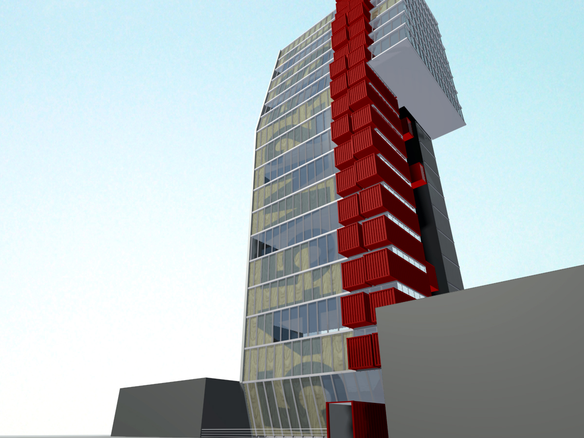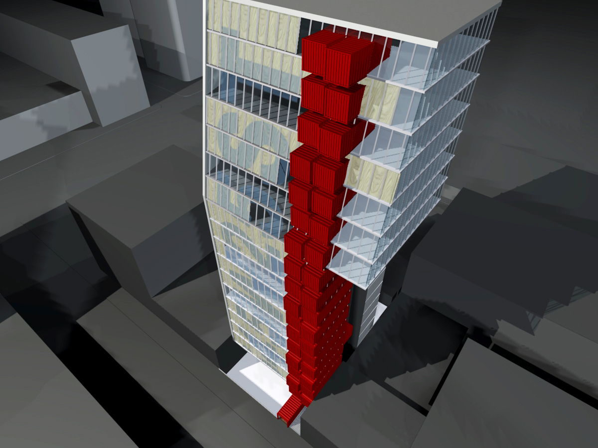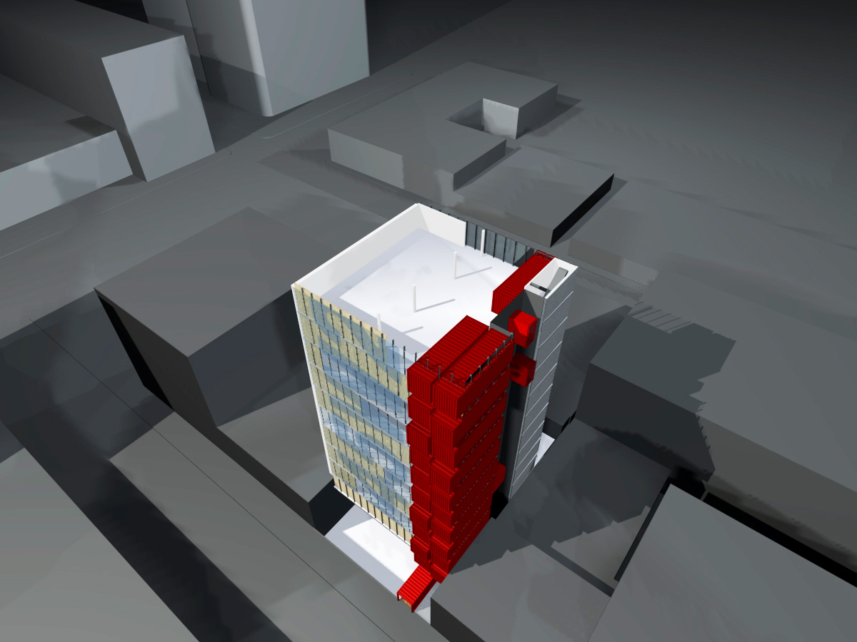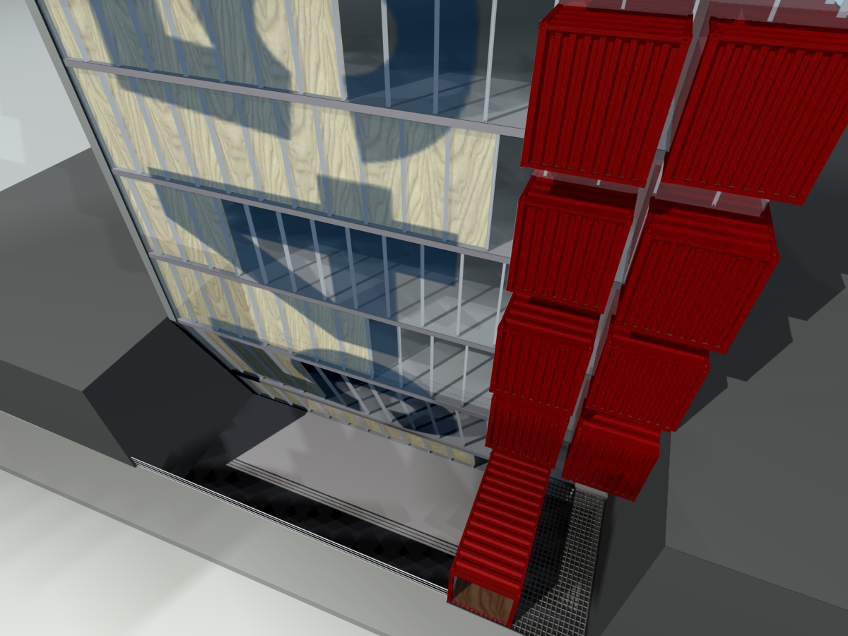 Recycled shipping containers are inserted into this basic concrete frame along one edge of both front and back elevations. These containers are retrofitted off site to house bathrooms, mechanical and storage rooms. The rest of the space on each floor is left undivided to offer open plan flexibility to all galleries.