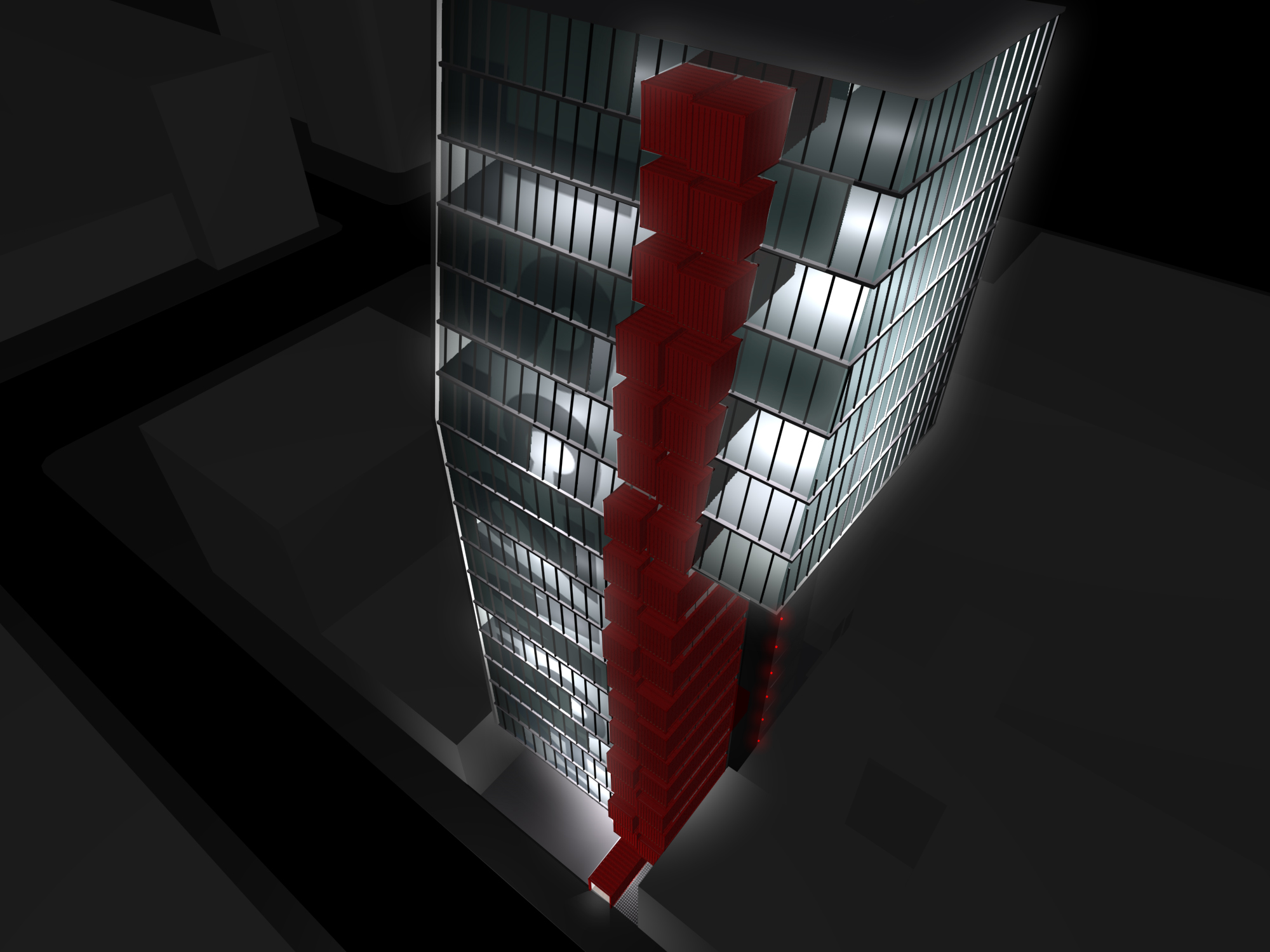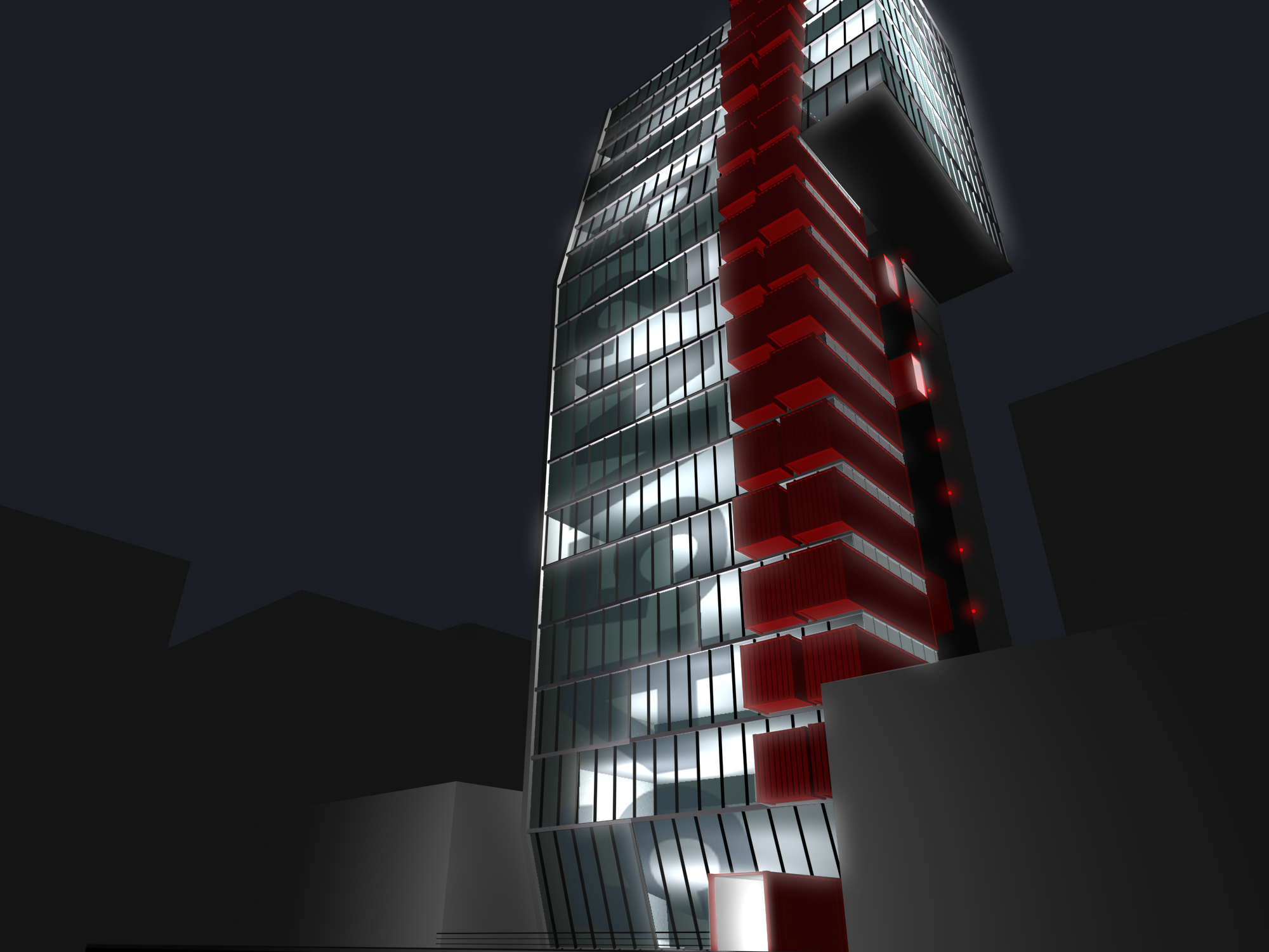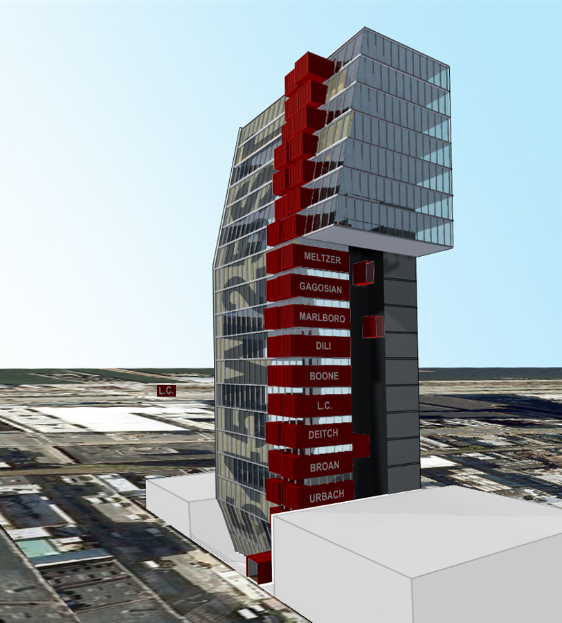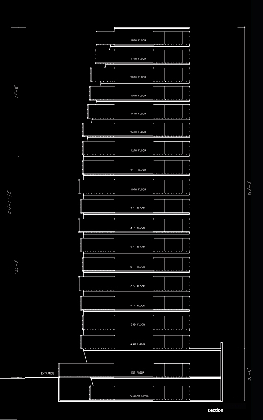 Passenger elevators are exposed along the east elevation. An inward bend in the front elevation at the base of the tower penetrates into a front moat to bring natural light into the basement gallery. A single side cantilever starts at the 12th floor to expand the top floors that recede along the front elevation according to city setback regulations.