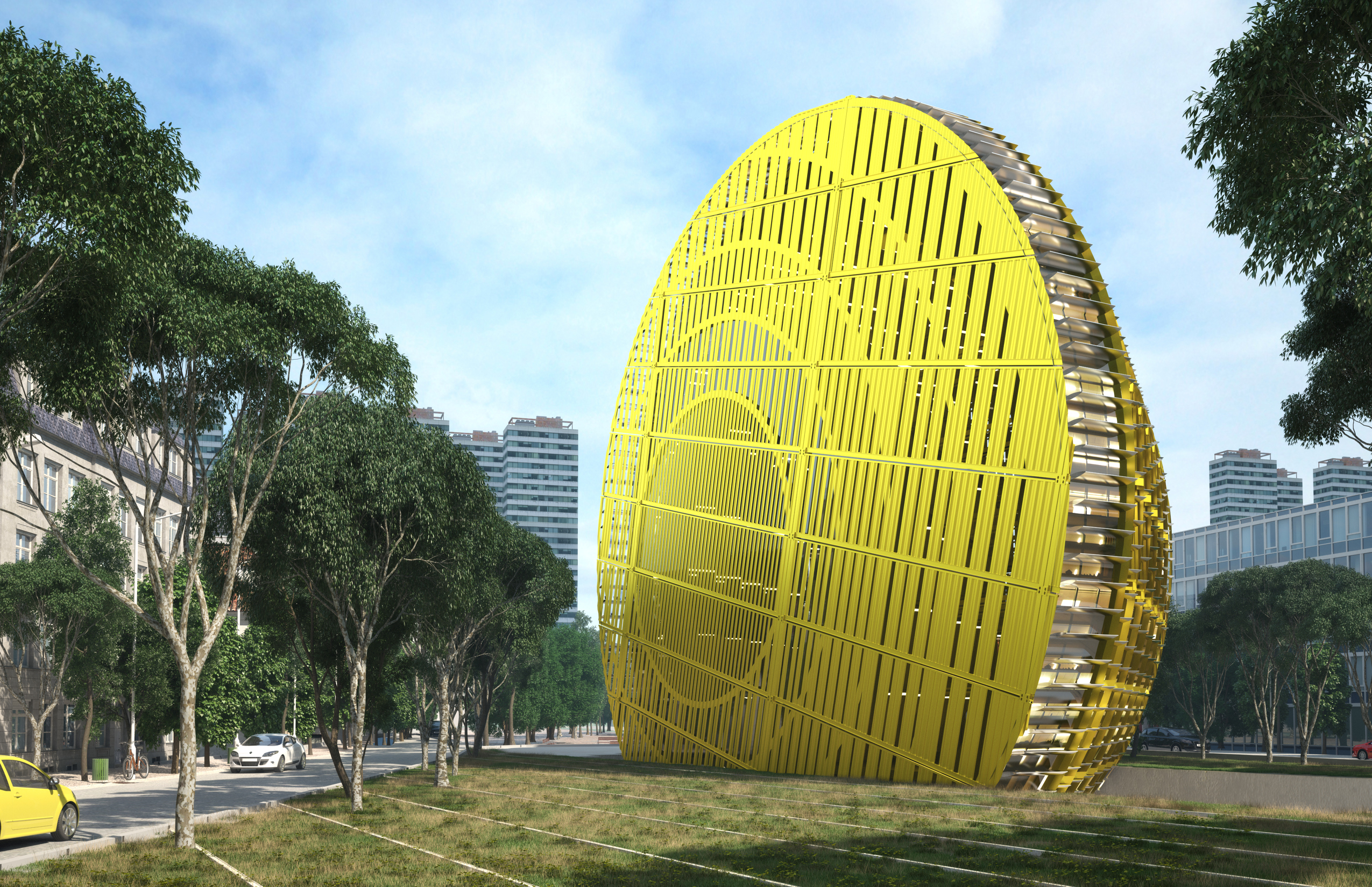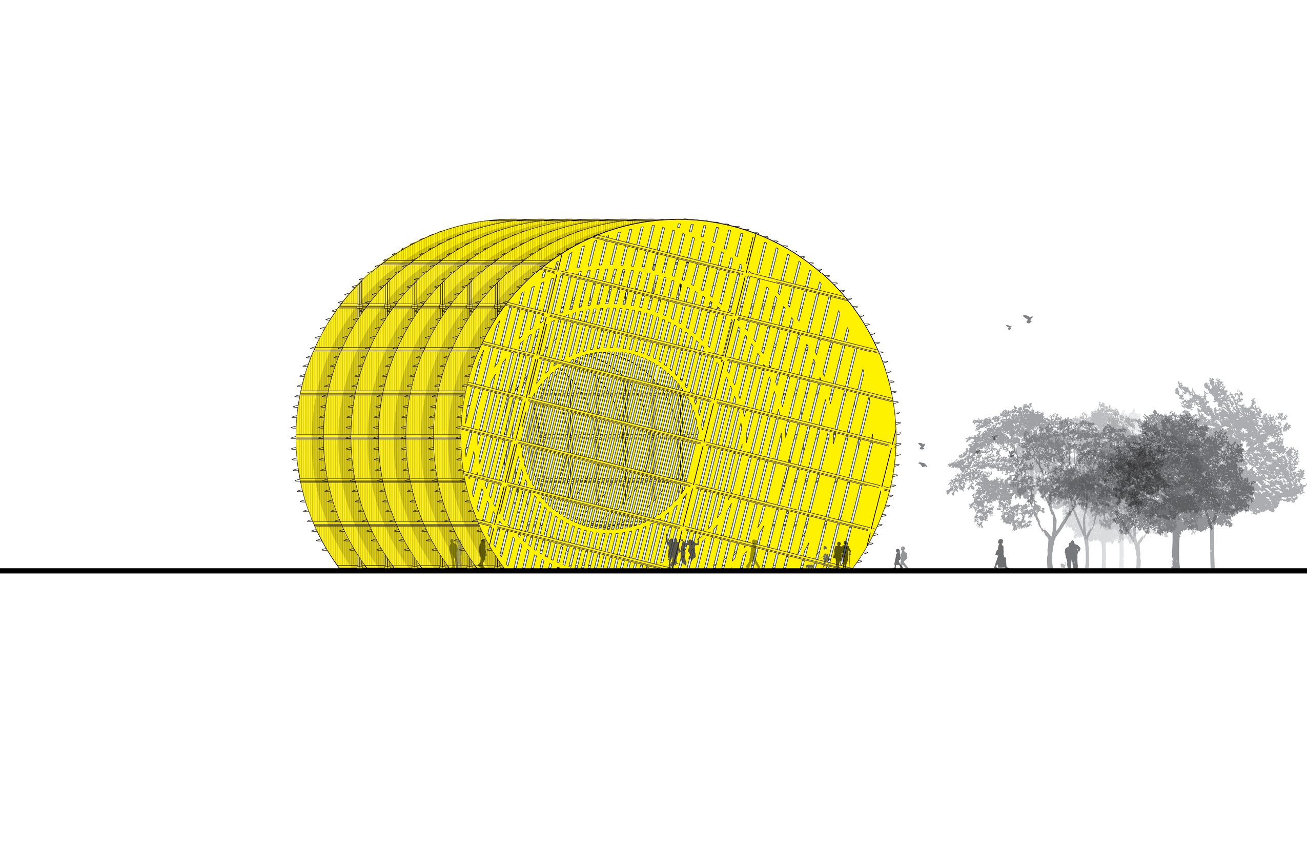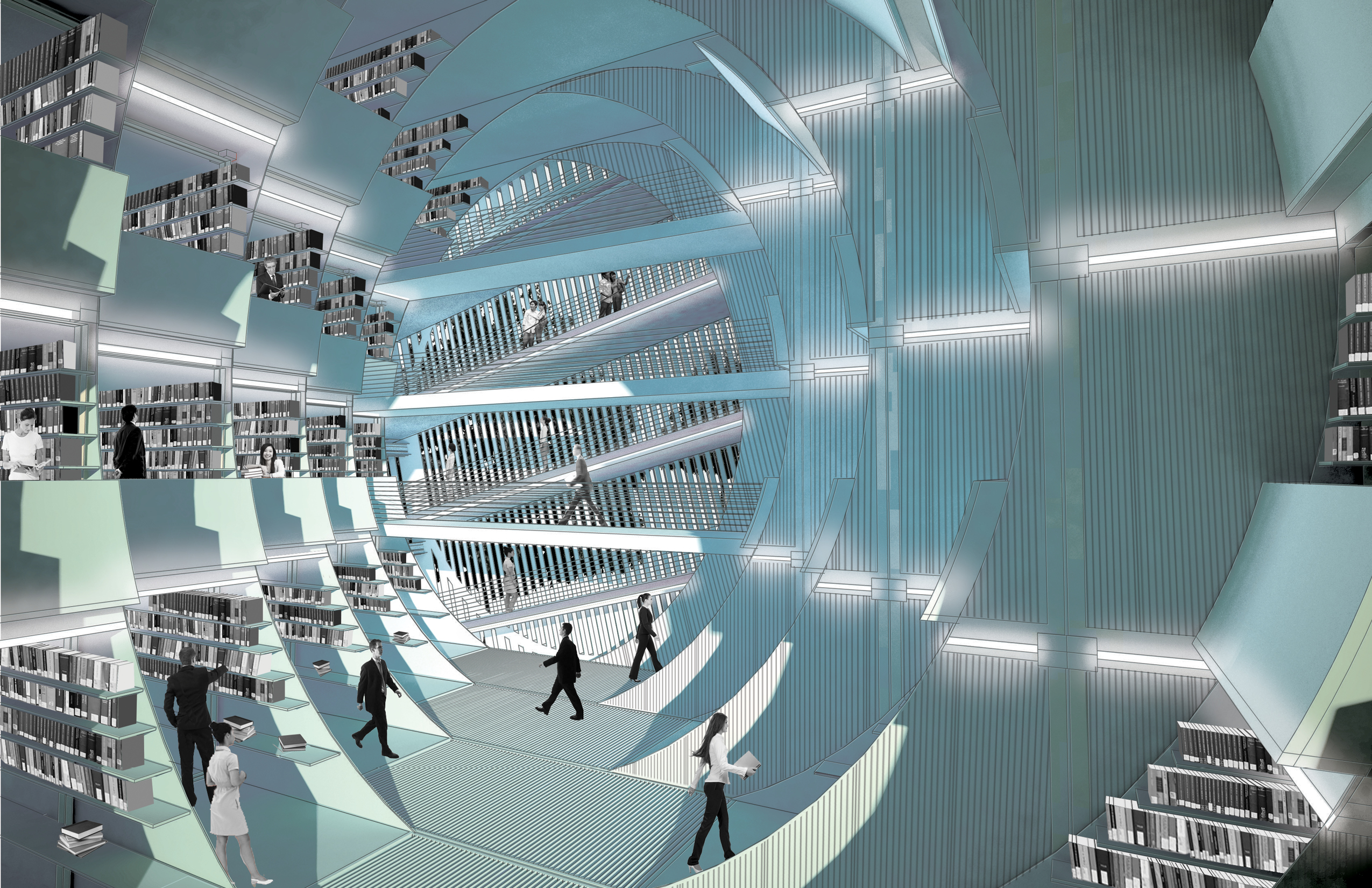 We feel that the combination of technology and beauty captured by this approach, and by the energetic yet harmonious rounded form, is especially appropriate to a vision of the contemporary library, that combines timeless serenity and responsibility, with timely high-tech interfaces and versatile open interiors--the best of the past and the best, so far, of the future.