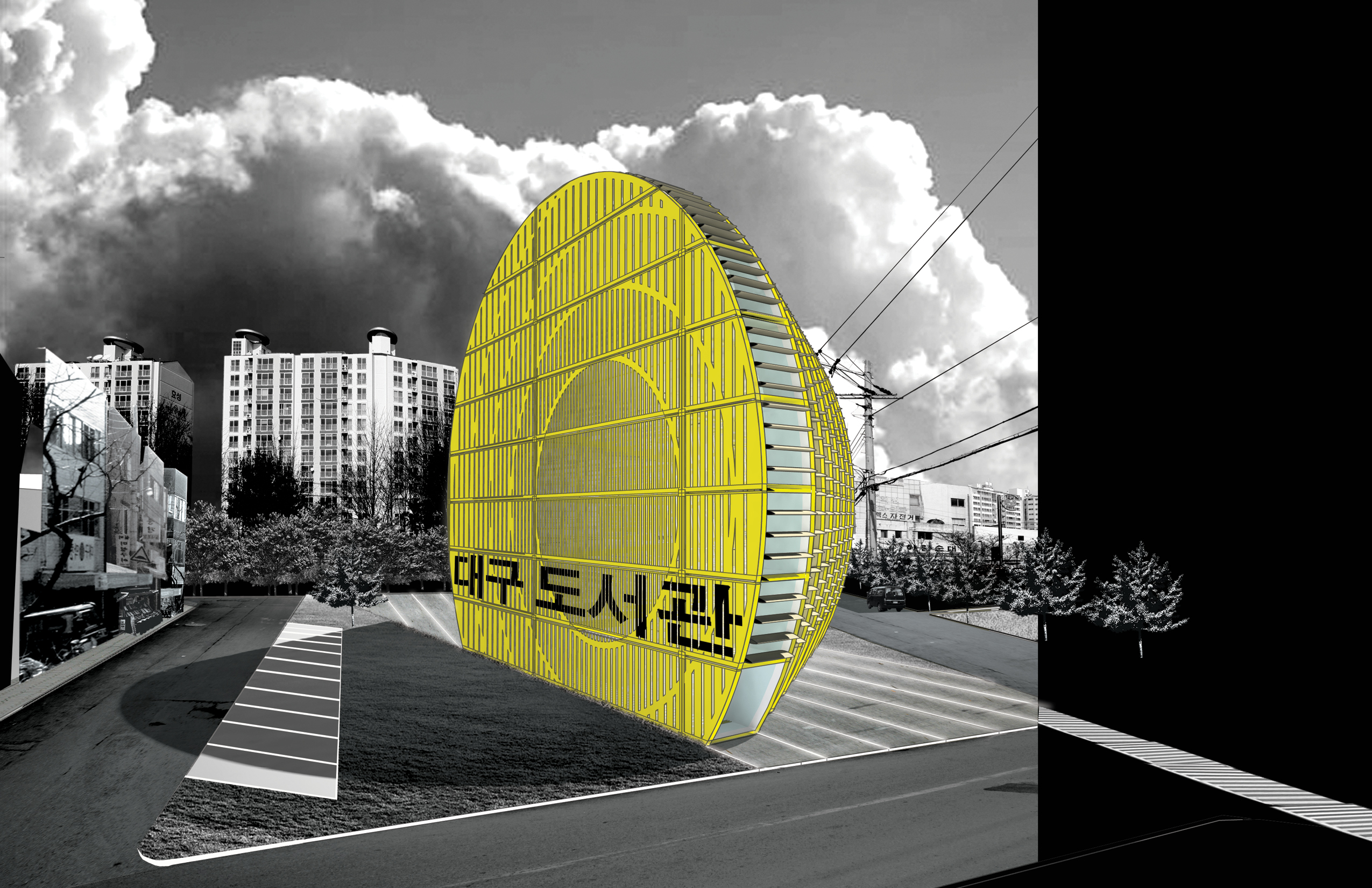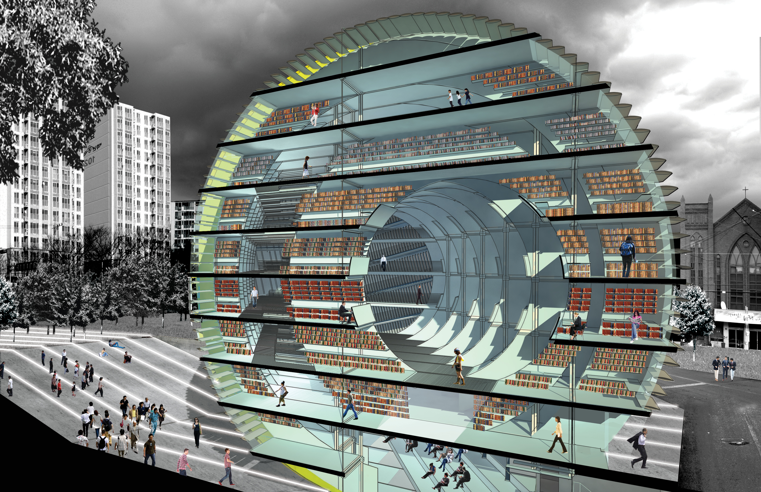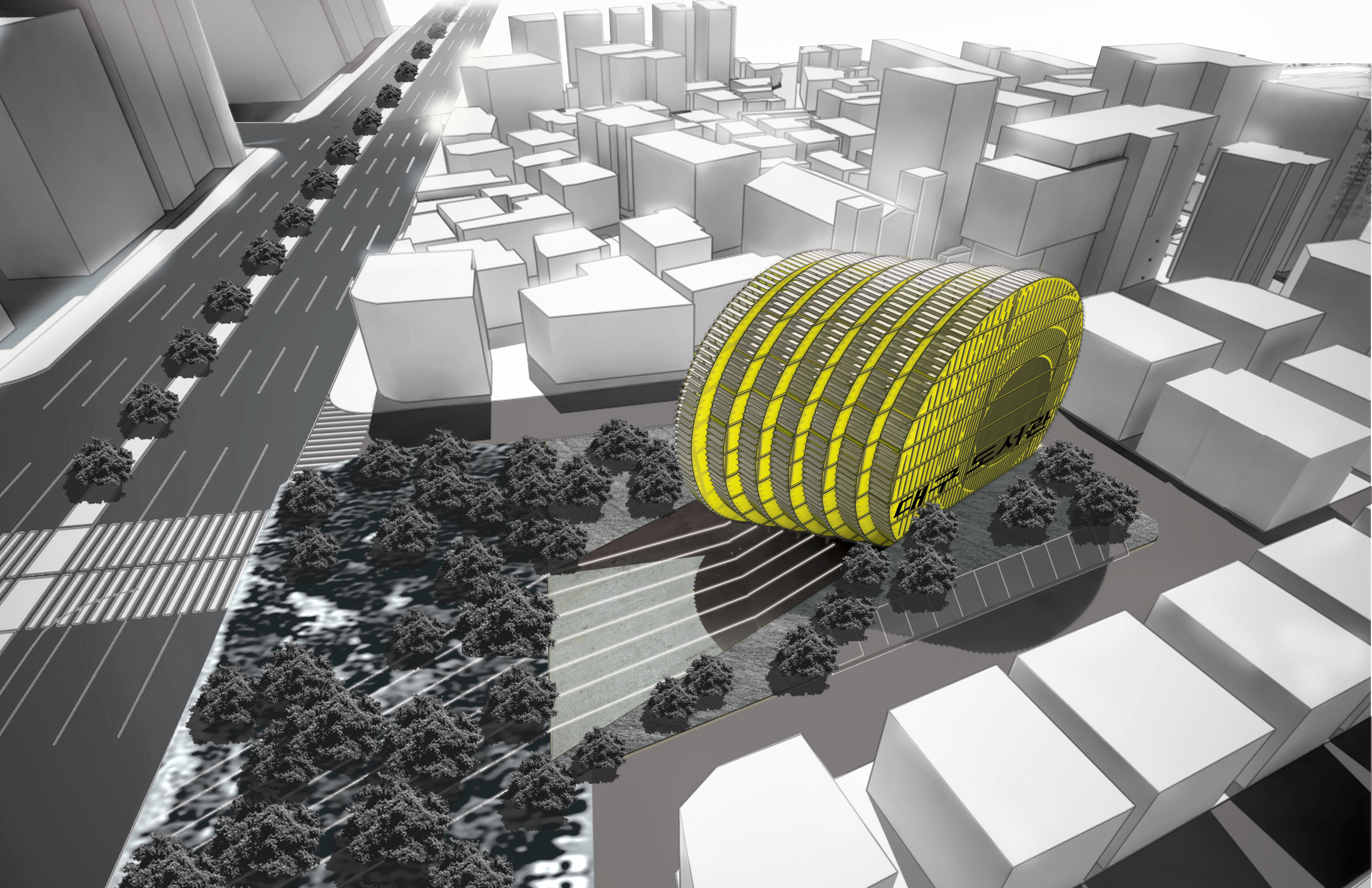 Our vision for the Daegu Gosan Public Library is for a building with a strong character: for a very strong and very special landmark on the local skyline that inspires a feeling of identification and investment in the community it serves. Within the building, our vision is for a dynamic relationship between diverse spaces that enables lively exchanges between visitors, but also provides the acoustic protection and functional organization that enable the library to function with efficiency and serenity. The building has, externally, a powerful sculptural presence that anchors a complex and varied urban site, and has, internally, a subtle variety of big and small spaces, and a careful curatorship of daylight and views, that ensures a lively yet scholarly atmosphere. The scale of the structure mediates between the adjacent low-rise residences and the high-rise towers to the North of the road. The round form of the structure makes it stand out as a clear icon of public life, and distinguishes it from the sometimes repetitive rectangular geometries of the nearby residential towers.