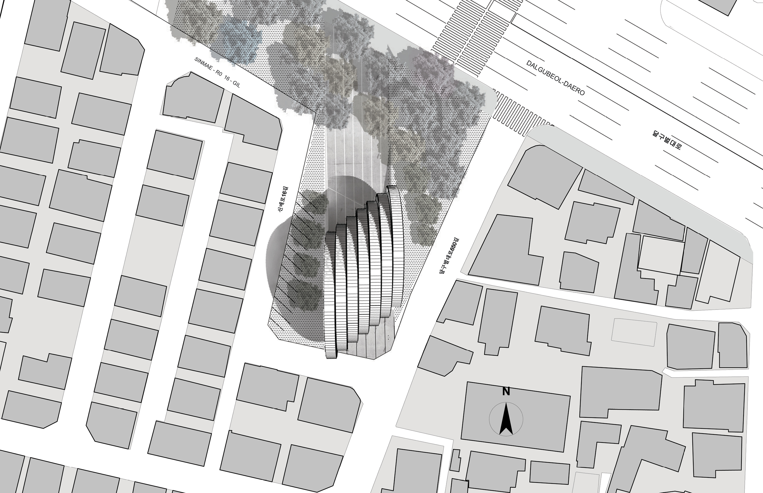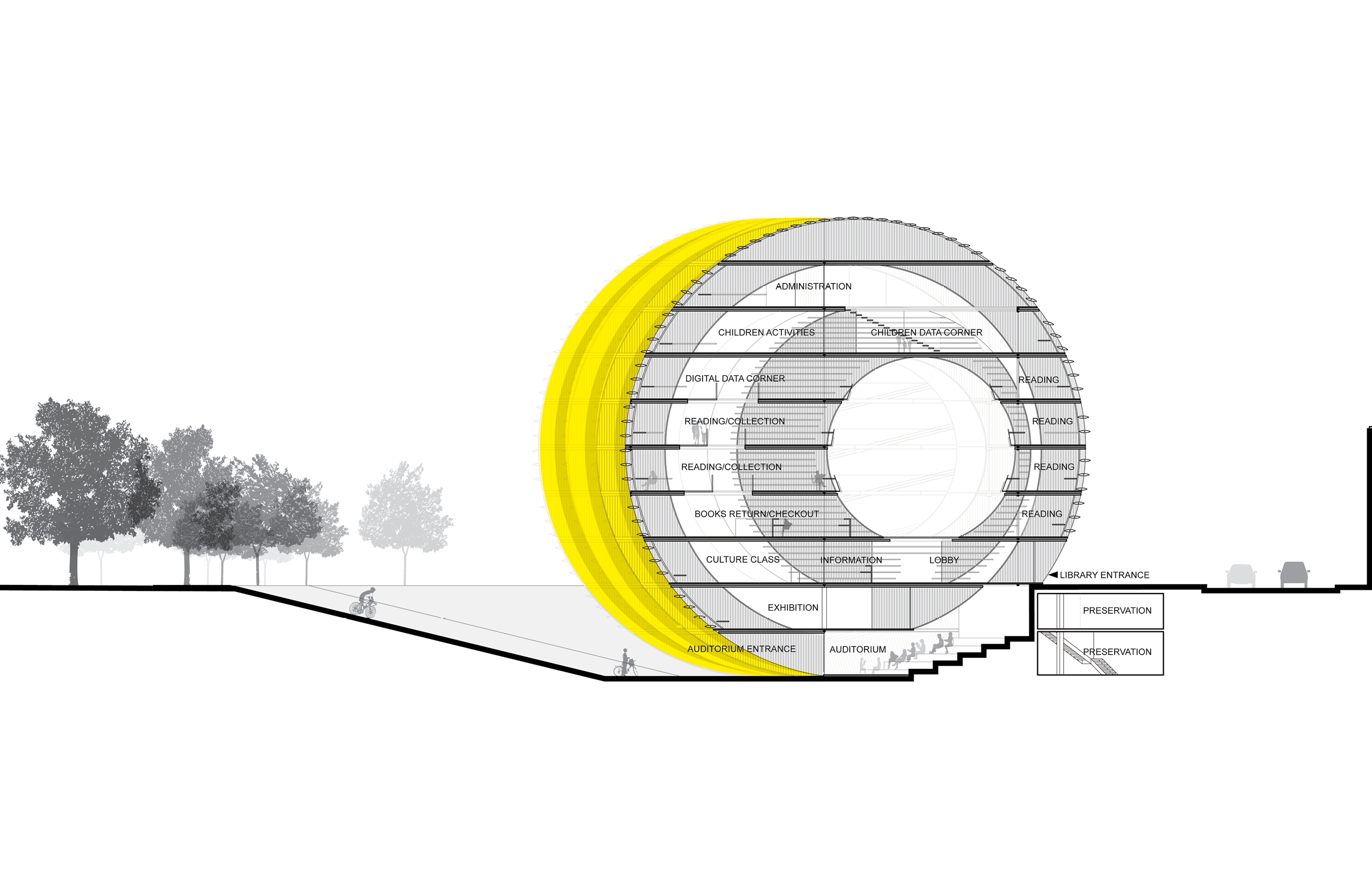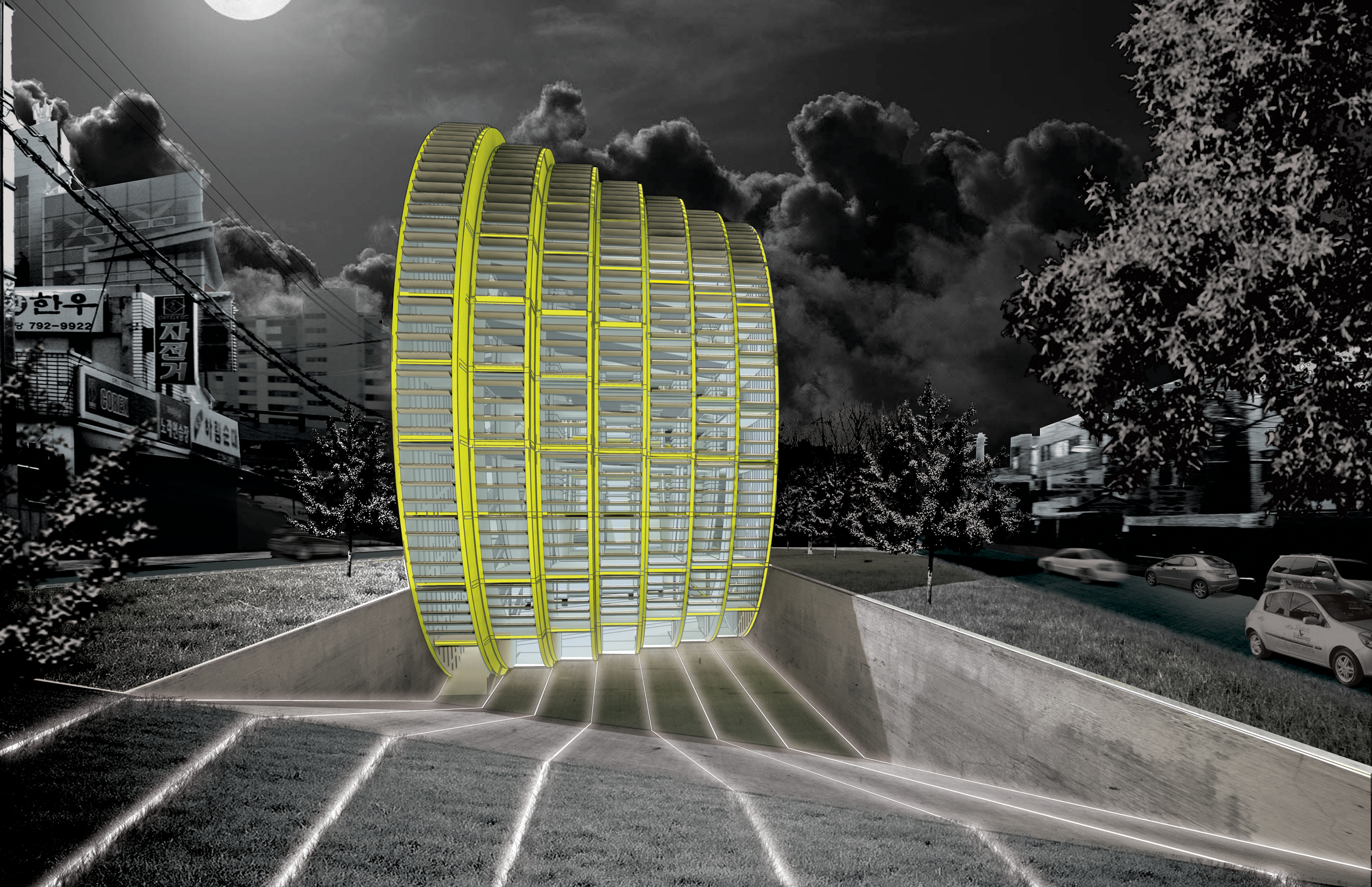Our vision for the Daegu Gosan Public Library is for a building with a strong character: for a very strong and very special landmark on the local skyline that inspires a feeling of identification and investment in the community it serves. Within the building, our vision is for a dynamic relationship between diverse spaces that enables lively exchanges between visitors, but also provides the acoustic protection and functional organization that enable the library to function with efficiency and serenity. The building has, externally, a powerful sculptural presence that anchors a complex and varied urban site, and has, internally, a subtle variety of big and small spaces, and a careful curatorship of daylight and views, that ensures a lively yet scholarly atmosphere. The scale of the structure mediates between the adjacent low-rise residences and the high-rise towers to the North of the road. The round form of the structure makes it stand out as a clear icon of public life, and distinguishes it from the sometimes repetitive rectangular geometries of the nearby residential towers.