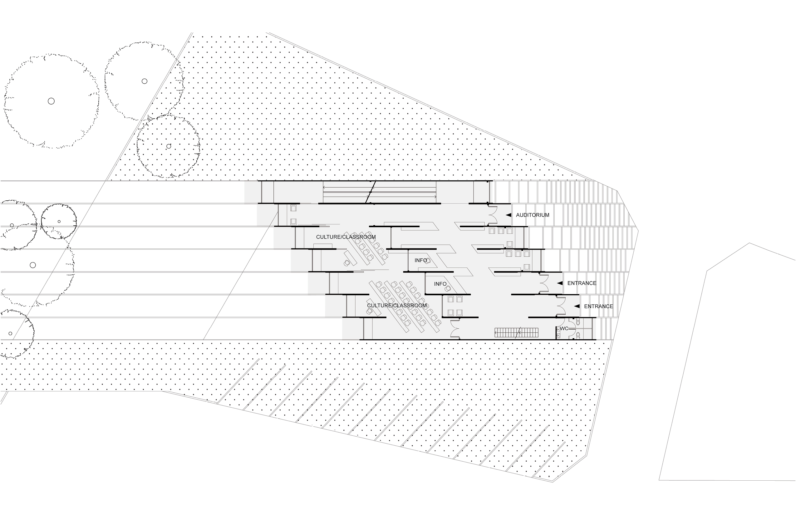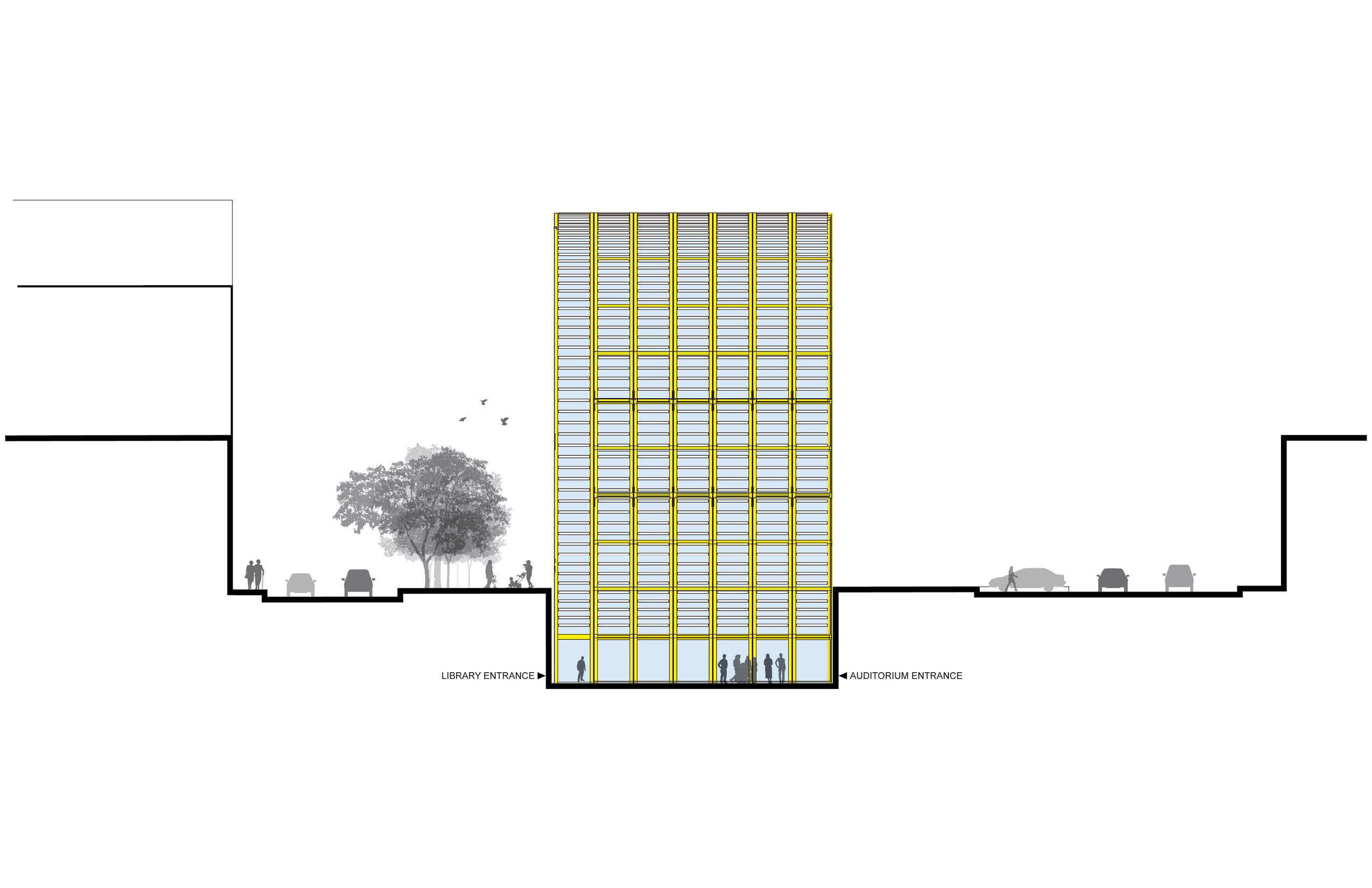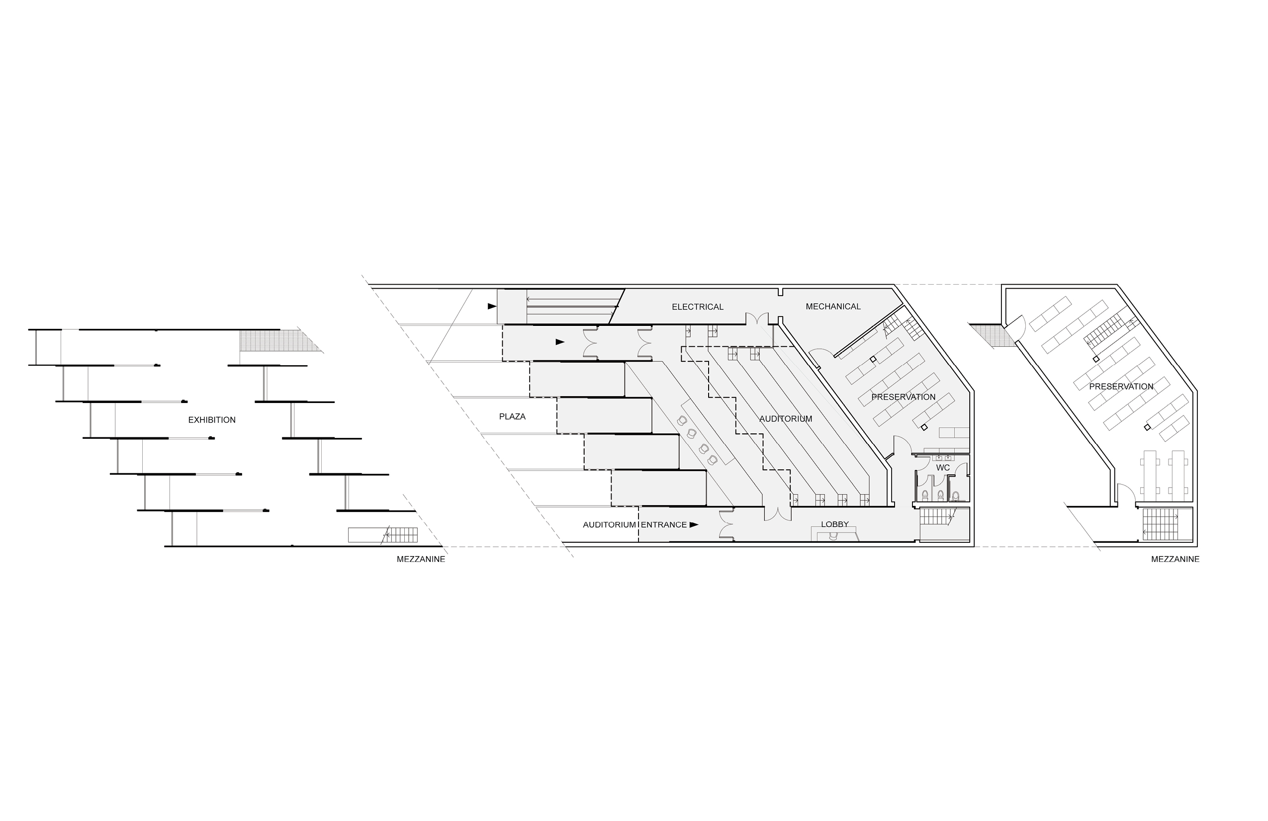 The plaza leads down to an independent entrance for the assembly room/auditorium at the lowest level, and to exhibition spaces on an adjacent mezzanine. On the South side of the building, a street-level entrance leads visitors to the lobby/information area of the library. In the lobby; a translucent ceiling filters in daylight from an atrium above, while filtering out sound from the entry area. The floor of that atrium is the second level above ground, and serves as the main library level, which is overlooked by four terraced reading areas, each on their own mezzanine, and by book stacks and shelves.