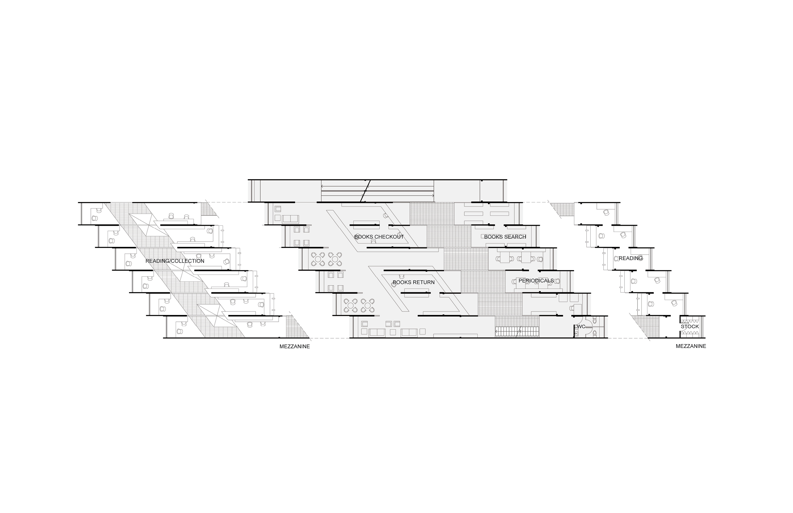 The terraced layout encircling the atrium allows for functional efficiency, but also for great visual connections and meaningful understandings between different areas and activities. A variety of public and semi-private areas for browsing, consulting, readying, studying, lounging, and more, is generated by the juxtaposition of large open spaces and intimate alcove-like areas. This variety of spatial experiences supports the harmonious balance between active and restful, focused and reflective, representing a library at its best.
