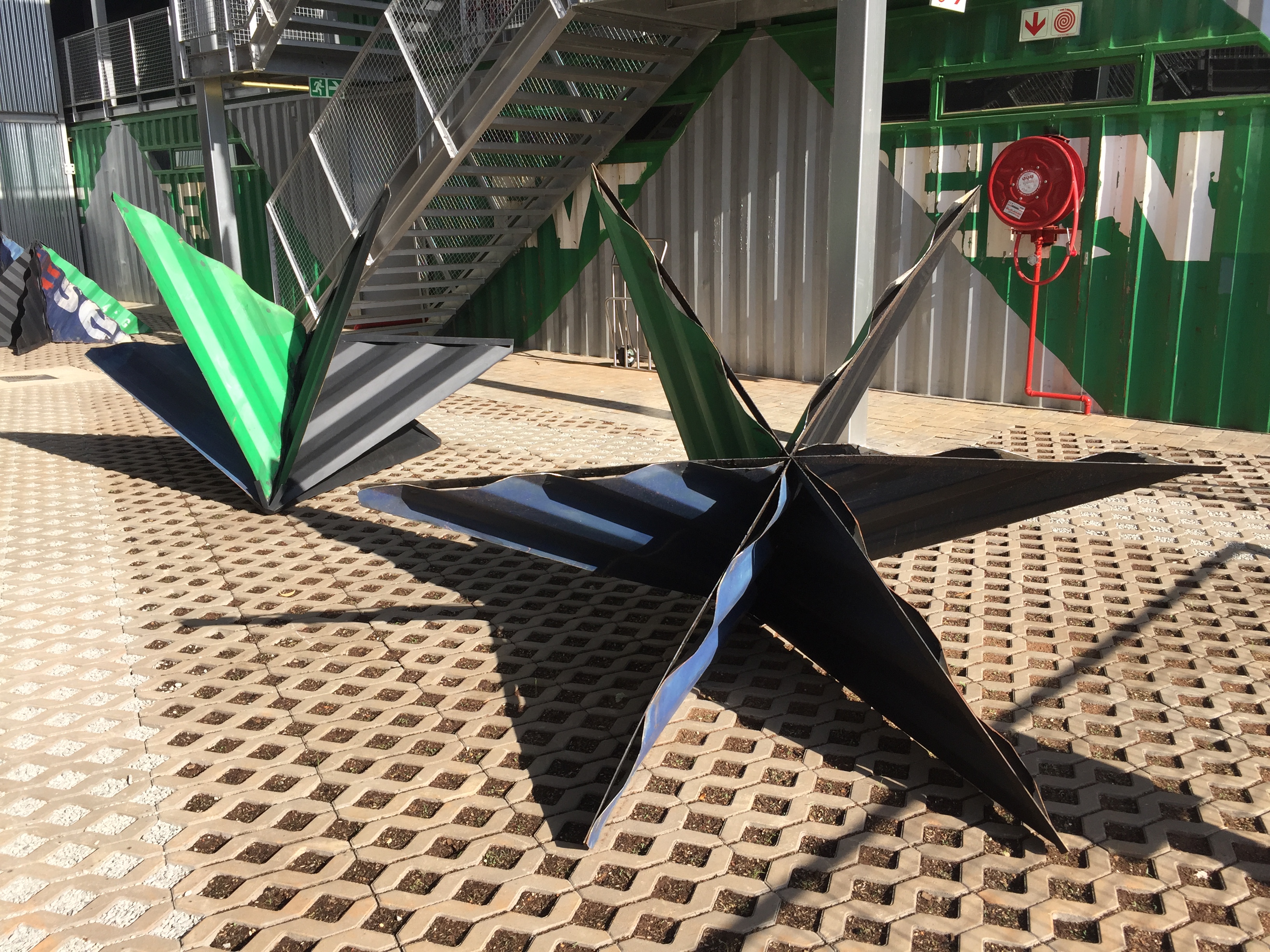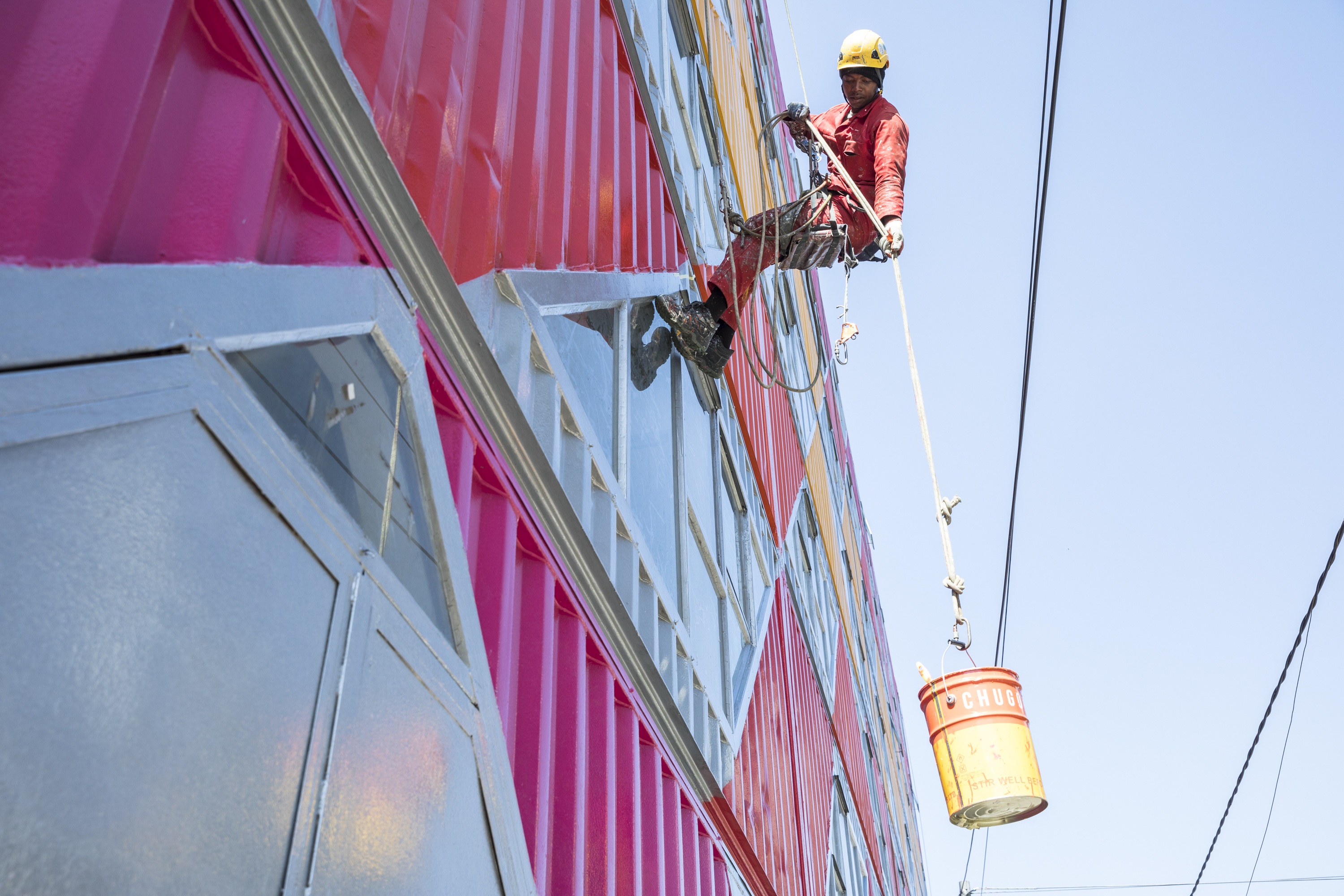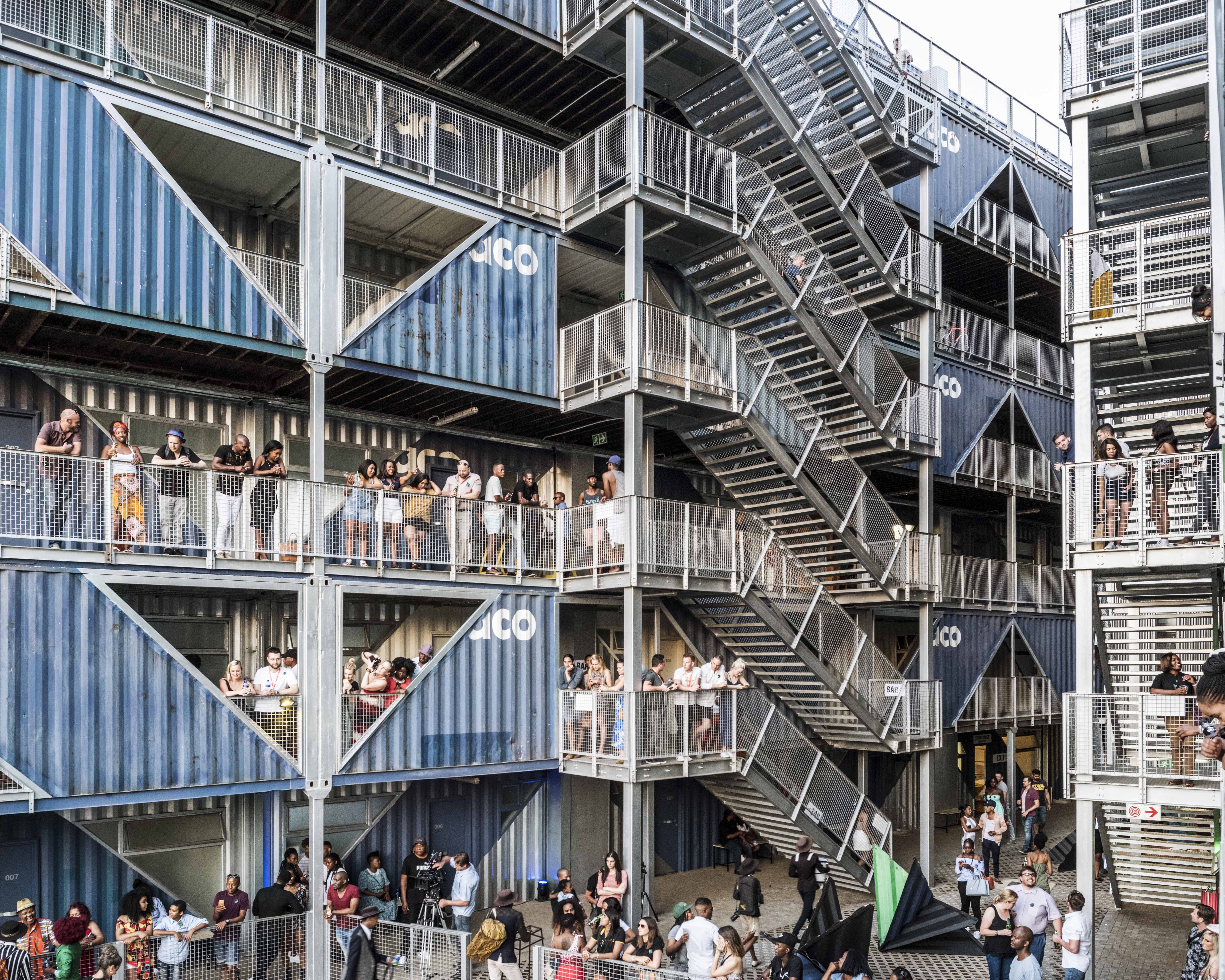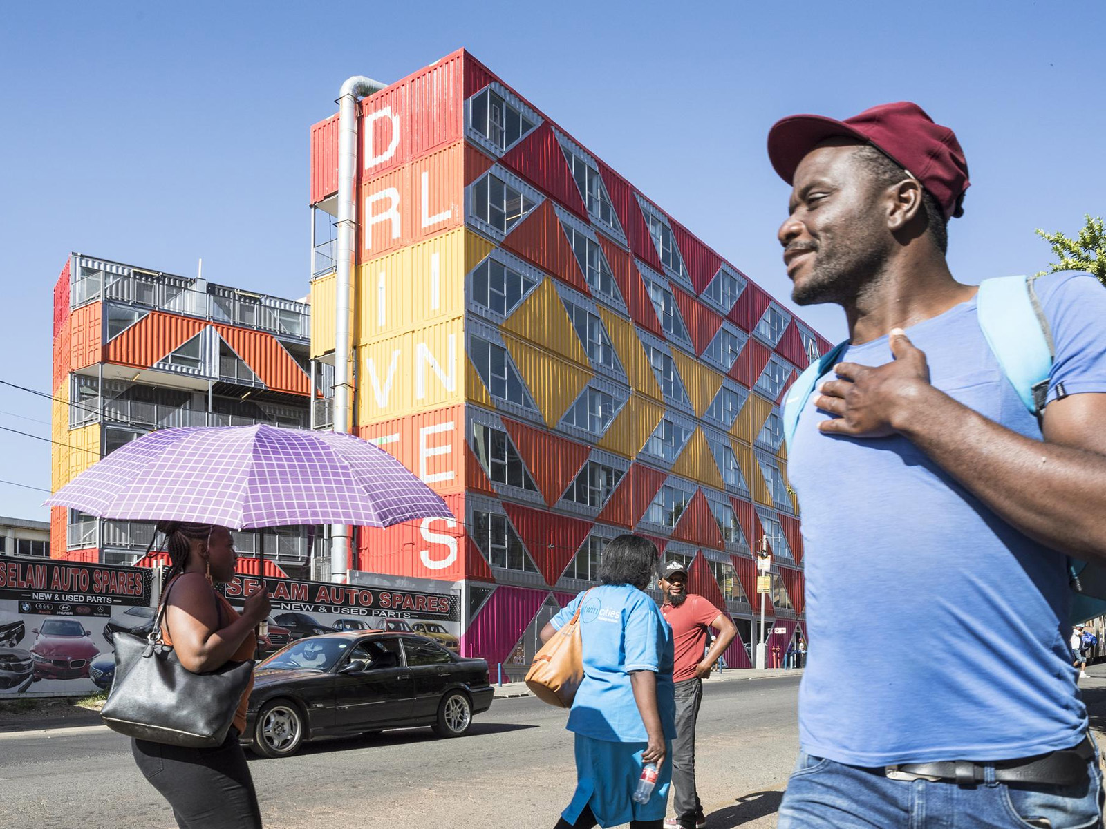 we centered the life around the shared, open space of the courtyard with a small pool and a brai/bbq for the community. All the units outdoor spaces faced this shared area. We reused 140 containers sourced from City Deep, the dry container port less than a mile from the site. The modular, steel construction saved water, plus window cutouts were reused as structural reinforcements
