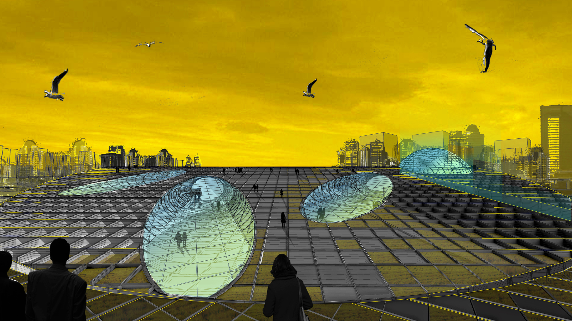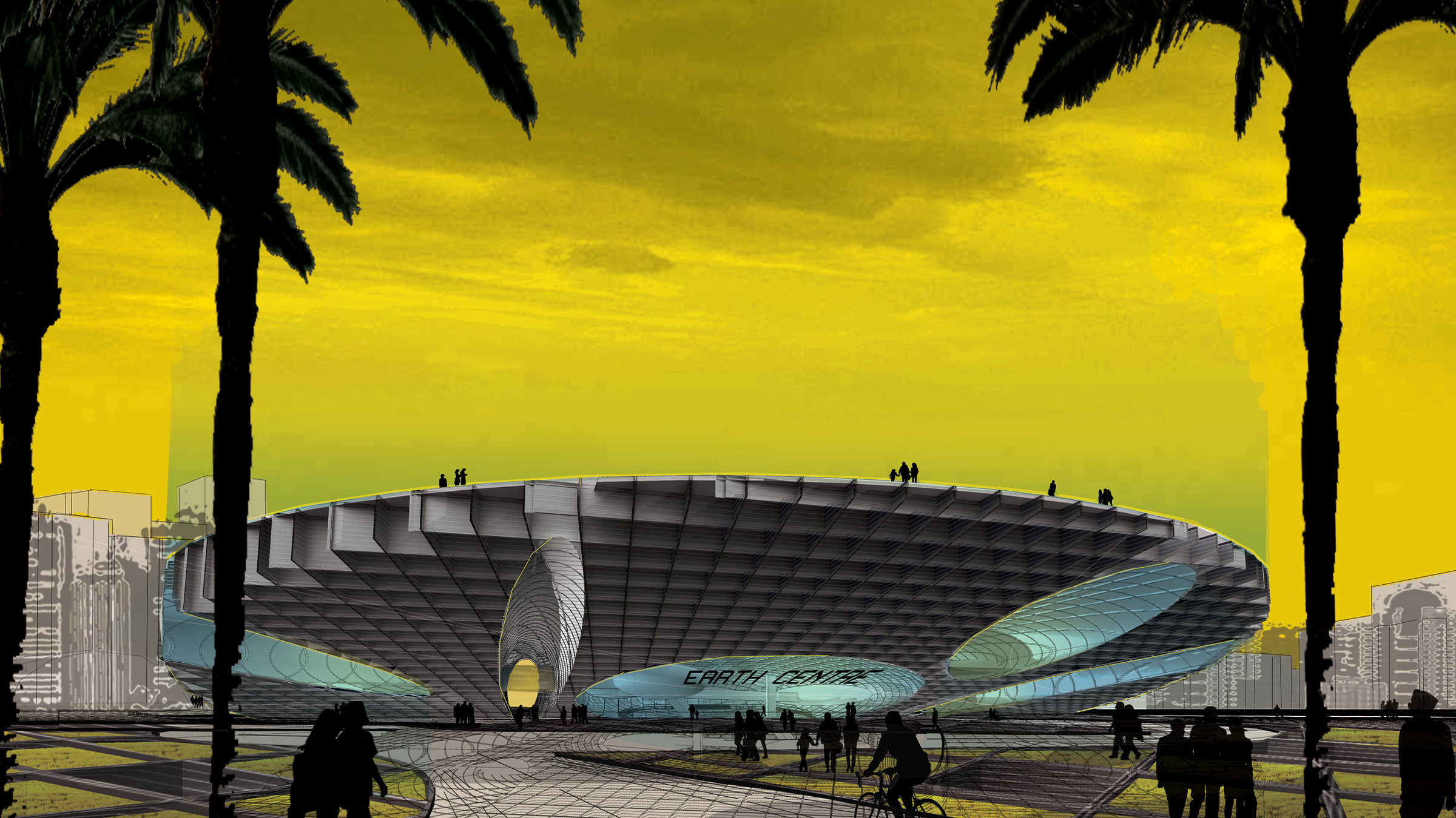 vertical shipping containers are assembled in a honeycomb pattern as a sloping incline, a human-made hill of sort, a large stable mass with voids for access, circulation, and program. Containers are tightly connected to one another to transfer basic horizontal shear forces; smaller clusters of containers, like corbelling bricks of ancient construction, arch over the openings generating the voids within the building fabric.