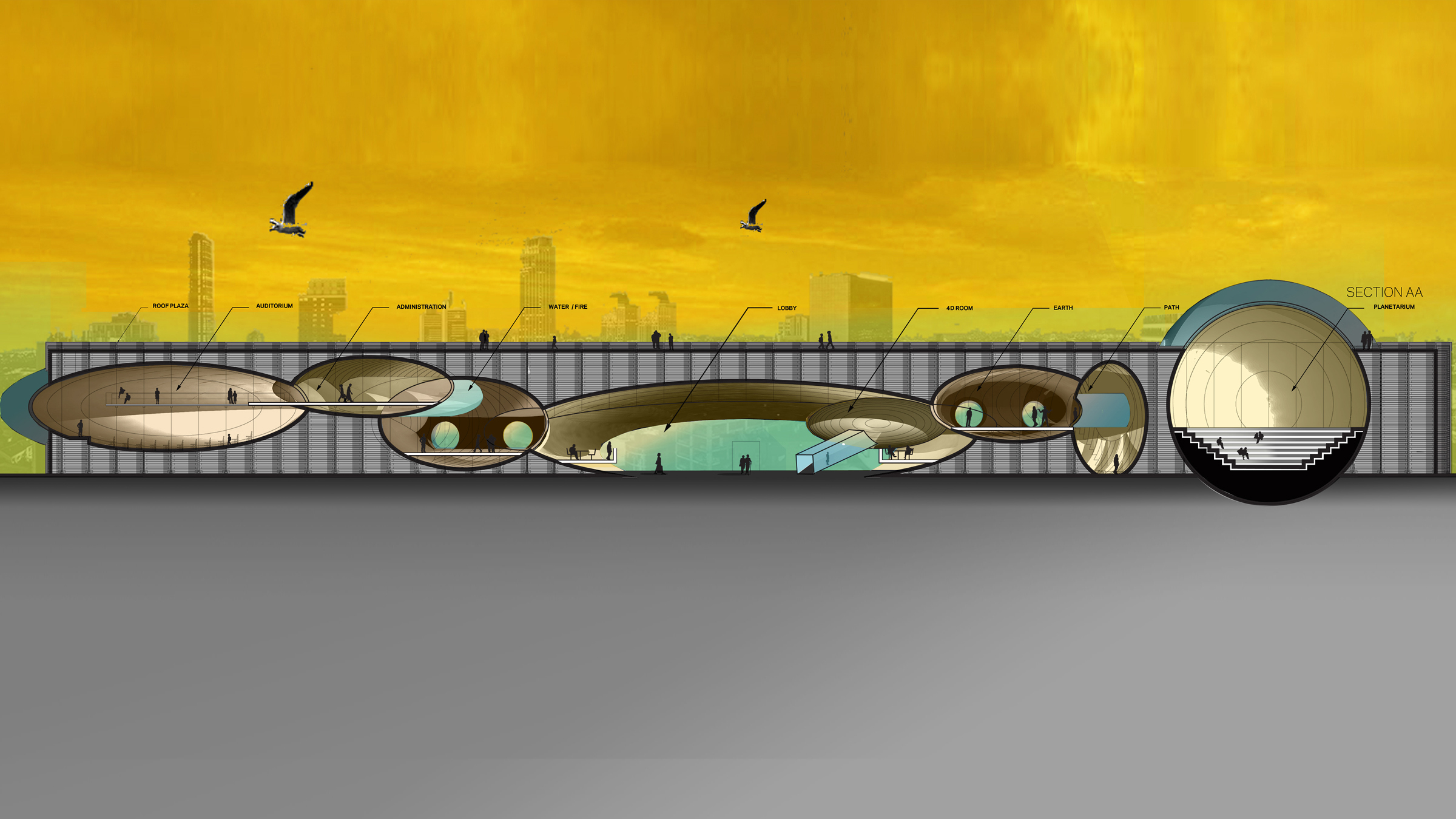 several different and interconnected areas offer a sequence and variety of experiences within the Istanbul Earth Centre. The main entrance directs visitors to an open, triple-height area lobby/information center, café and introductory exhibition space. This ground area also serves for public gatherings and community/information exchange in the event of a natural disaster. Visitors are then directed to the 4D video room to start the exhibition visit. The sequence continues with the Liquefaction and Earthquake sections and finally, the Planetarium. A bridge, intersecting the lobby again at a higher level, crosses the building leading visitors to the Rainstorm, Fire and Smoke sections, which are housed within the north side of the building. The Auditorium is also located in this area and is accessible directly and independently from the lobby through elevators. Administration, Children’s section and Library are all located on the highest level of the building, via direct connections to the lobby and the auditorium.