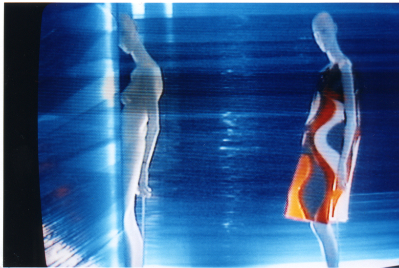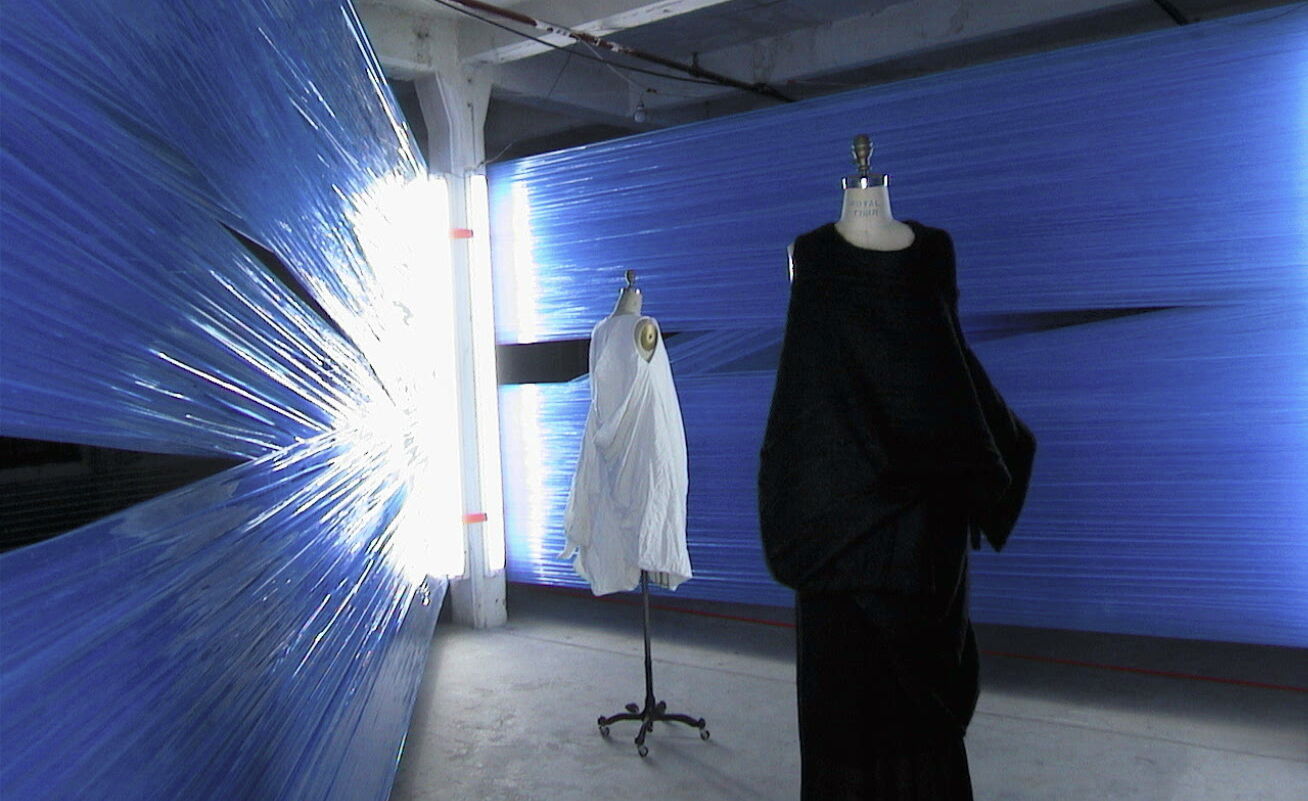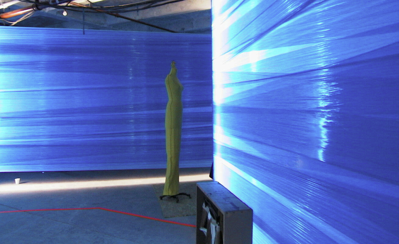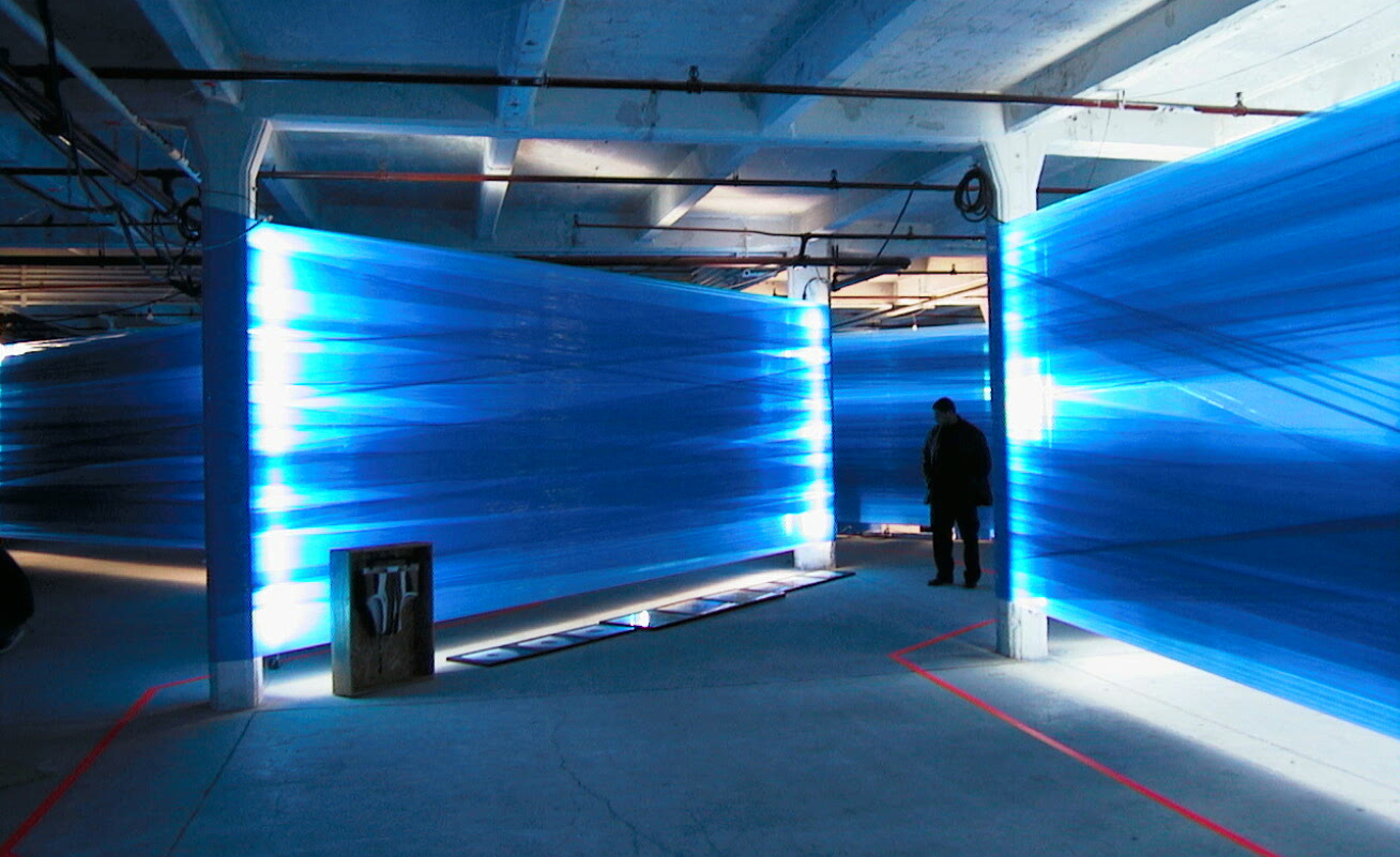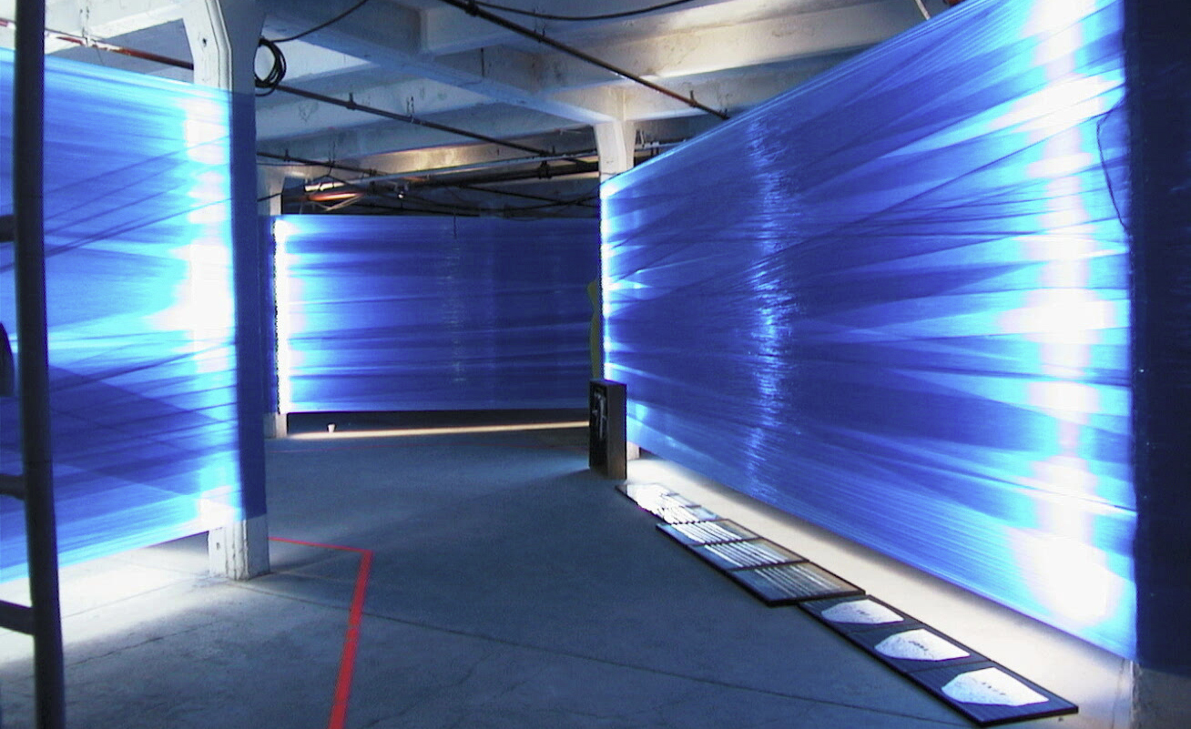 Inside a vast warehouse floor, blue shrink-wrap is stretched around two or more columns in a diagonal random pattern. Fluorescent tubes, attached to the columns, diffuse a dense blue light through the colored shrink wrap. Fluorescent orange lines on the floor guide the visitor through the resulting labyrinth