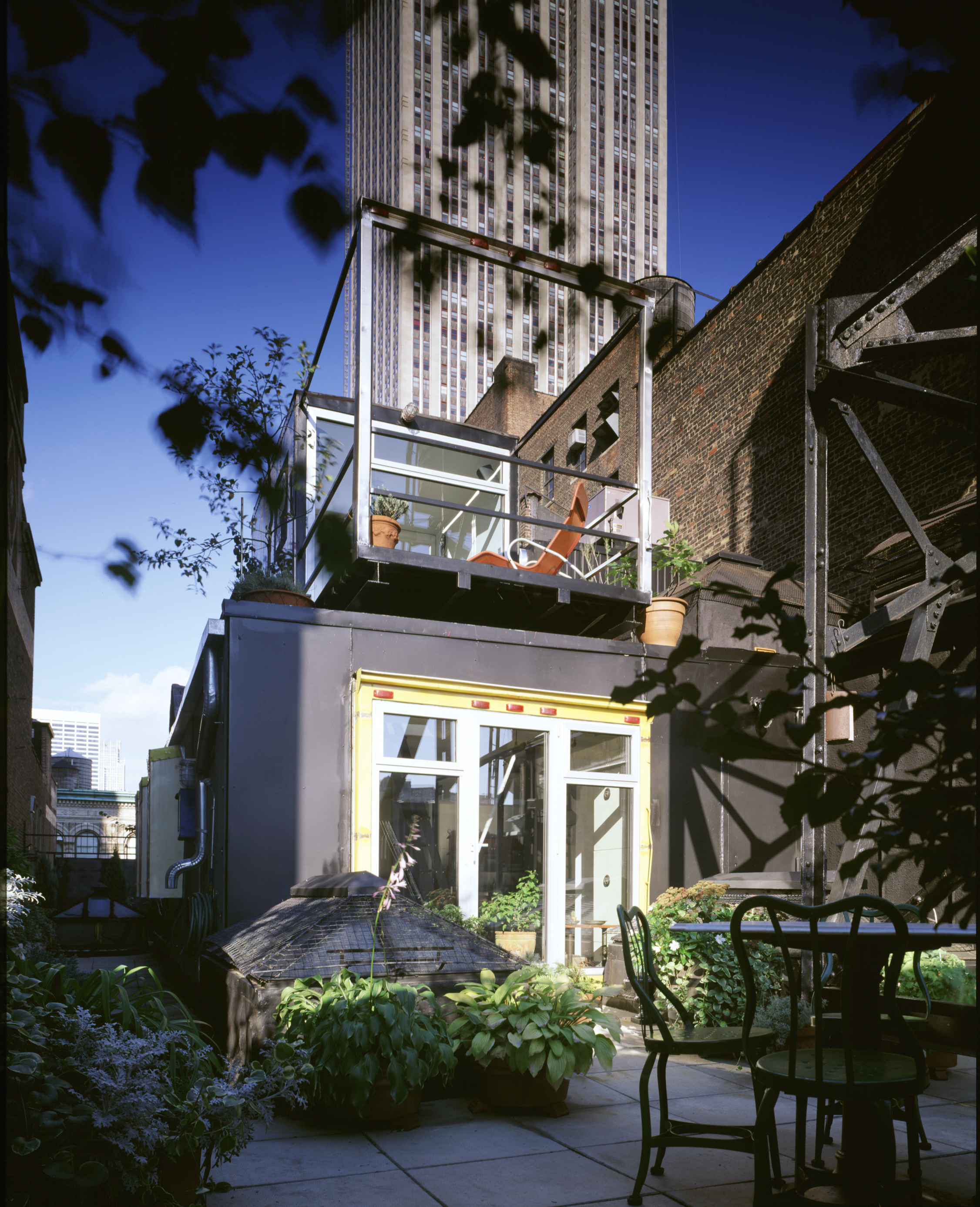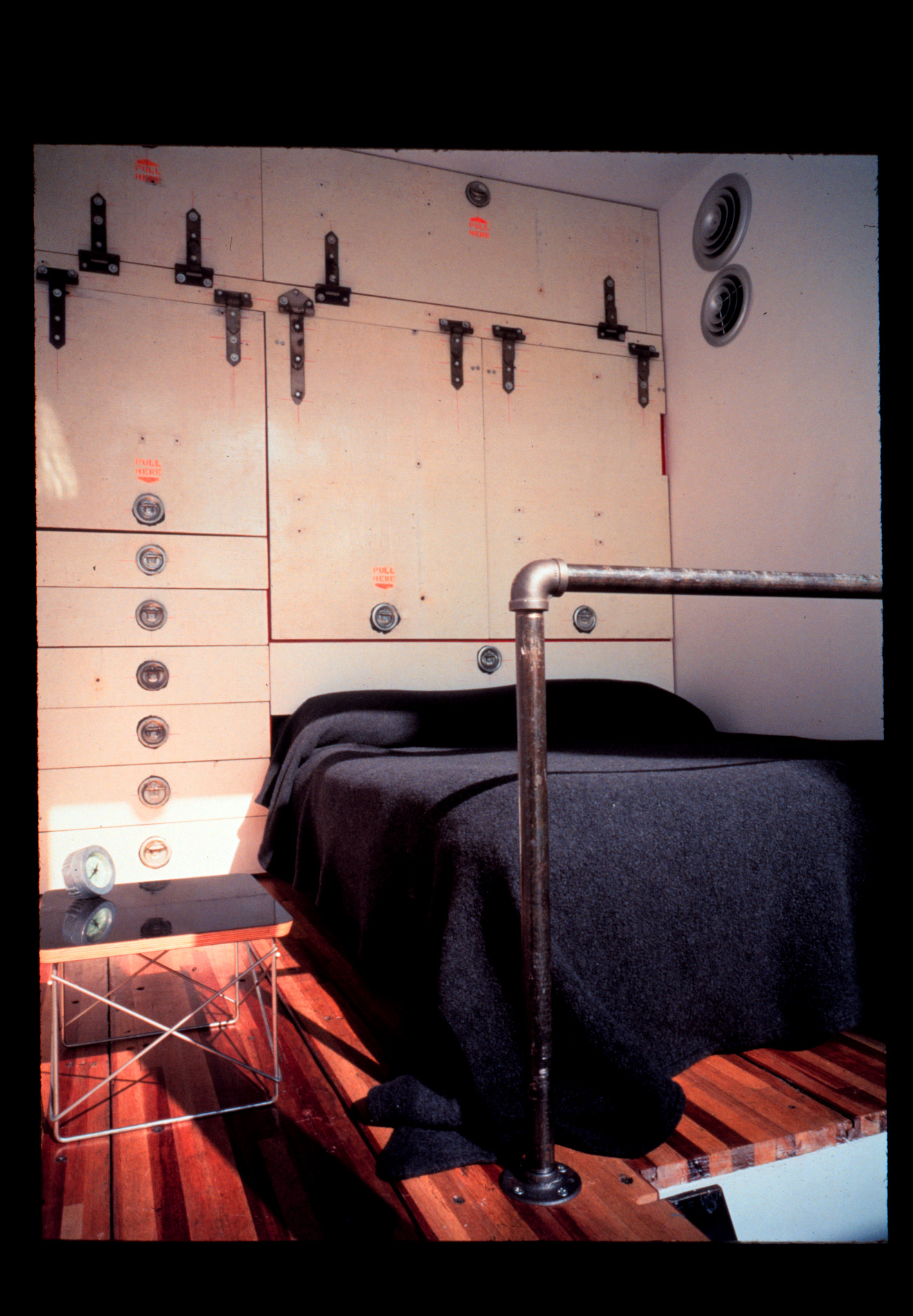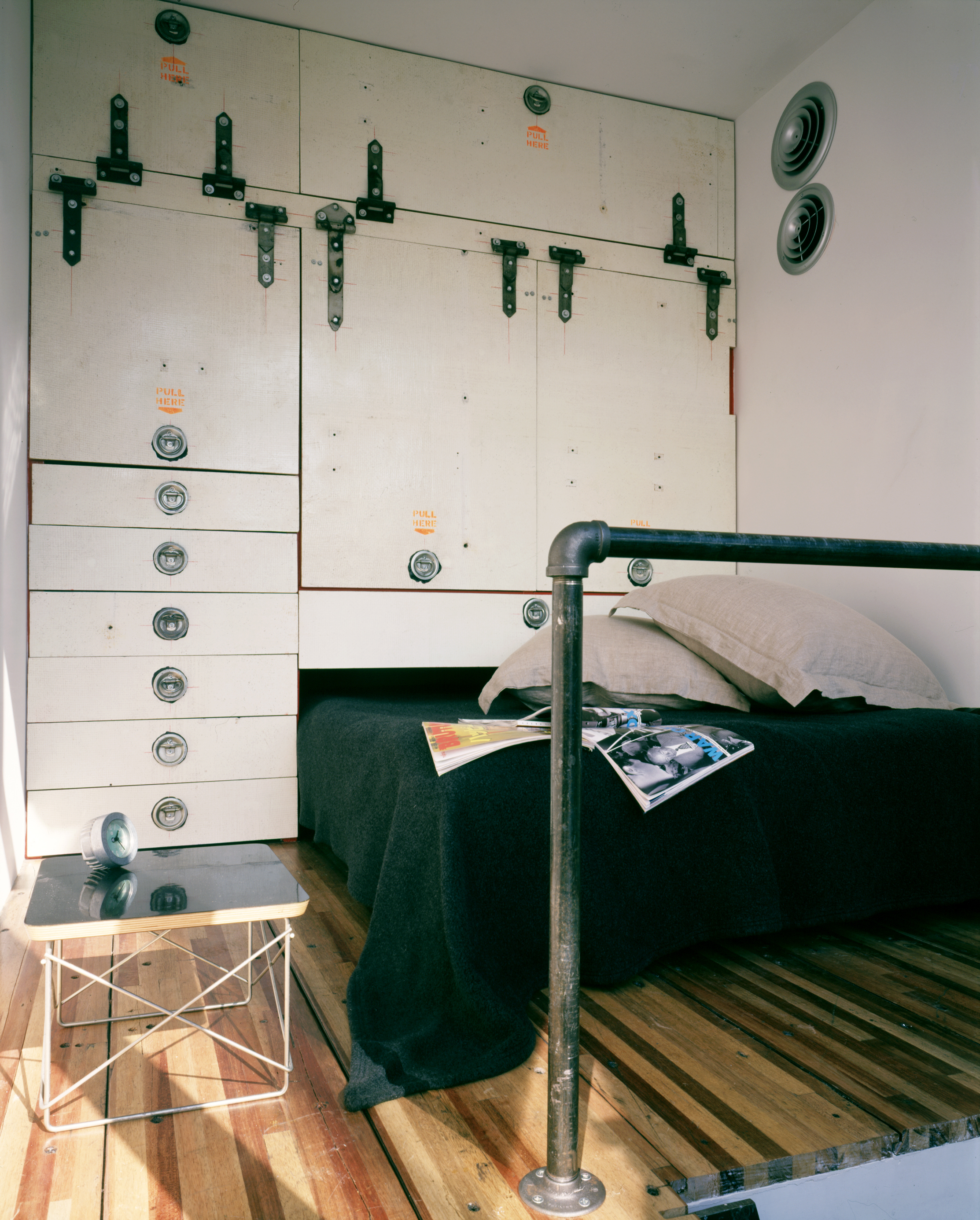 two trucks stacked on top of each other are the upstairs bedroom and a bay window at the main level. The bay window is wedged into the south wall, while the main bedroom is added on top of the existing structure, partially peeling the wall of the yellow aluminum container as an outdoor patio. in the minimal interior, insulated and air-conditioned, the bed moves in and out of the closet on tracks to allow sleeping and lounging