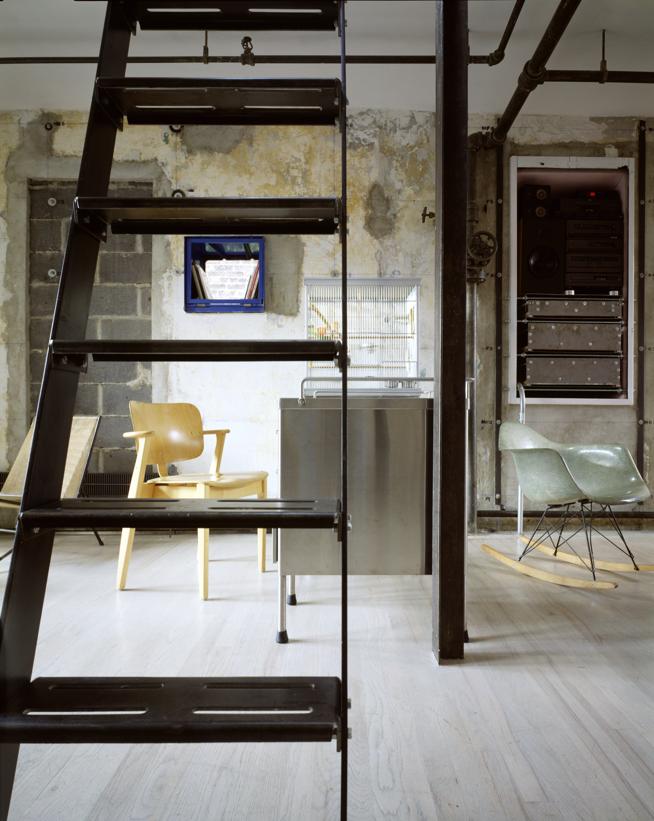 the interior of the existing structure is returned to a simple white shell with exposed steel pipes and beams. It houses an open layout of living/dining/kitchen, and a separate bedroom for the child. The longitudinal wall is the visual and functional spine of this loft space. Refrigerators and newspaper dispensers pierce this wall and stretch out the interior space towards the outside