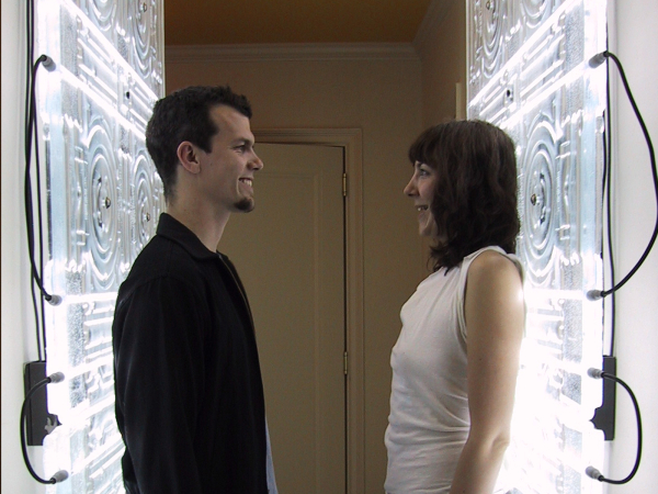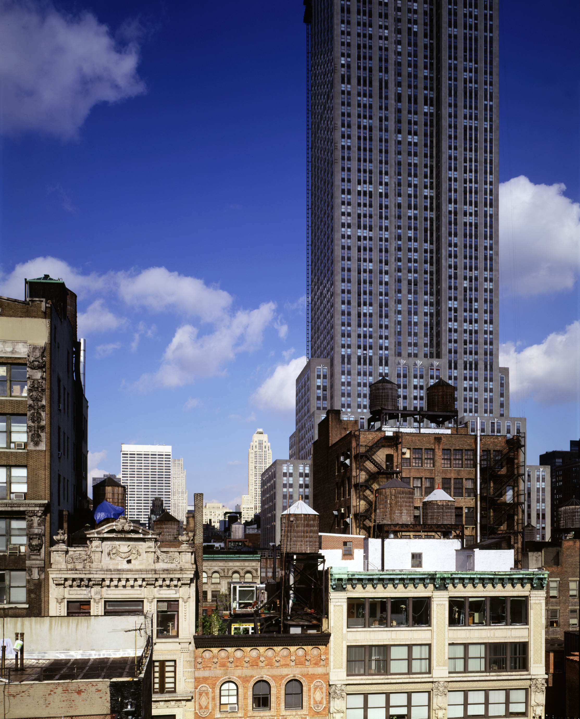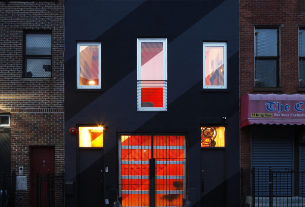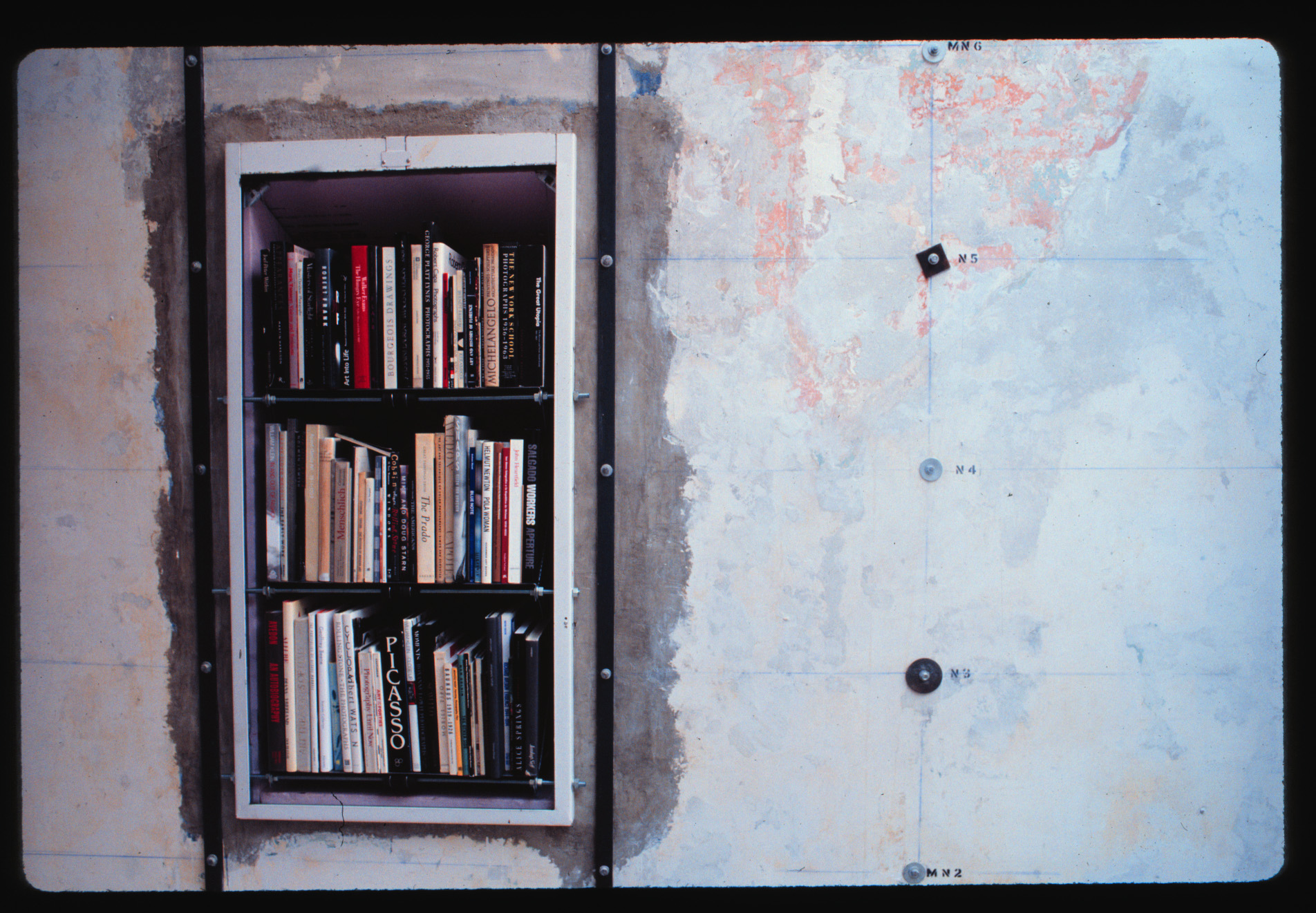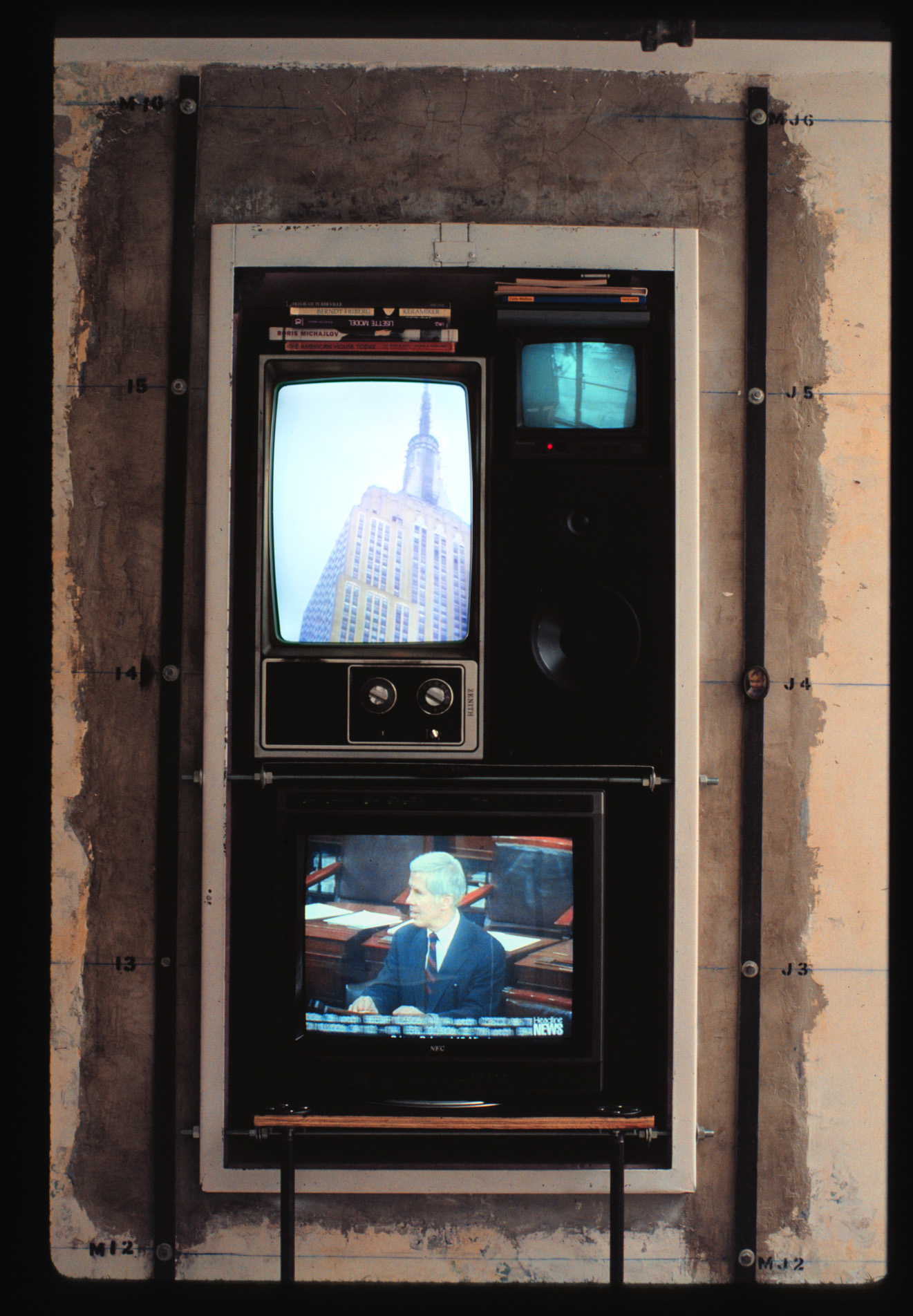 newspaper dispensers become small windows and the only lookout points along the wall. An exposed grid of bolts compresses an insulation layer between a corrugated metal skin on the outside and the existing wall. Its interior side is left unfinished but flush, and the traced guidelines remain visible. The refrigerator boxes are filled with technological functions: LISTEN (hi-fi system), WATCH (video intercom, pull-out TV set and vertical monitor connected to a surveillance camera trained to the Empire State Building), READ (bookcase)