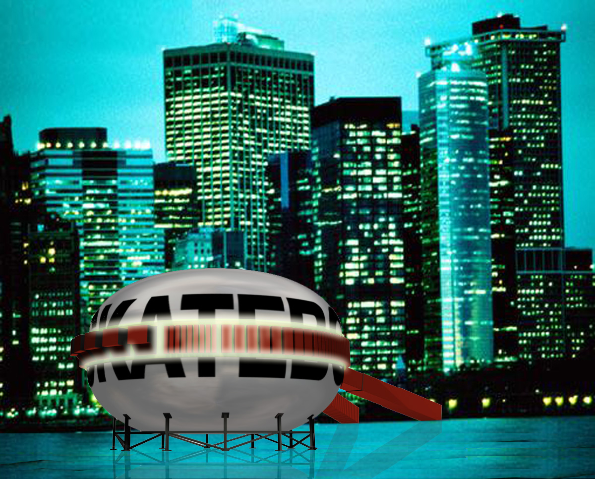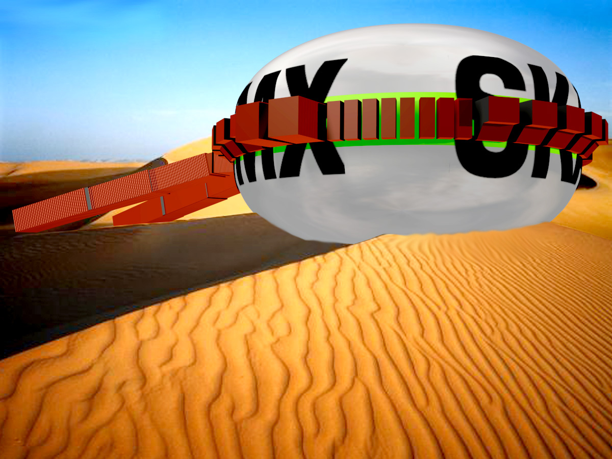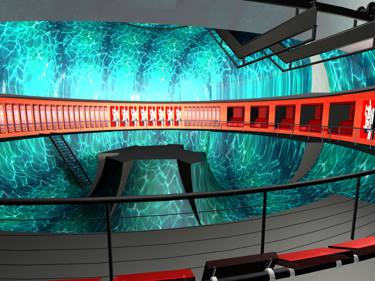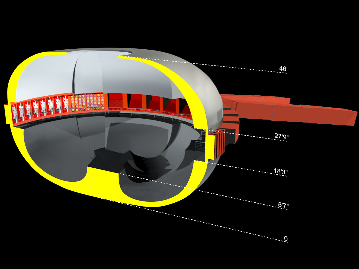 the path is located at the top of the skating ramps, and it is animated by graphics and light. 40-foot shipping containers serve as entrance and exit tunnels; 20-foot shipping containers house offices and bathrooms. The whole inner surface of the tank is coated with white epoxy to be used as a spherical projection screen, introducing the skaters into virtual landscapes