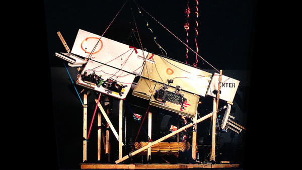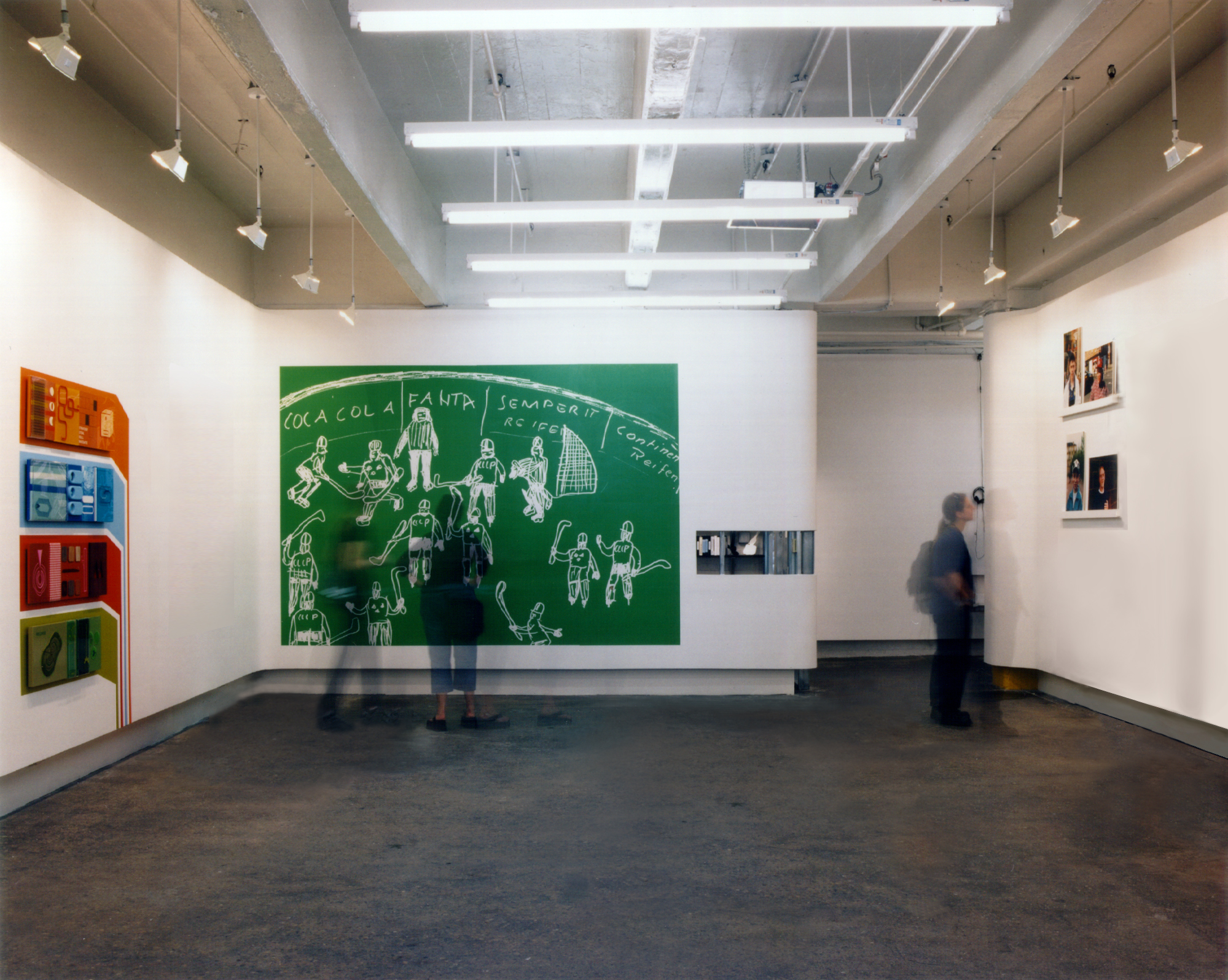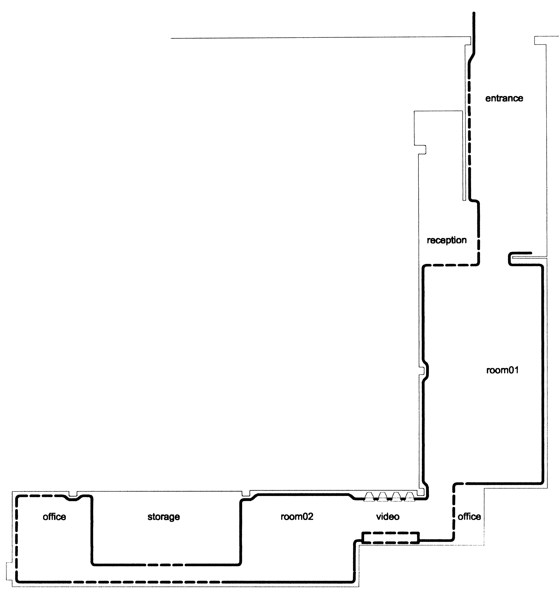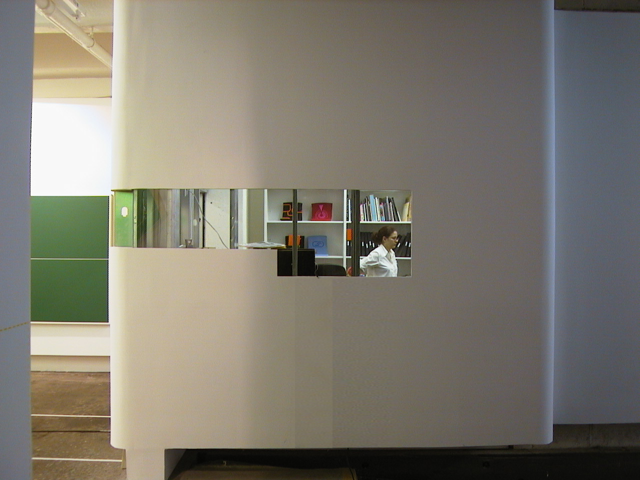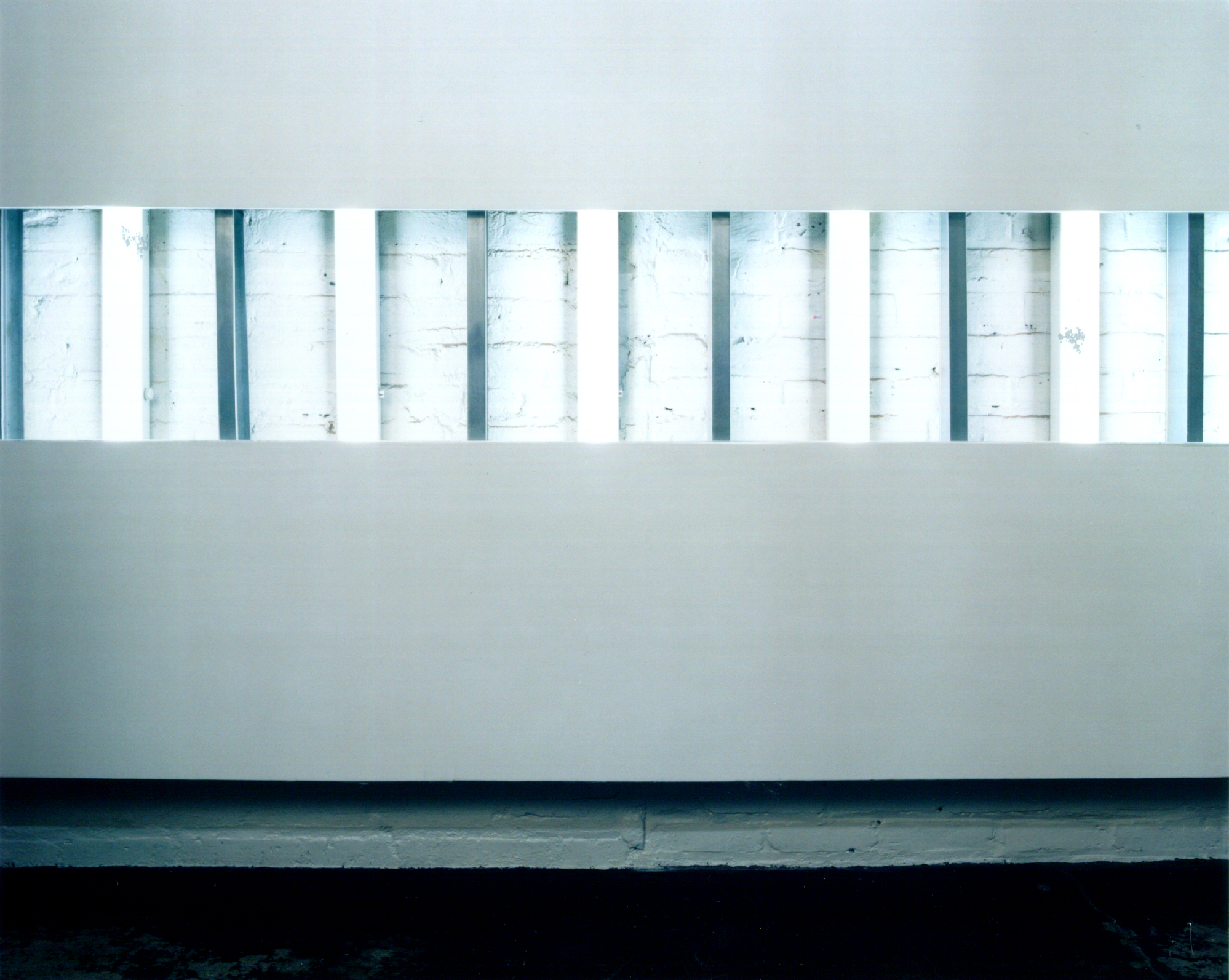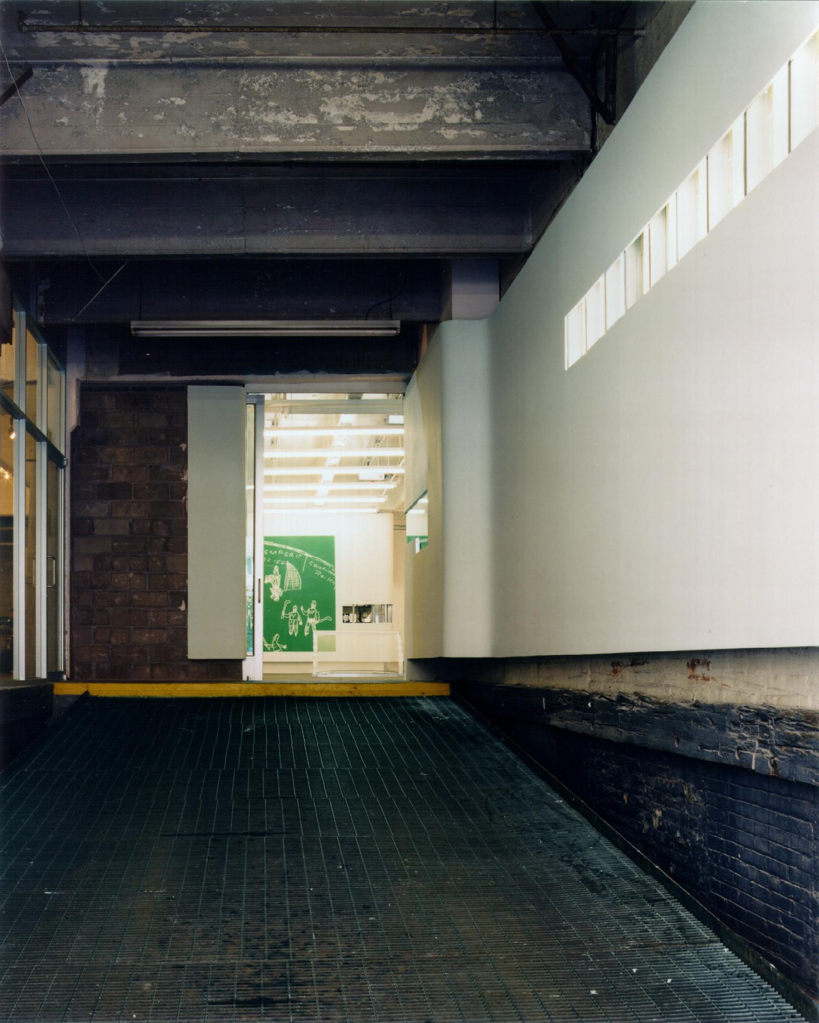 at the entrance, the band acts as the gallery sign. Along the steel entry ramp, the band becomes a light fixture. At other points the band detaches itself from the walls to fold out and generate spaces for service functions (reception, offices and storage)