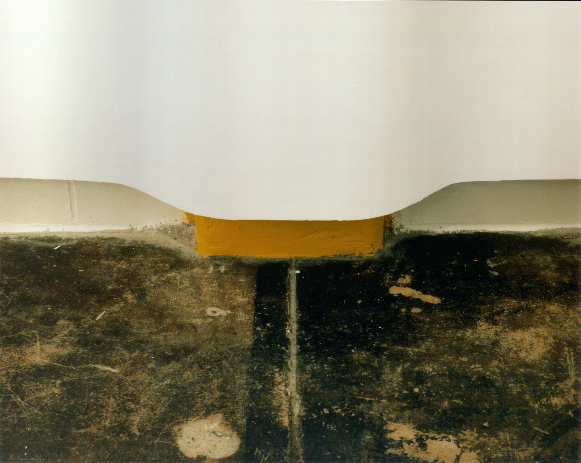 a ten-foot continuous white band overlaps the raw texture of the existing garage walls with its pristine super white surface, creating a pure exhibition layer distinct from the still-present previous parking structure