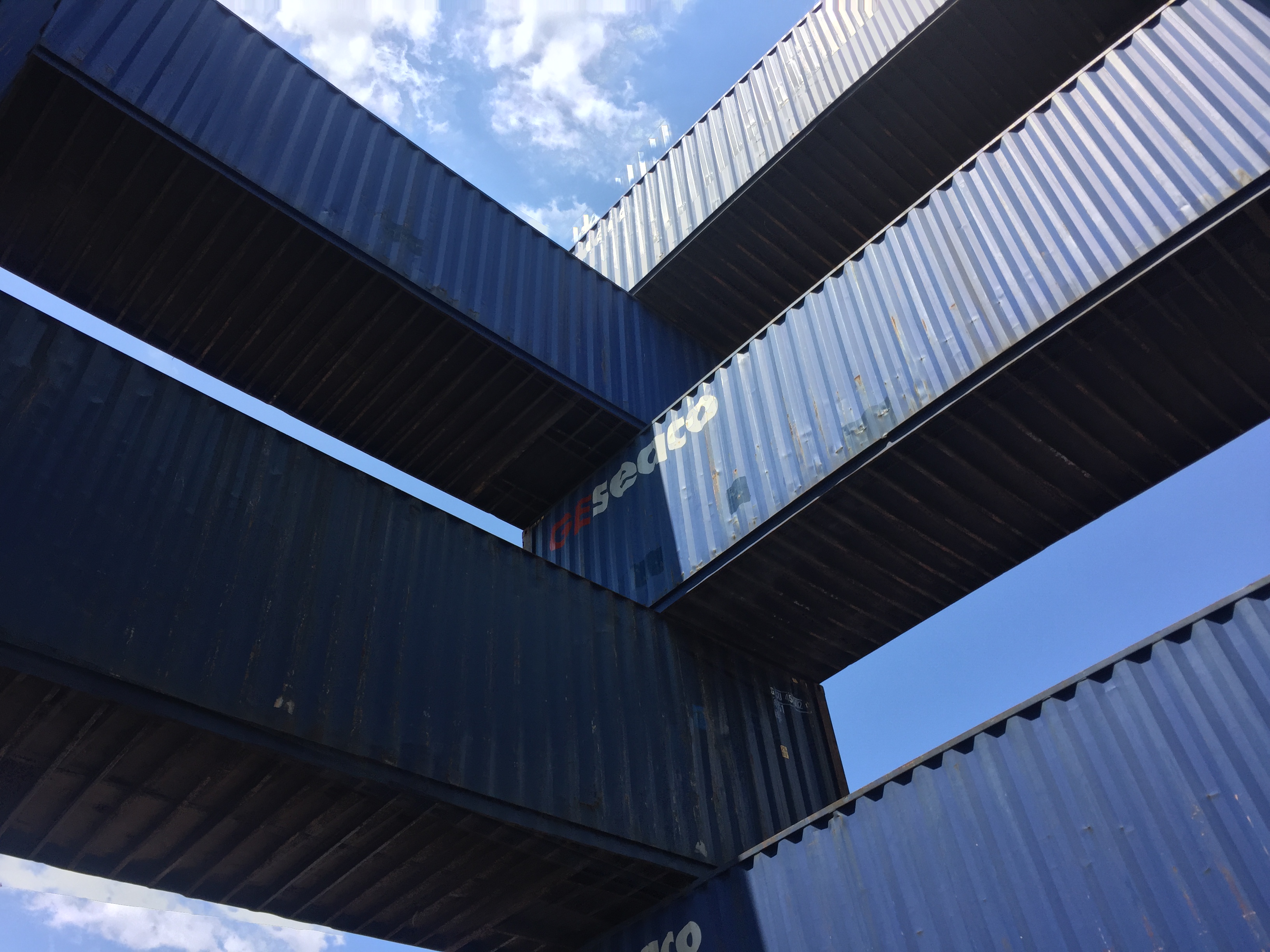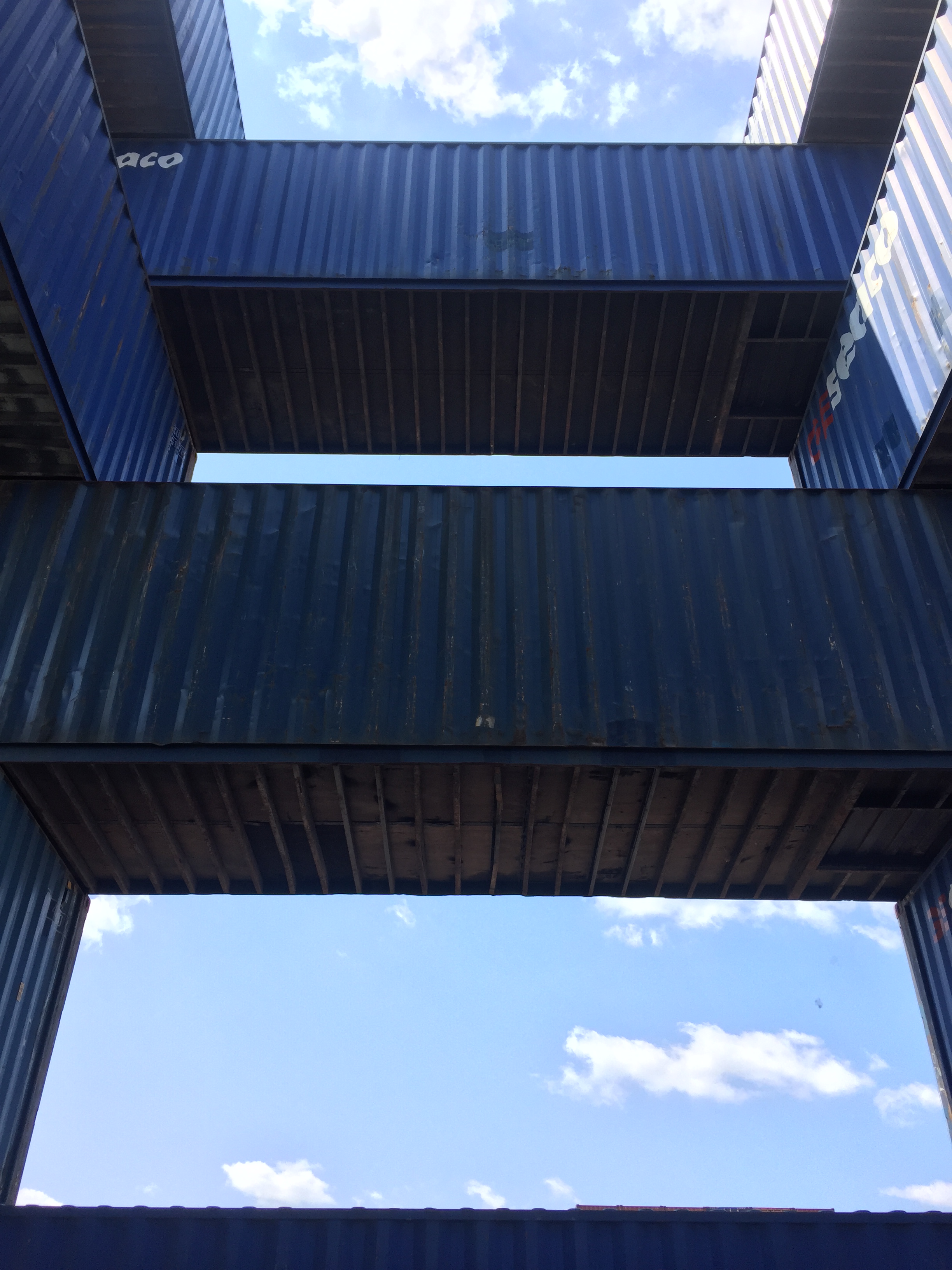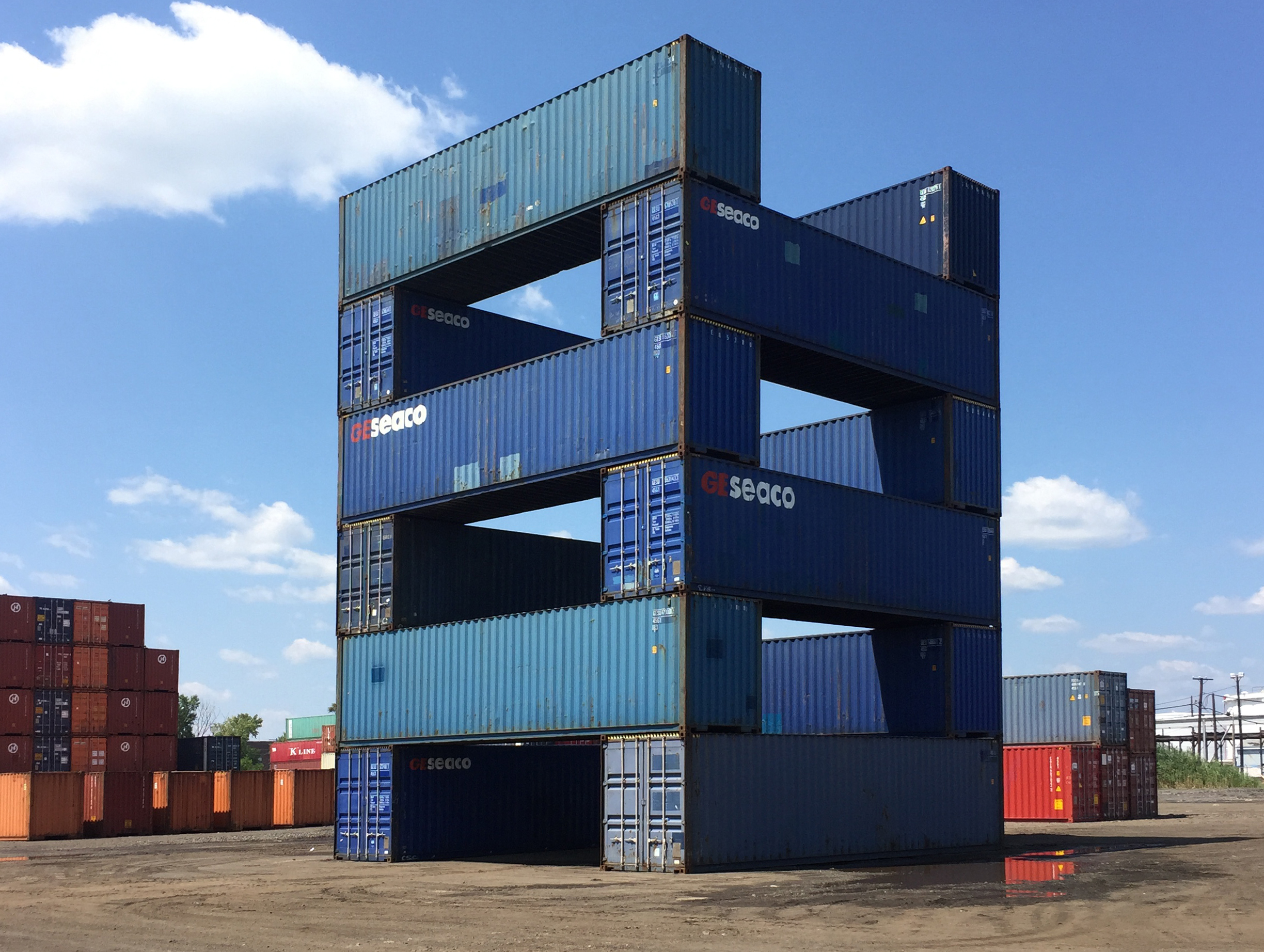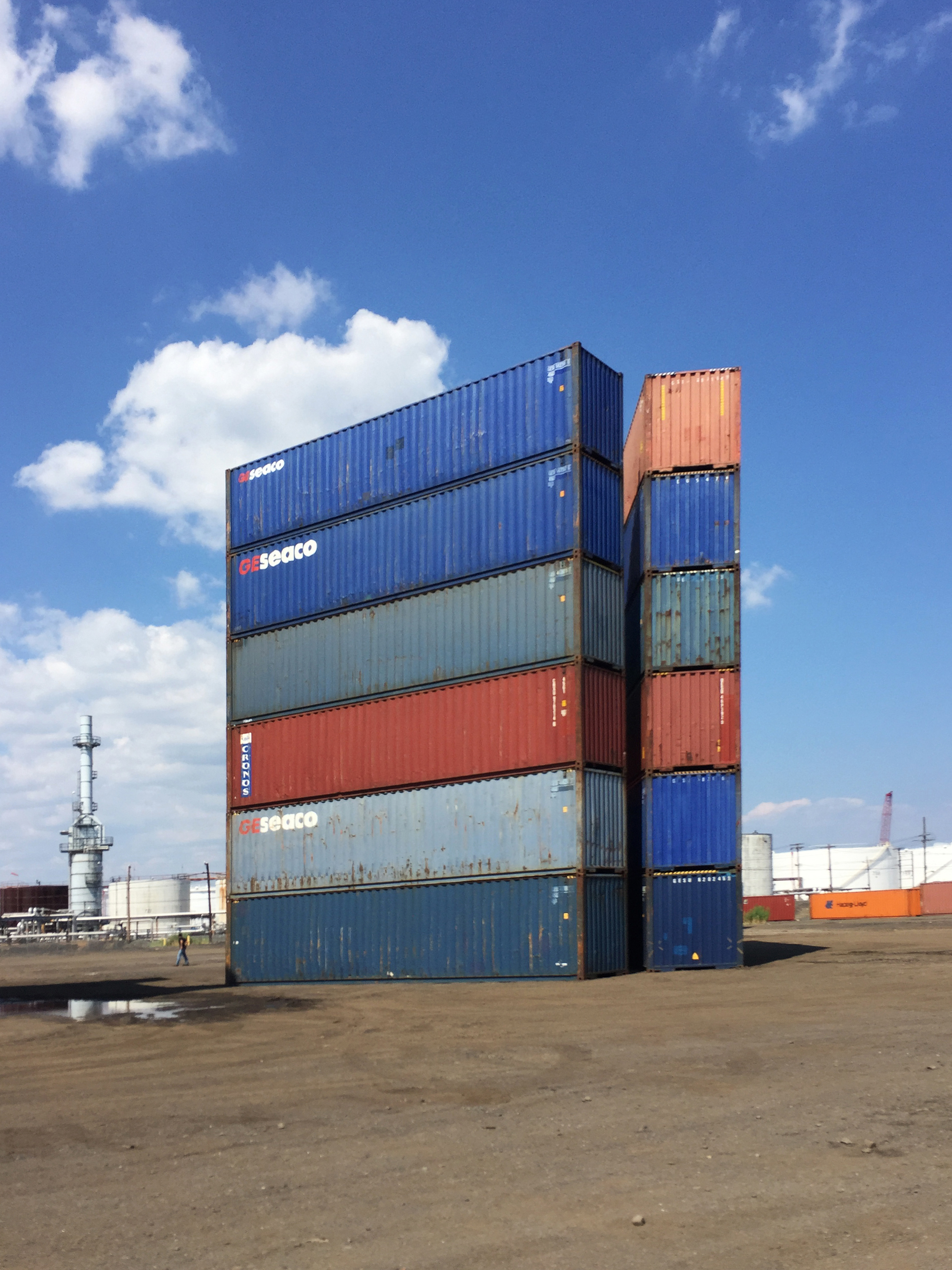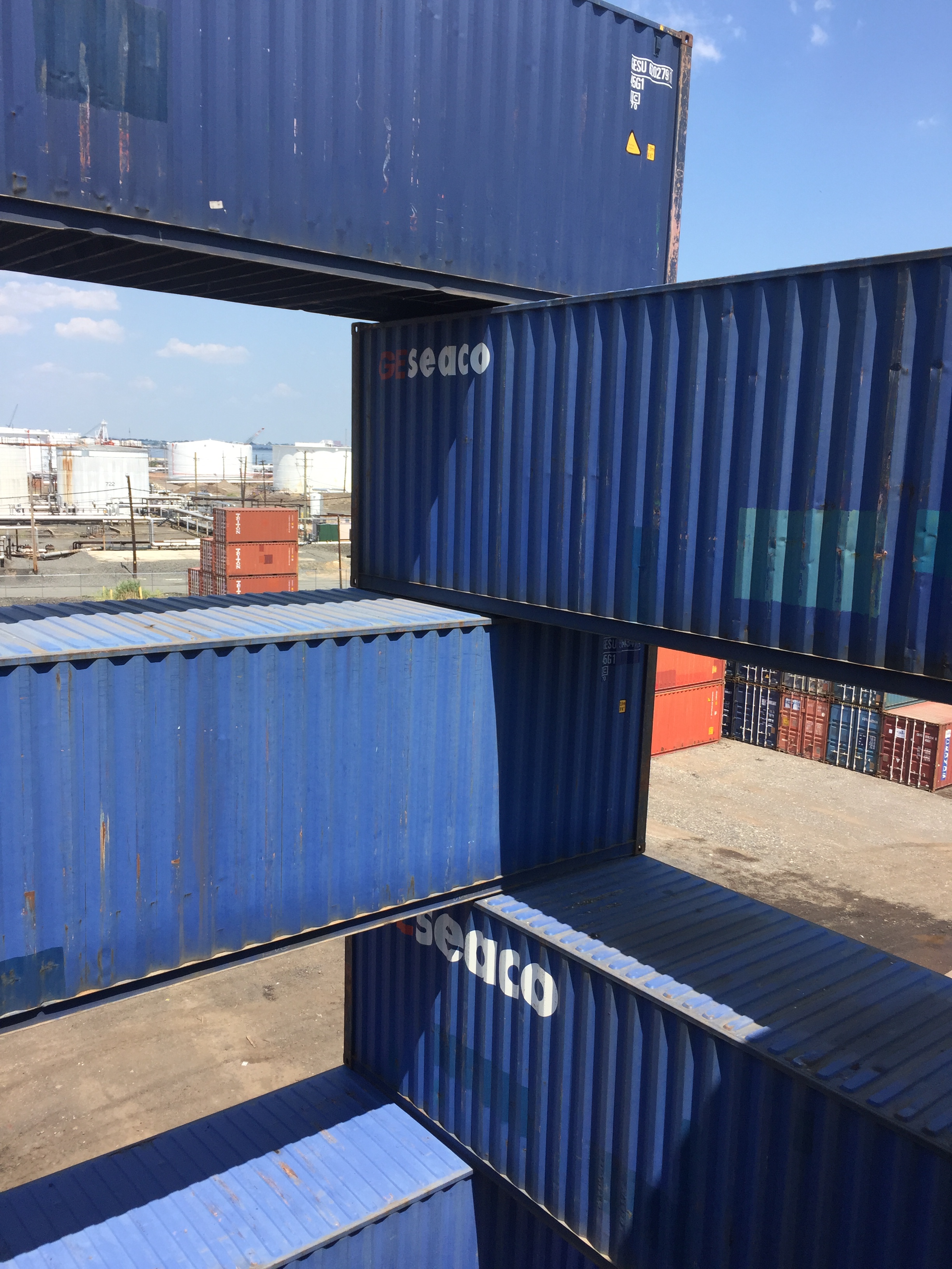 STACK 1 + 2 were installed in New Jersey in two days, simply using the ability of the forklift operator - thank you Steve Biko! - to place containers on top of each other with precision and without any additional securing hardware. We tested a square and a triangular stack with the intention of creating space - container stacks are generally very compact for efficiency