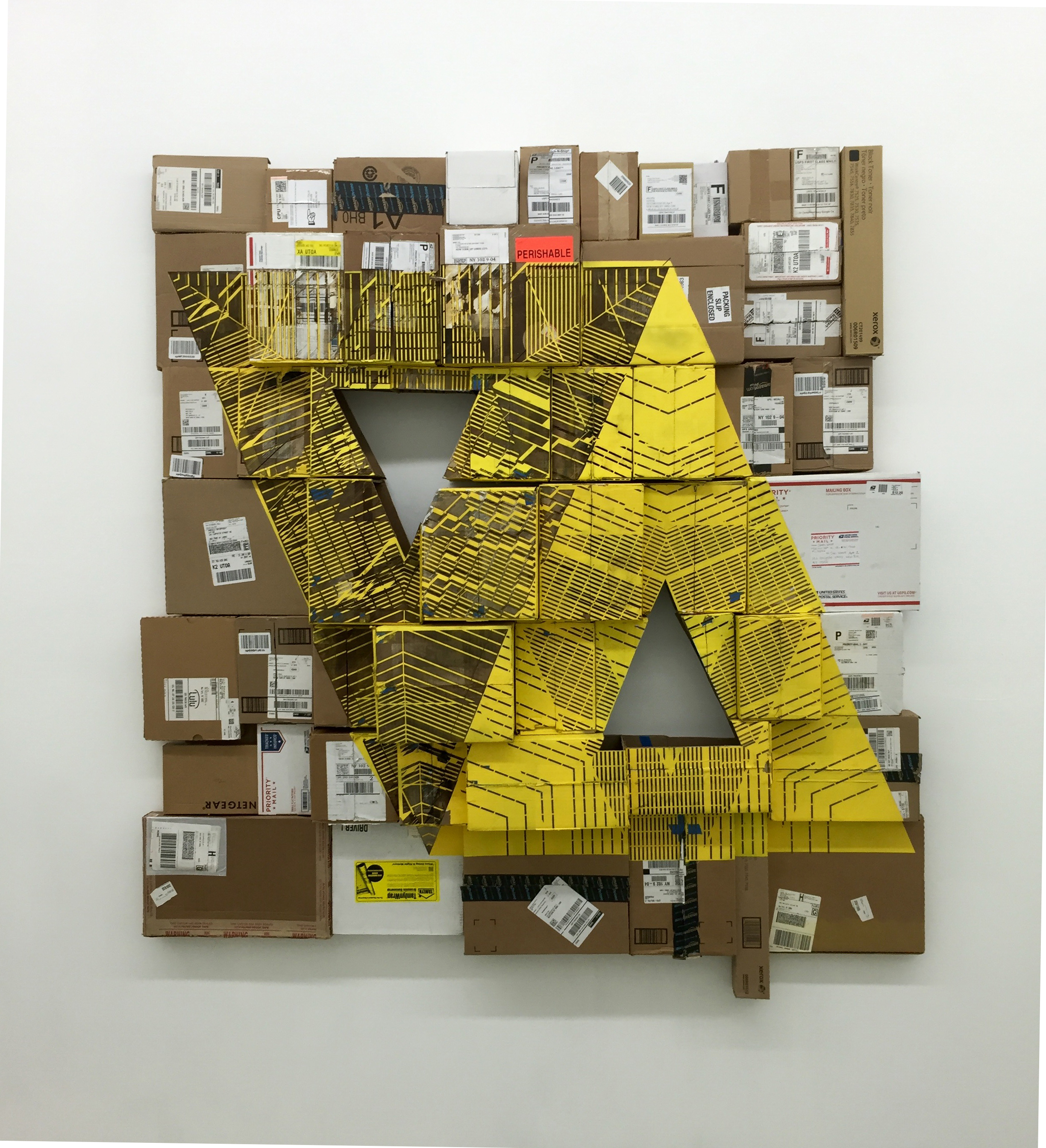 an installation of drawings on flattened, assembled, spray-painted and laser cut cardboard boxes