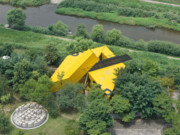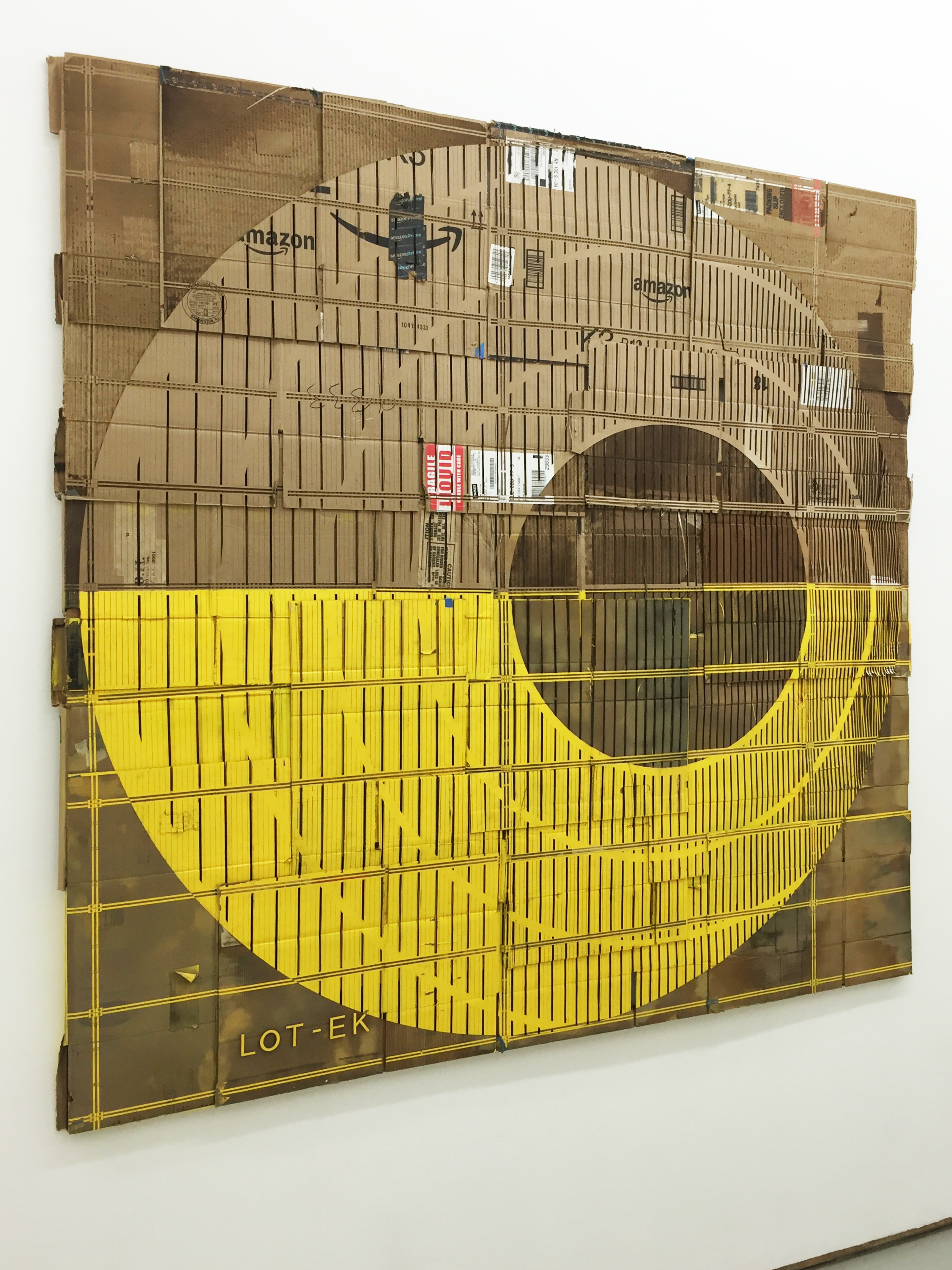 a series of drawings, laser-cut on used, flattened, folded, or stacked cardboard boxes - we leave each box as is, with its layer of tape, stickers and labels. We add a new layer of yellow paint, and then we cut, or rather, burn, meticulous laser-cutting the cardboard surface / an UrbanScan Atlas, a photographic codex of our mapping of urban, infrastructural things, 'a kind of autobiography of LOT-EK way of seeing', in the words of gallerist and curator Todd Alden / 56 UrbanScan Blocks, yellow legal pads, 50 images each (the amount of pages of a pad) from one UrbanScan category, one image only visible on the wall
