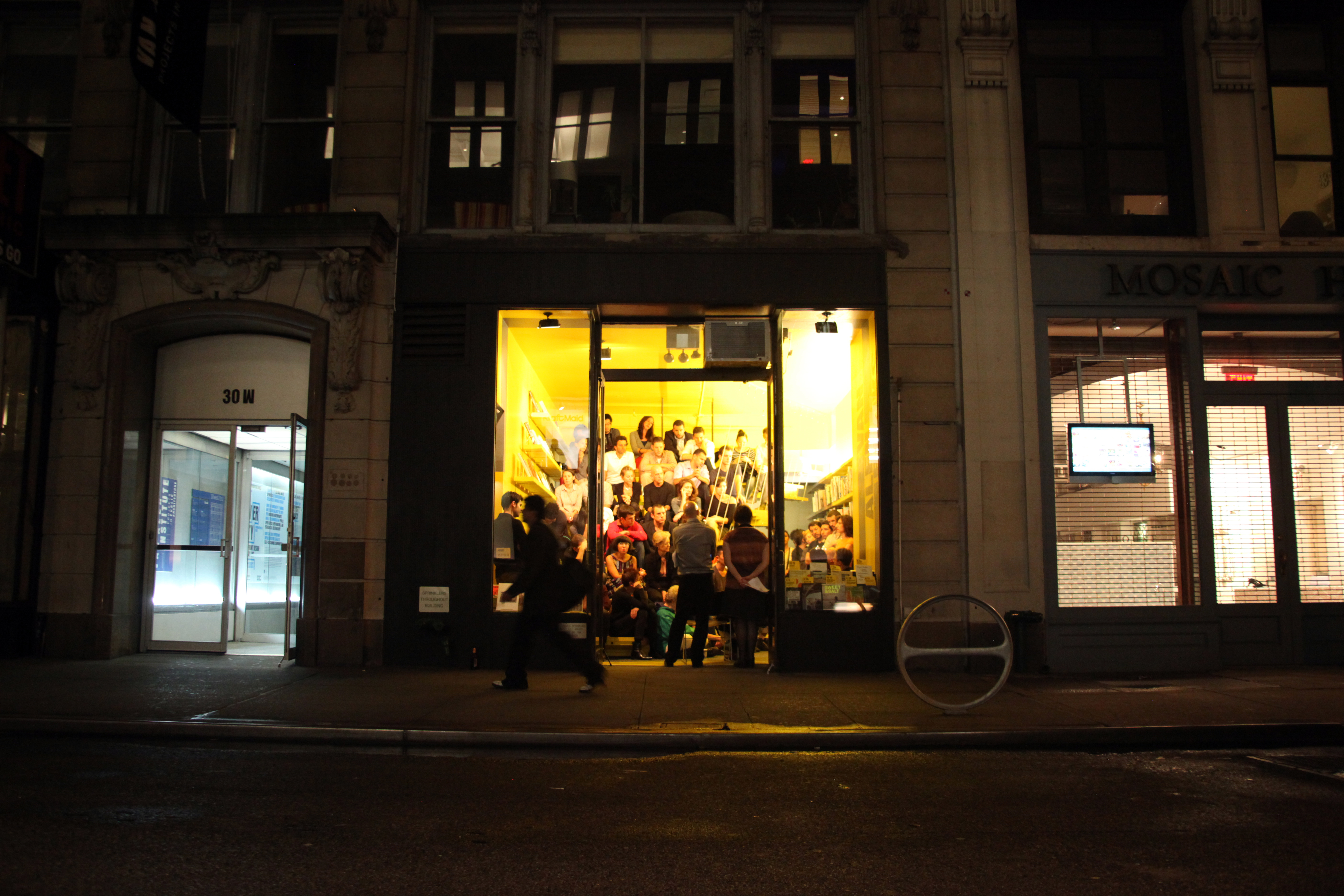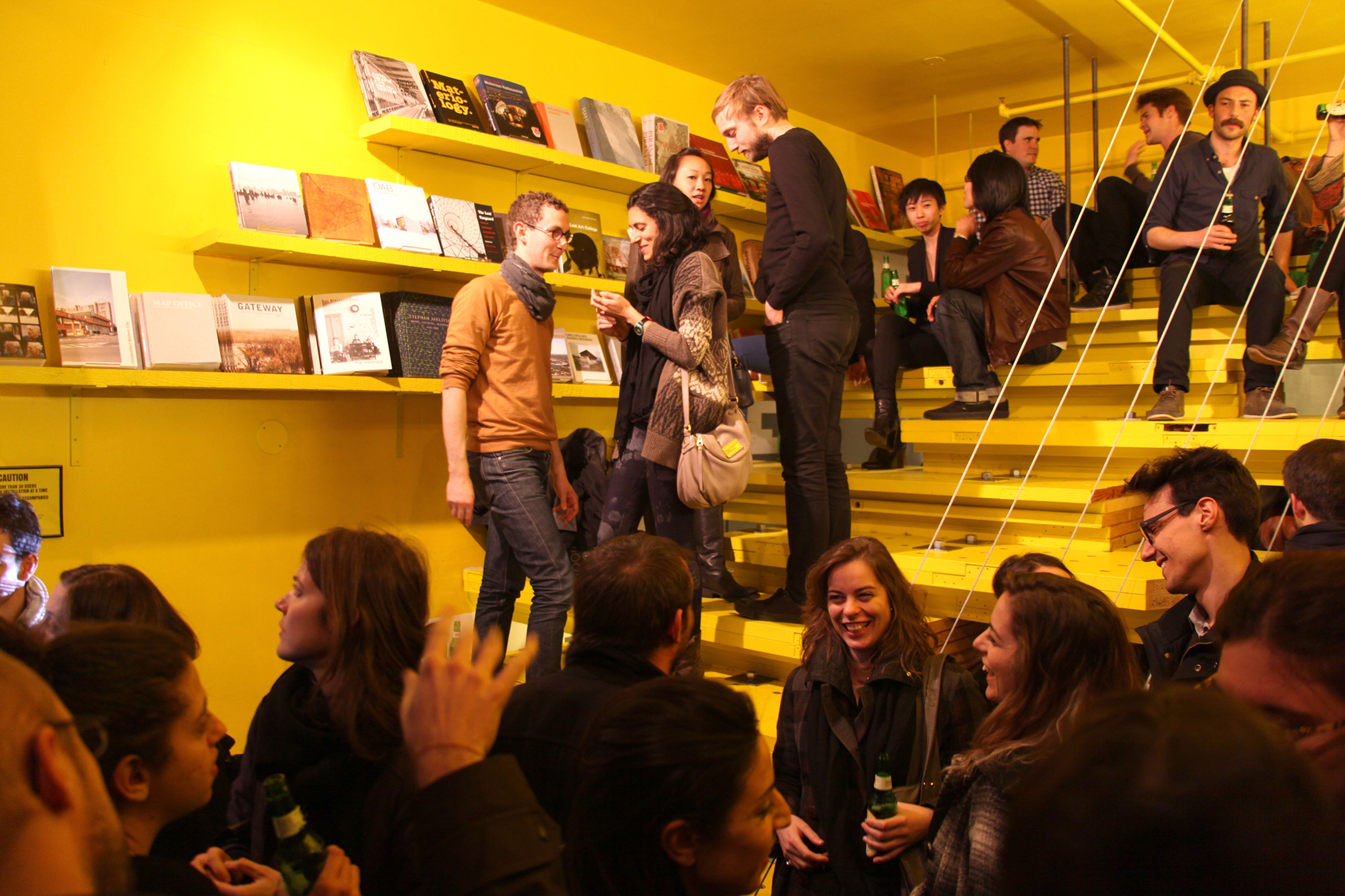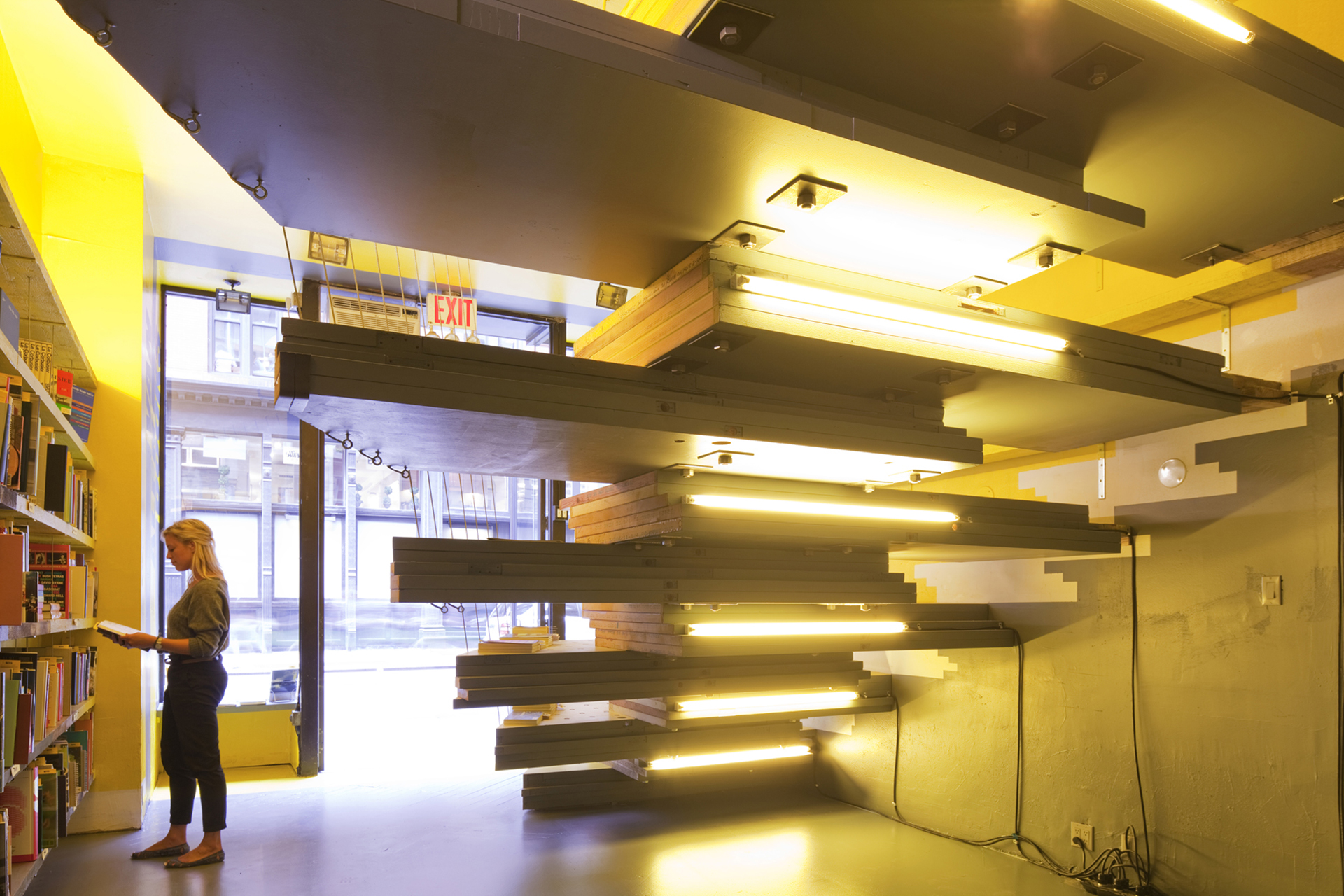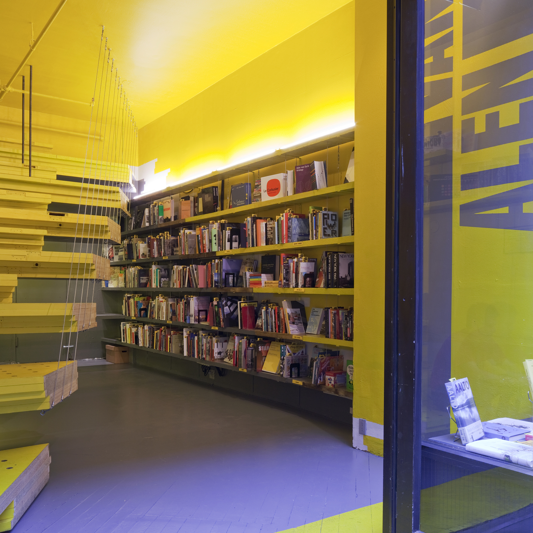 a new architecture and design bookstore and public reading room motivated by an urgent need for spaces where architecture books can be discovered and discussed, and by the equally urgent desire to engage with the street. The triangular installation splits the space in section creating a shared area for reading and conversation