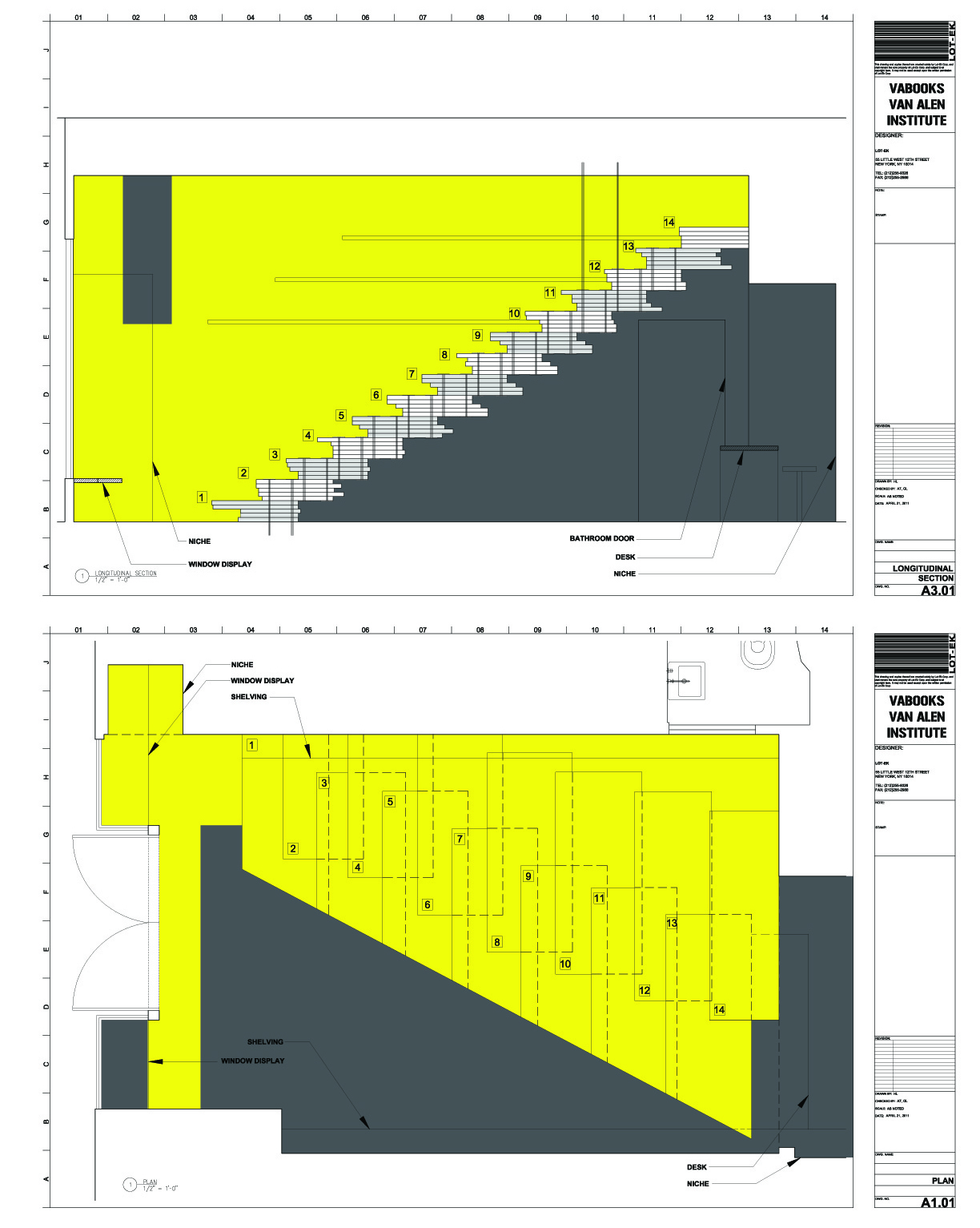 a 14-foot-tall seating platform crafted from a stack of 70 recycled doors ascends to create an amphitheater overlooking 22nd Street through glazed storefront windows