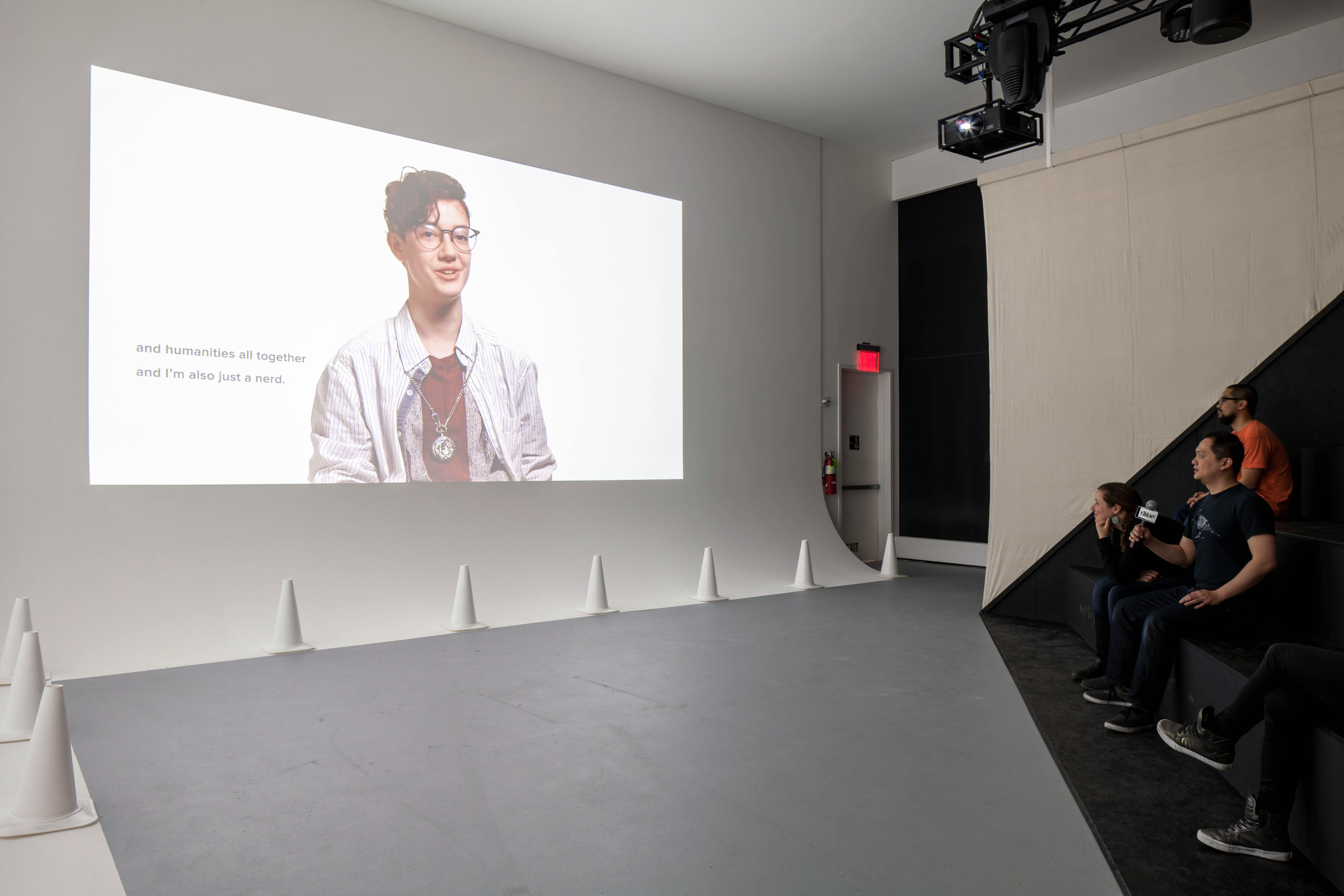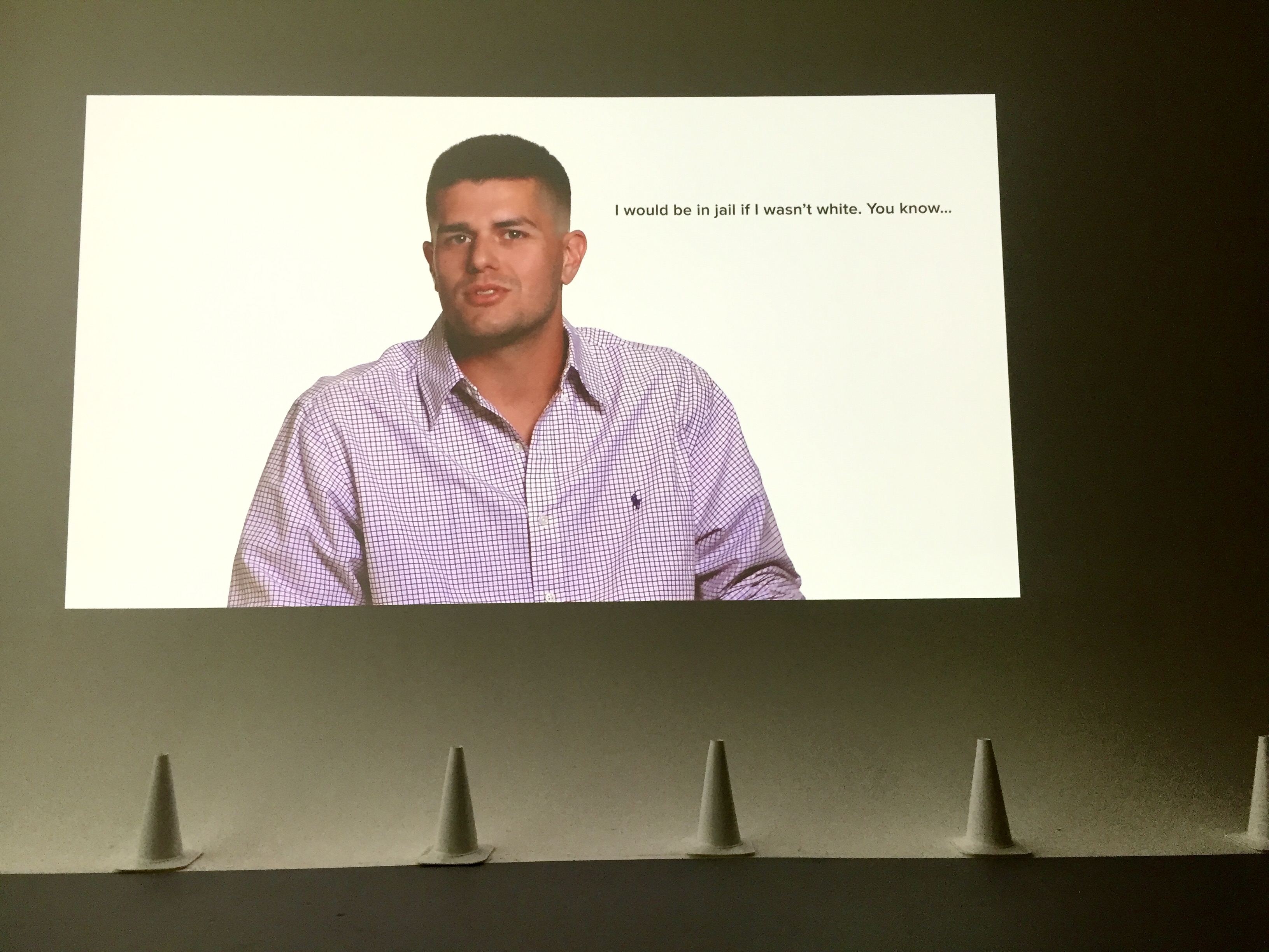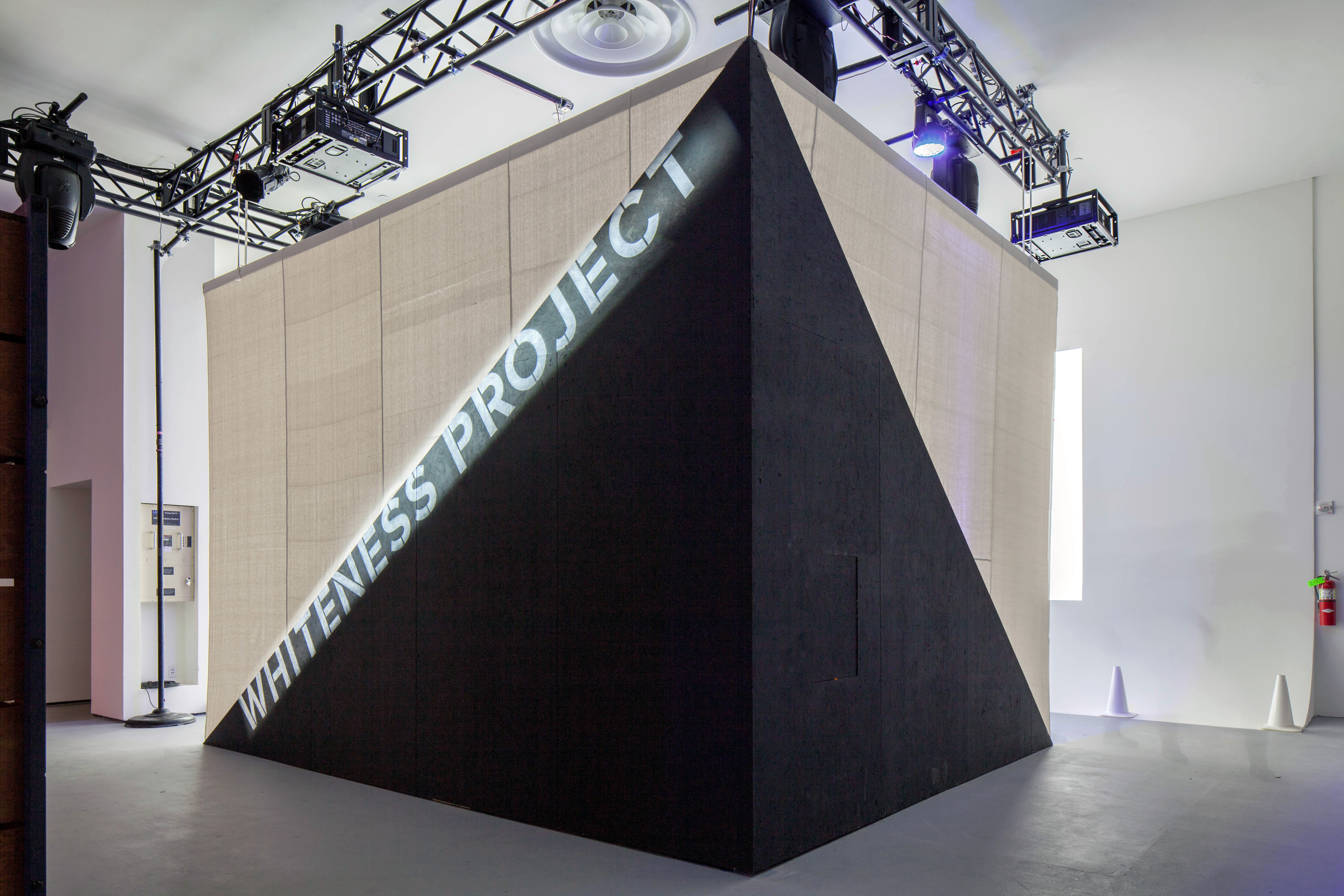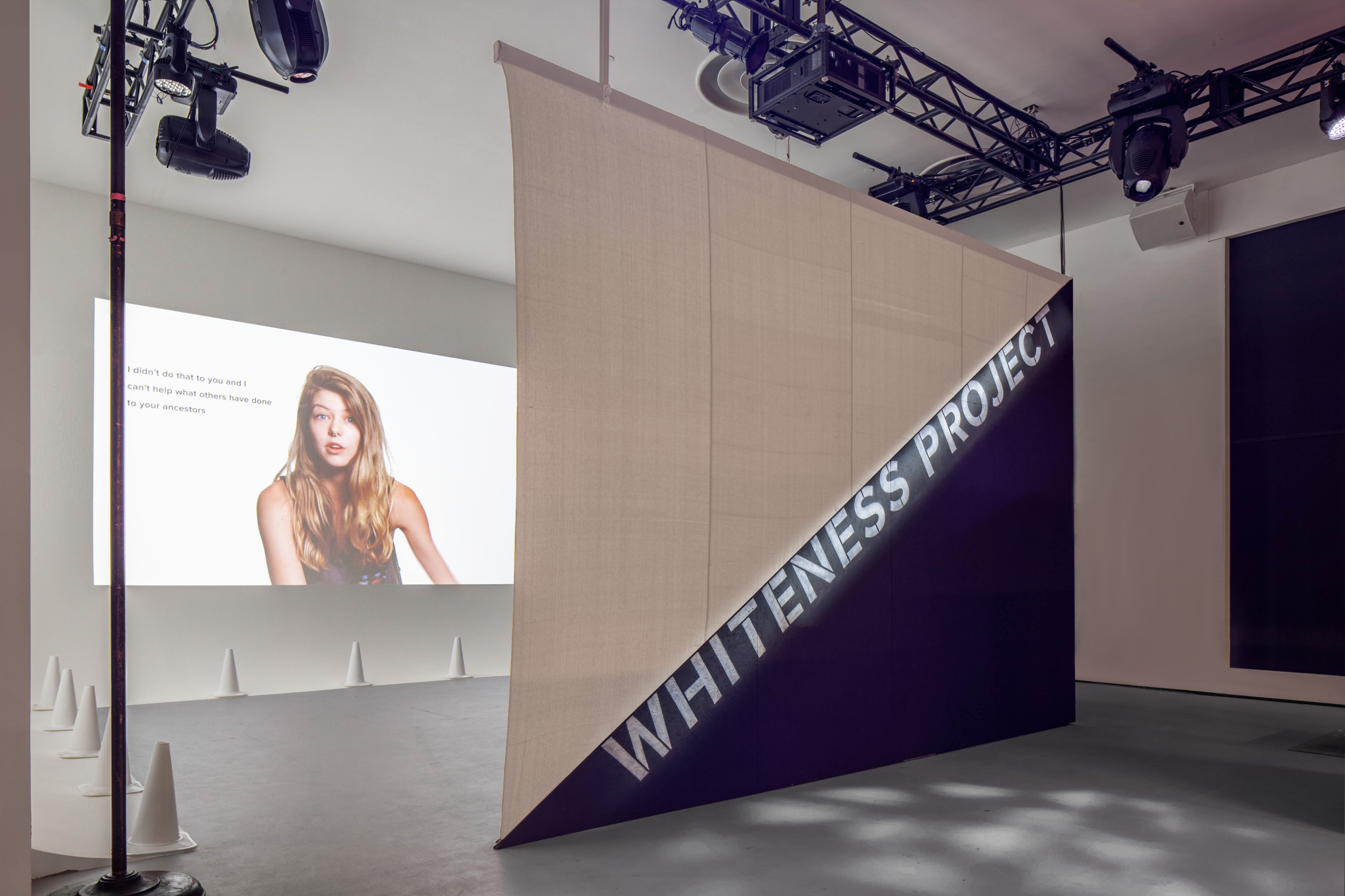 a black plywood triangular bleacher is the hard base to anchor the upper soft enclosure, made out of two large white canvases stretched between ceiling and seating. Two large projections, displaying the millennial interviews on one screen and general data on ‘whiteness’ as well as viewers feedback on the second screen, face the stepped communal seating. An array of overhead speakers projects sound directly onto the viewers animating the seating area with the millennial voices.